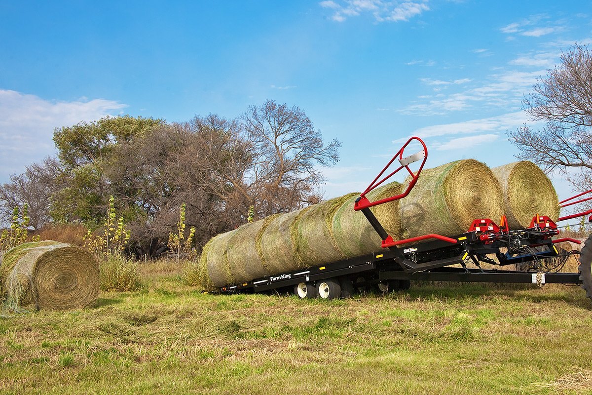 The right size and the right features The 1450 round bale carrier can carry seven 5' by 6' bales weighing up to 900 kg (2,000 lb) each in a single row. The double wide Farm King 2450 has twice the capacity. Ideal for hilly terrain the shorter, more maneuverable 2400 can carry ten 4' x 6' round bales. Heavy-duty construction means the bale carriers are robust, yet designed to load and unload bales quickly and without damage. Lower bale handling costs and simple maintenance help improve the profitability of your hay.
