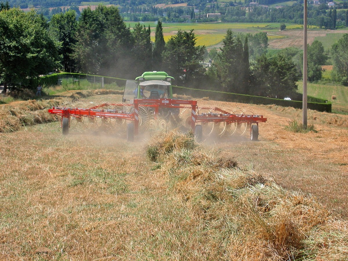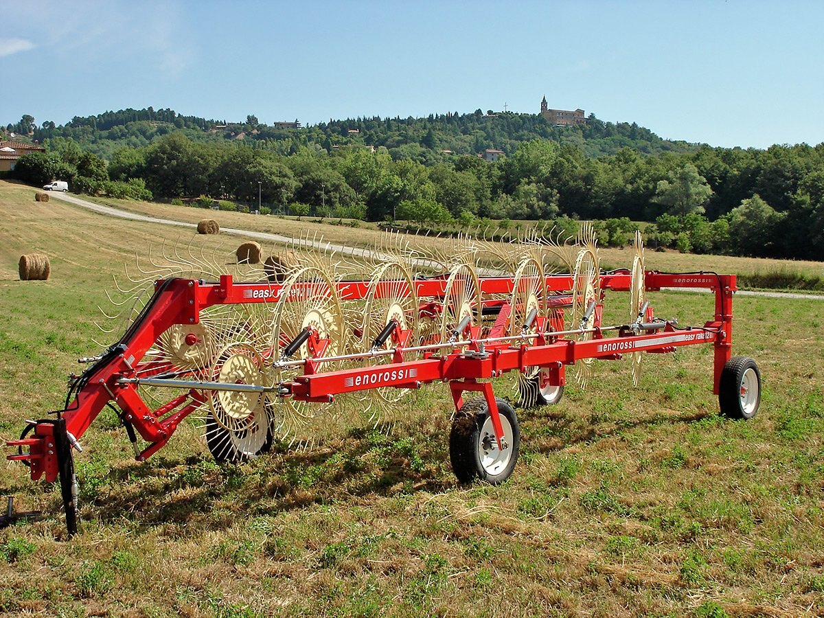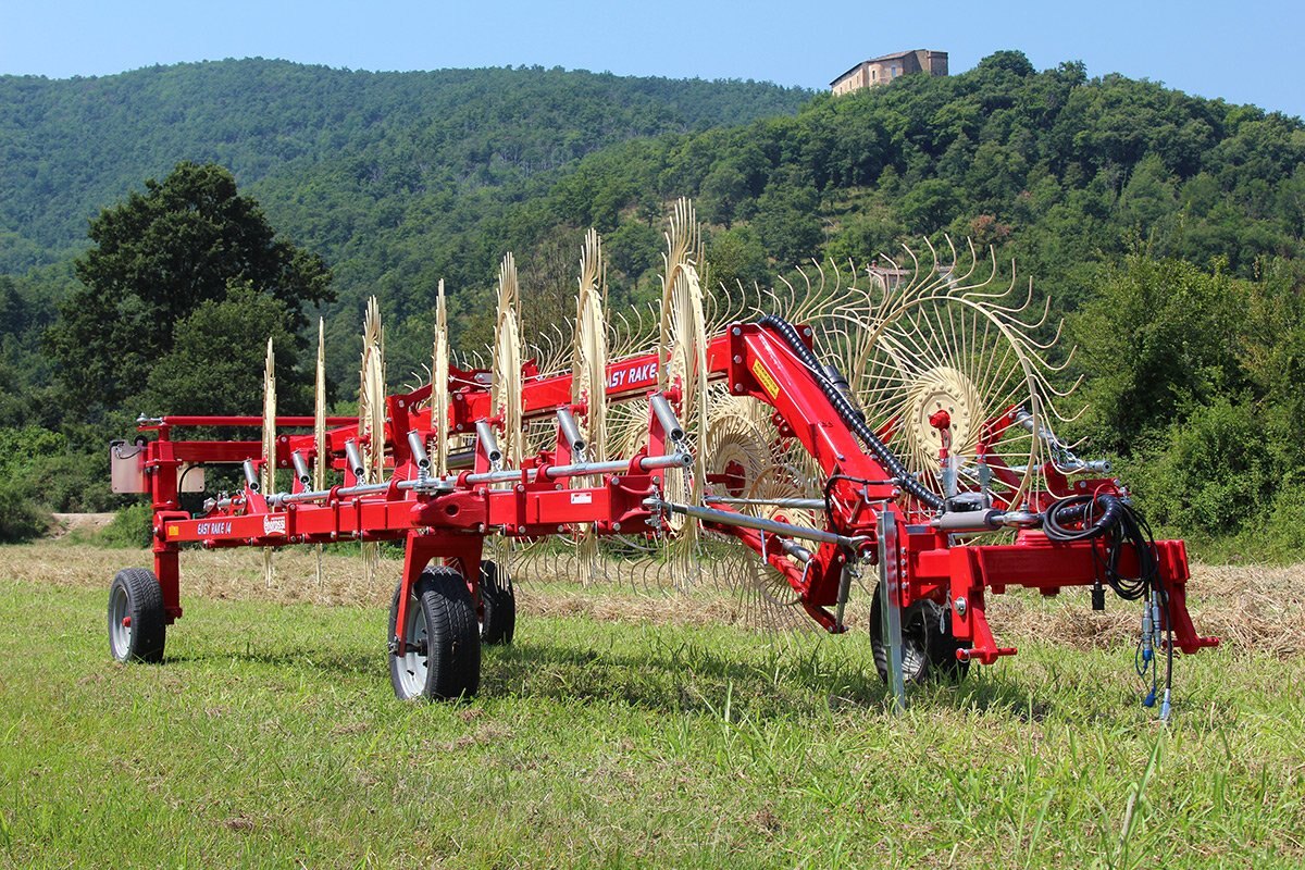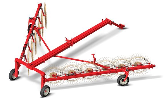 The Farm King Easy Rake comes available with 10, 12 and 14 rake wheel configurations and working widths of 21, 24 and 27 respectively. Each rake wheel comes with a fully independent suspension spring and bounce adjustment chain. The adjustable chain prevents the rake wheels from gouging uneven field terrain but allow the wheels to stay closely conformed to the field surface.