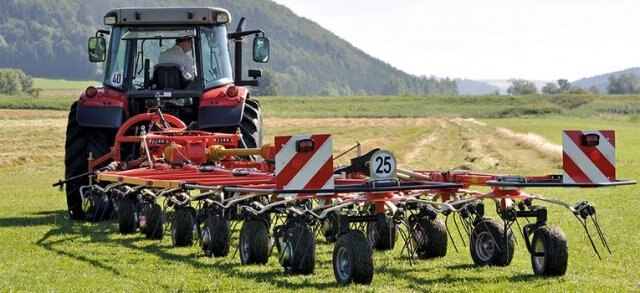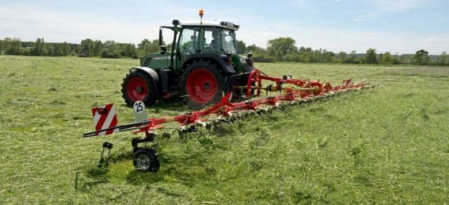 NEW DIMENSION IN TERMS OF AREA OUTPUTWith their TH 1550 Hydro and TH 1800 Hydro, FELLA offer two trailed hay tedders which stand out from other machines due to their enormous working width. Attachment on these models is via the lower links. Despite their working width of 15 metres or 17.5 metres, these two models are very agile, which allows them to also be used cost-effectively on smaller areas of land. Area output and work quality which speak for themselves – first-rate forage quality.PERFECT WORKING CONDITIONSAs with all FELLA hay tedders, the forage is picked up by the tines and turned gently without suffering damage. A light, loose and well mixed mat of forage is created, representing top-quality forage material. Because of the spreading angle adjustment system, you can also always optimally adapt your machine to the harvesting situation, whatever it is.You can quite conveniently – directly from the tractor seat – use the hydraulic system to infinitely adjust the working height to changing working conditions. By using the two height-adjustable contact wheels, perfect ground adaptation of the machine is always ensured, which also reliably prevents your high quality forage from being contaminated. Due to the low centre of gravity and the additional mechanical locking of both centre axles, the machine is reliably prevented from slipping out of position during work on sloping ground. CONVENIENCE OF OPERATION WHICH SPEAKS FOR ITSELFThe switchover from working position to transport position is performed synchronously via a hydraulic sequential control system, and conveniently from the tractor seat when the tractor is standing still. Because of the raised horizontal position of the tines, they are prevented from sinking into the ground and unintentionally collecting up forage during the switchover.At a glance: