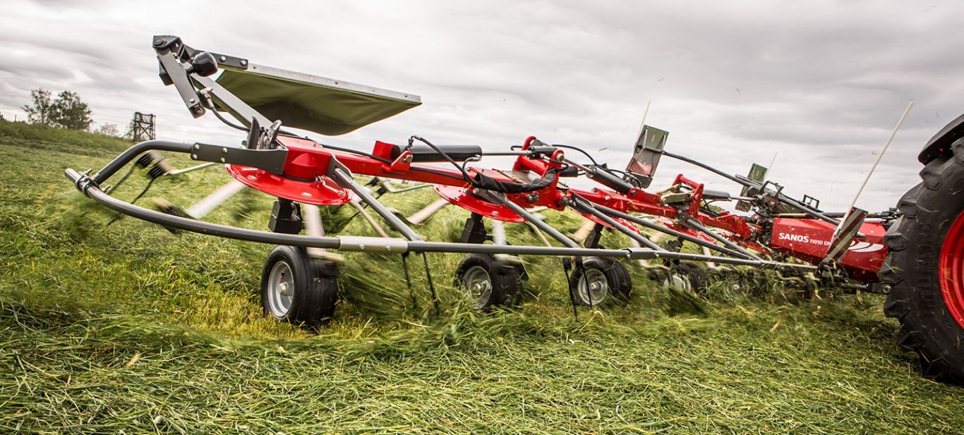 The rotors are easily folded in and out hydraulically in a synchronised operation directly from the tractor seat. Thanks to the synchronised lifting facility, safe operation is also possible when working on hillsides.