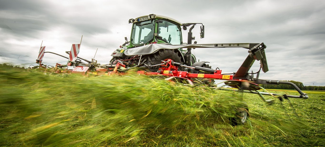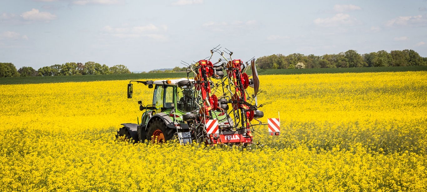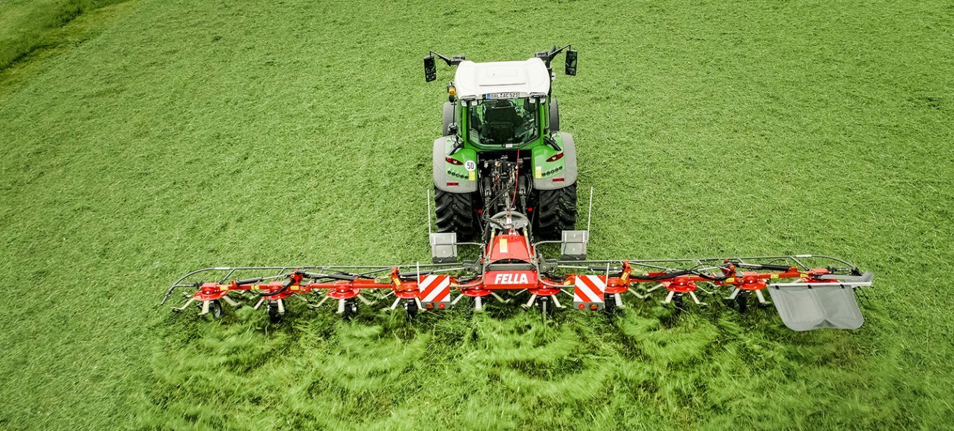 With its new large-scale tedder, FELLA is now also bringing maximum power to the field in the three-point segment. With working widths of almost 11 metres, patented technologies such as the traction/compression system and the low-lying towing point play to their strengths and guarantee a high throughput at optimum forage quality. The newly designed swing brake adjusted to the size and the short attachment ensure even greater safety and convenience on any terrain. |