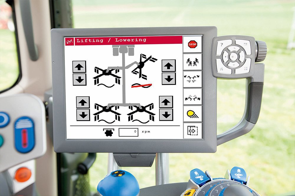 All functions, such as single lift, raking height adjustment and automatic folding into the transport position, can be operated from the tractor using the ISOBUS control system and can be programmed according to the user's needs using the control lever or a separate operating joystick. |