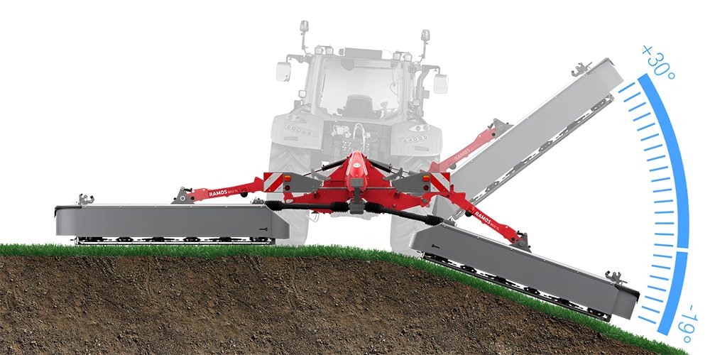 TLX mowers to achieve a wide working angle of between +30° and -19°. This optimally compensates for unevenness and height differences in the ground. An integrated compensating cylinder also prevents rocking at the headland and allows for a large ground clearance. |