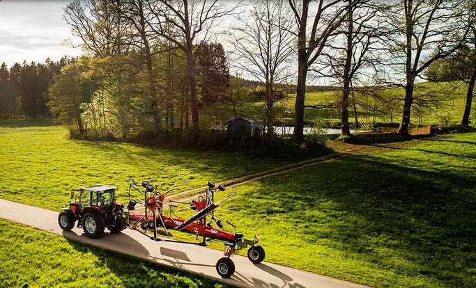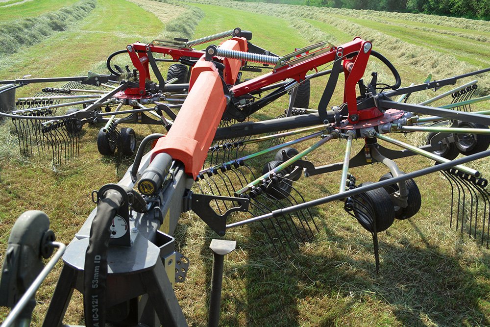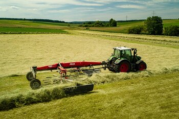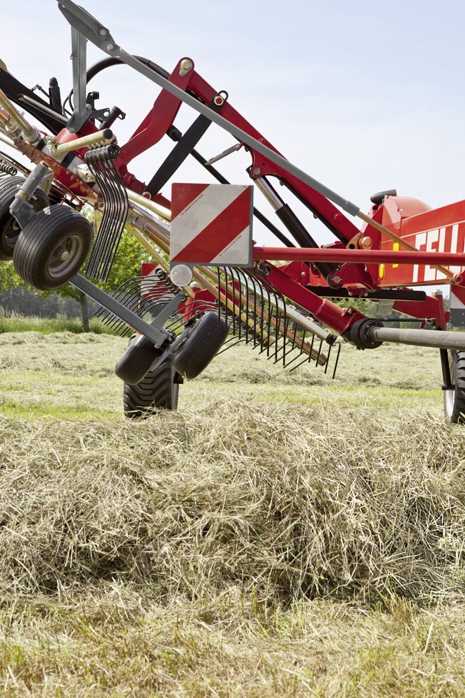 Work quickly When driving over swaths, the rake maintains its low centre of gravity. It therefore enables safe turning and fast work. |