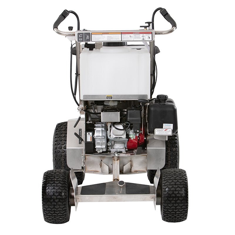 Stainless steel resists corrosion from the granular and liquid chemicals distributed by the unit.