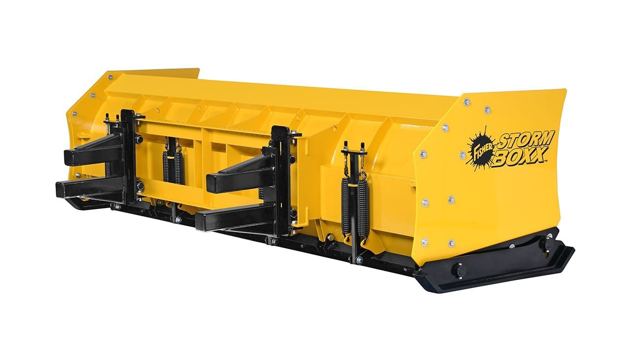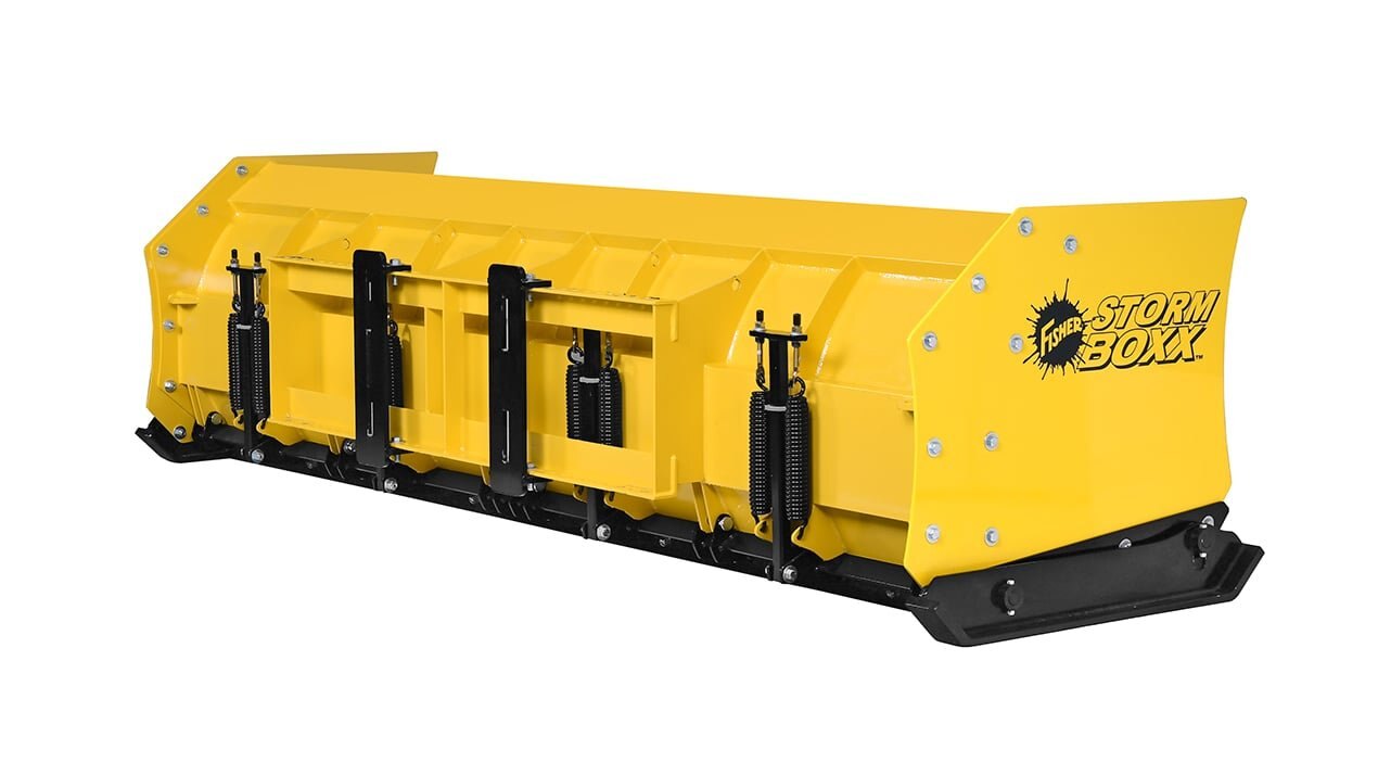 The FISHER® 12′, 14′ and 16′ STORM BOXX™ pusher box plows feature a two-piece, steel trip-edge design that delivers a cleaner scrape for hard-packed snow and ice—all while protecting operators and their equipment when encountering hidden obstacles. The containment plows attach quickly and easily to backhoes, wheel loaders or tractors by using bolt-on, interchangeable attachment plates. The STORM BOXX box plow goes the distance. |