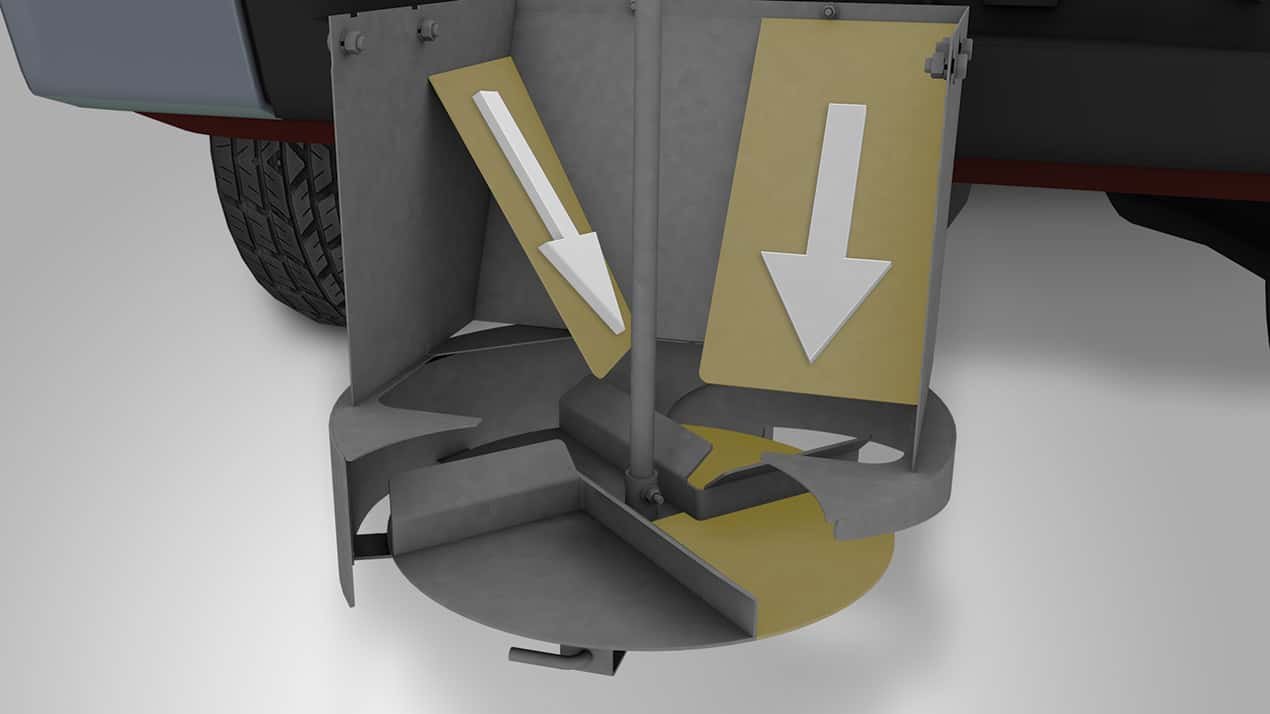 Baffles within the chute deliver a consistent spread pattern that reduces material waste. By directing material to precise points on the spinner, it helps to cast it away from the truck rather than onto the back of your bumper. |