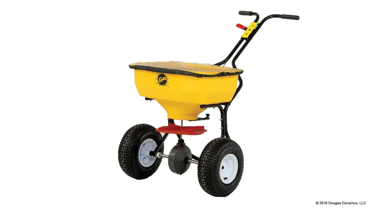 Each walk-behind spreader includes a stretch-fit cover that keeps material dry and provides visibility of spreader contents. |