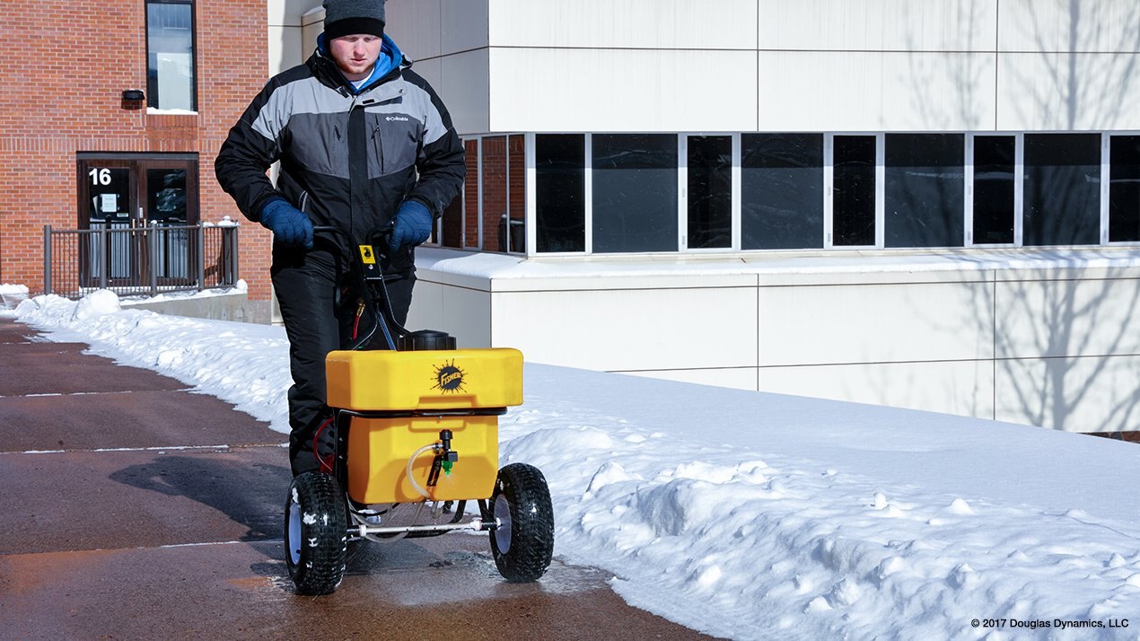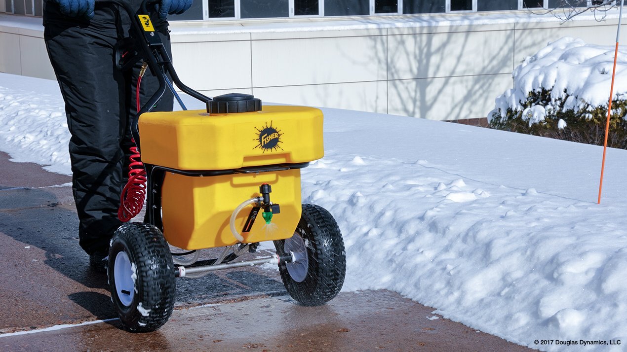Pretreating surfaces with liquid anti-icer before a storm helps prevent ice from bonding to the pavement, and makes it easy to scrape clean once the storm has passed. The FISHER® SS-120 walk-behind liquid sprayer gives you battery-powered convenience and a heavy-duty spray wand for stairs and other places where granular deicers are ineffective, such as curbs and steps. With pretreating, you can use less salt, save time and deliver exceptional results. |