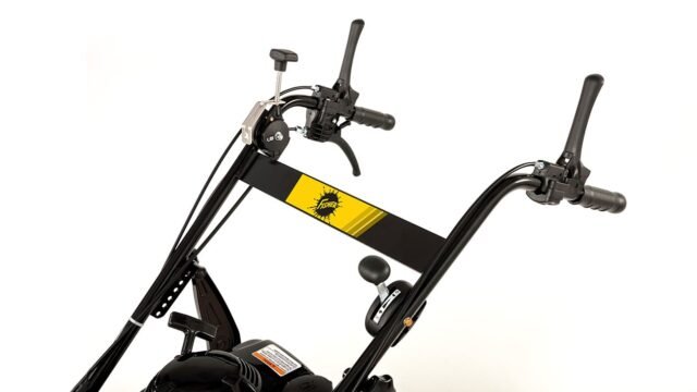Seven-position handlebar height adjustment for operator comfort. |