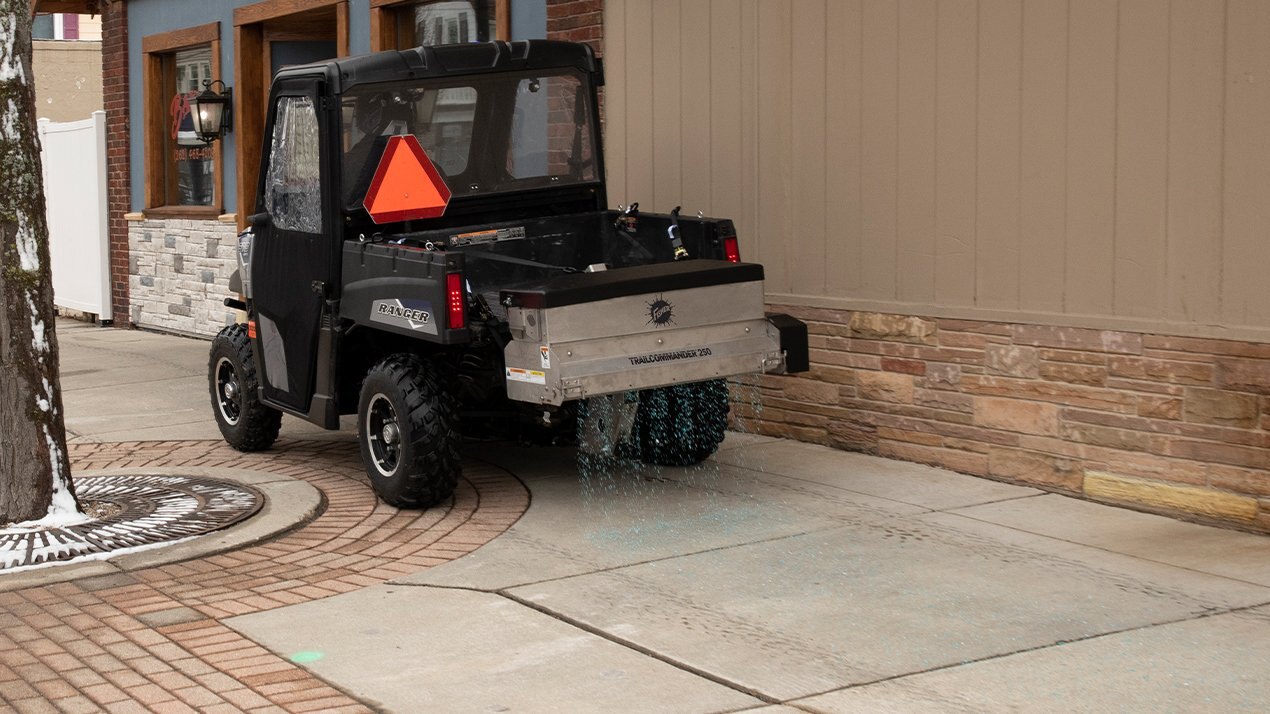 Command your ice control efforts with the new line of FISHER® stainless steel drop spreaders. The TRAILCOMMANDER™ 250 and TRAILCOMMANDER™ 600 provide up to 36″ of spread width in a drop pattern so the salt stays exactly where your vehicle drives, protecting turf and sensitive surfaces bordering the paved area. And with three mounting systems, these units can fit on most UTVs, compact tractors, or wheel loaders to make quick work of sidewalks, walking paths, and other paved surfaces where truck equipment can’t easily gain access.