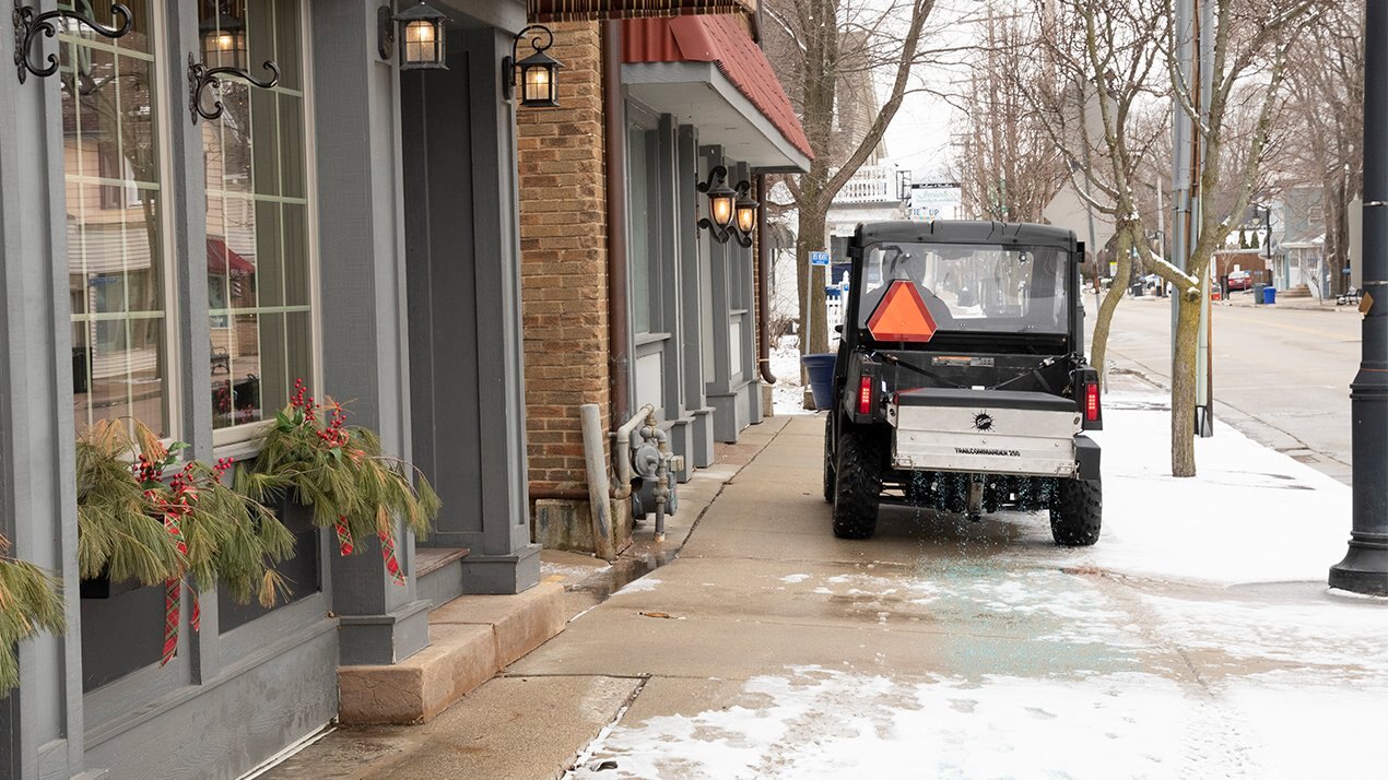Treat sidewalks and walking paths with one or two passes at a spread width of 36 inches. Easy to activate three inch baffles on either side of the trough limit spread width to 33” or 30” to limit damage to sensitive surfaces on either side of the path.