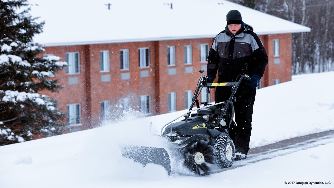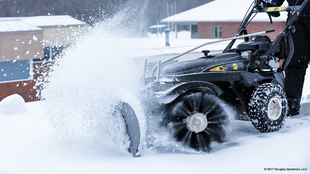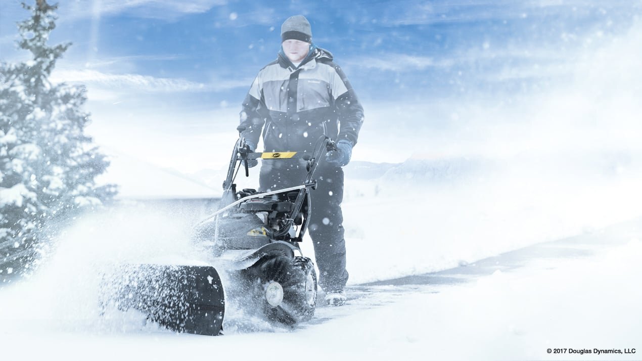 Quick-attach plow blade features wheels and floating design to move heavy or deep snow. |