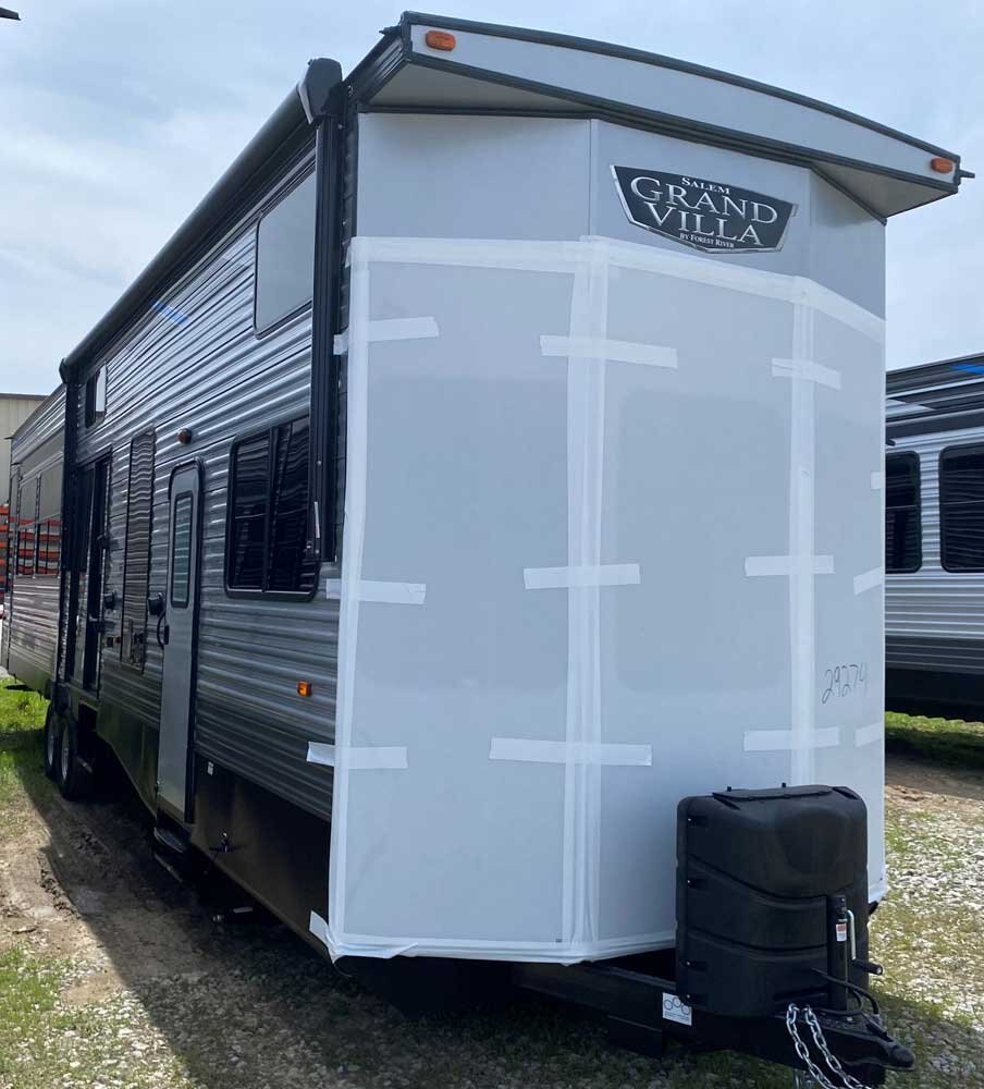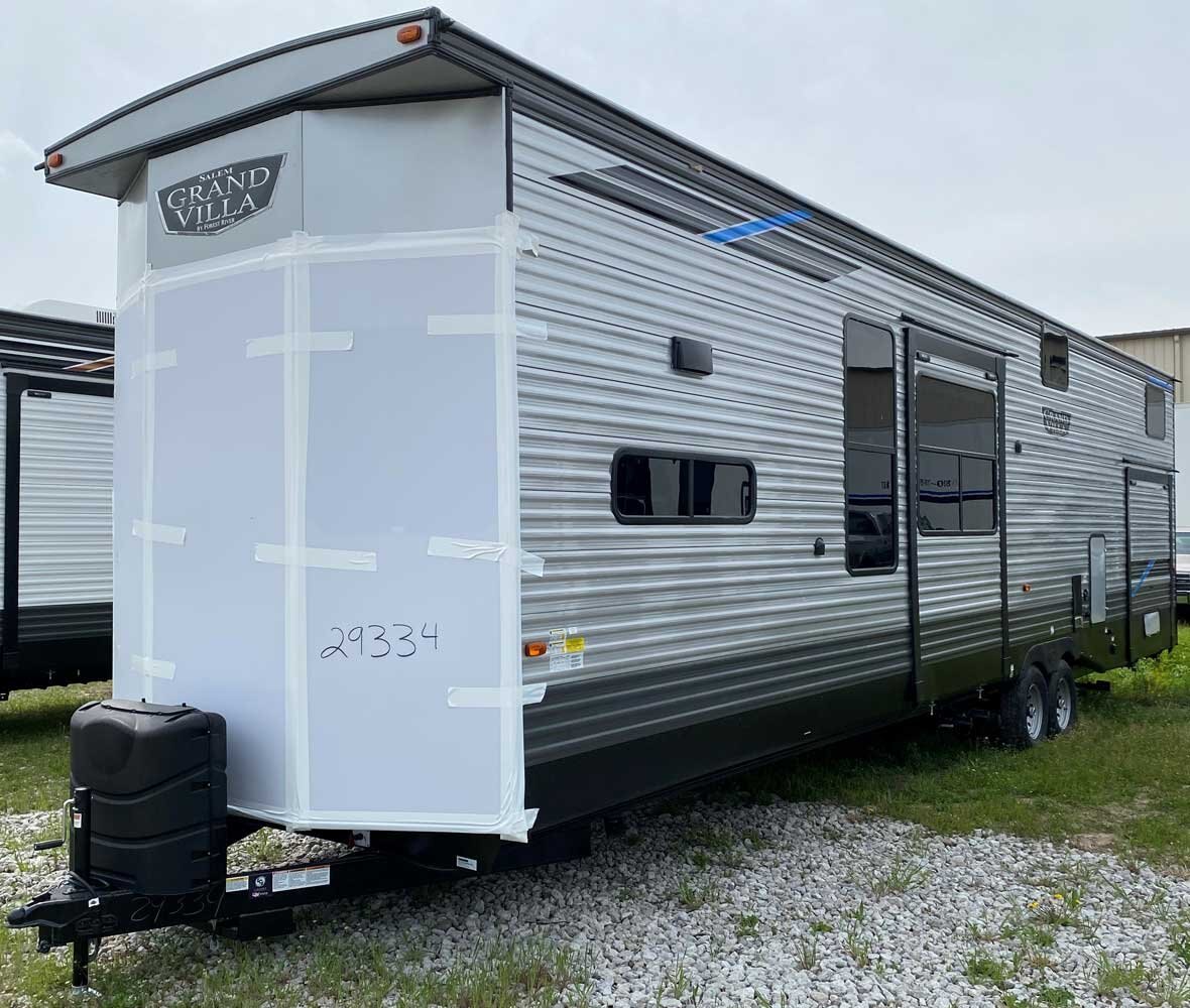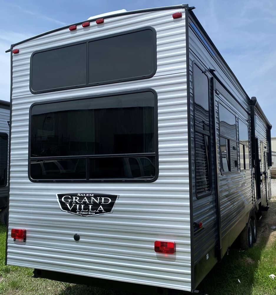 The Salem Grand Villa 42DL is another fantastic double loft destination trailer. In addition to the HUGE double loft bonus room for the kids, there is a front queen bedroom for the adults, plus additional sleep options in the living room. The bathroom includes a walk-in shower with a built-in seat, while the island kitchen provides residential appliances and plenty of room for all the cooking essentials.