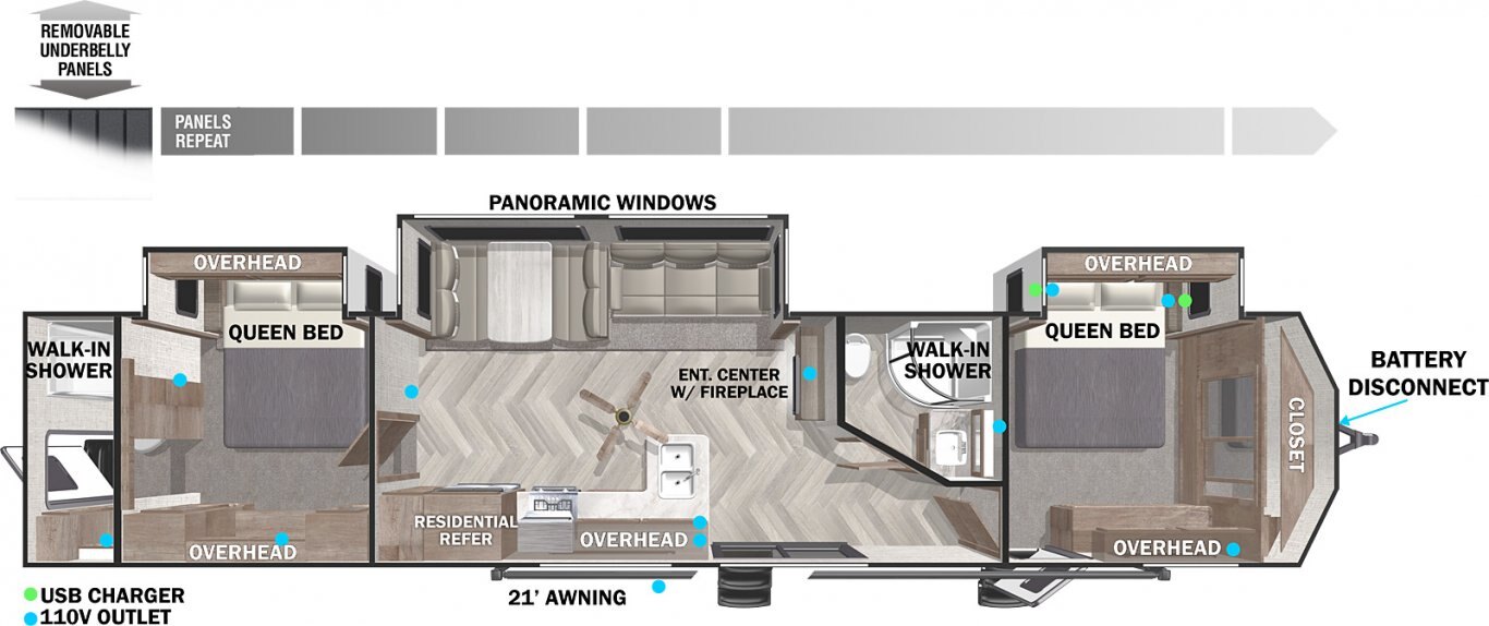 The 4002Q is an excellent floorplan with two bedrooms, three slides, and 1.5 baths. The panoramic windows provide great campsite views, while the kitchen and dining area are equipped with residential appliances and custom decorator touches. This is the perfect destination trailer for making memories!