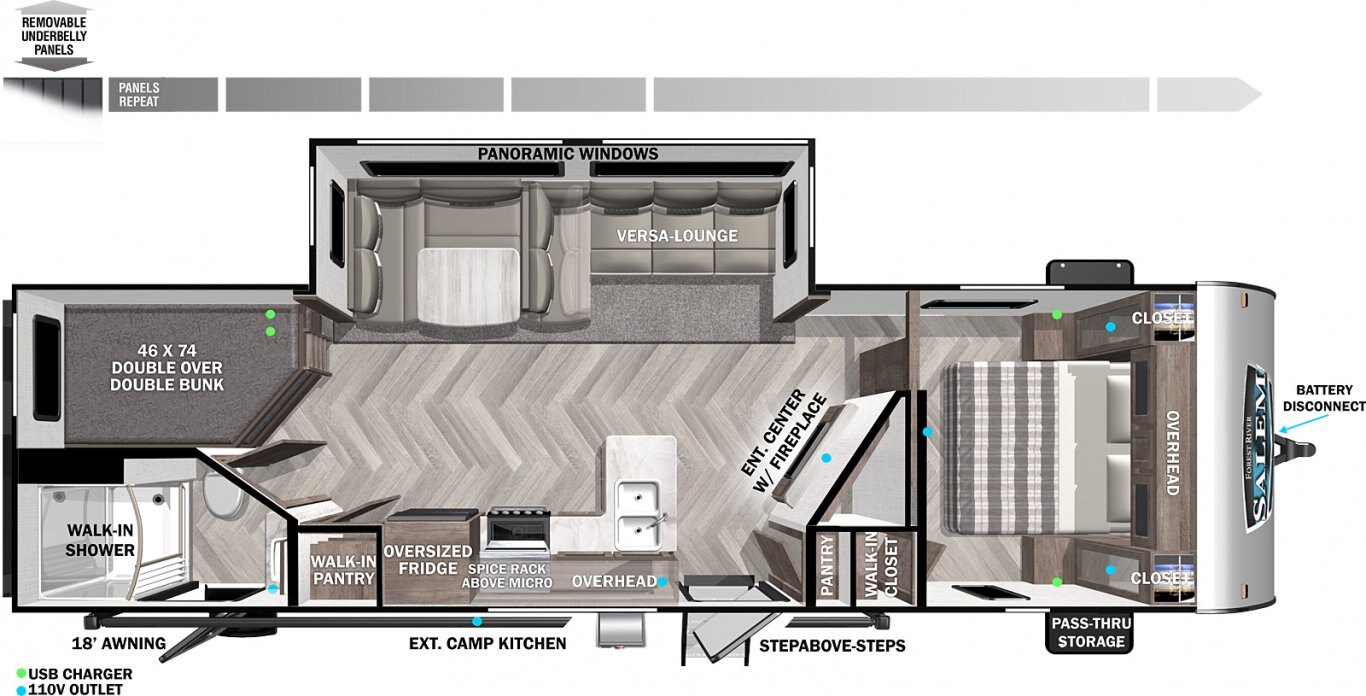 • 30” x 22” Egress Window Rear Wall on Double over Double Bunk Model