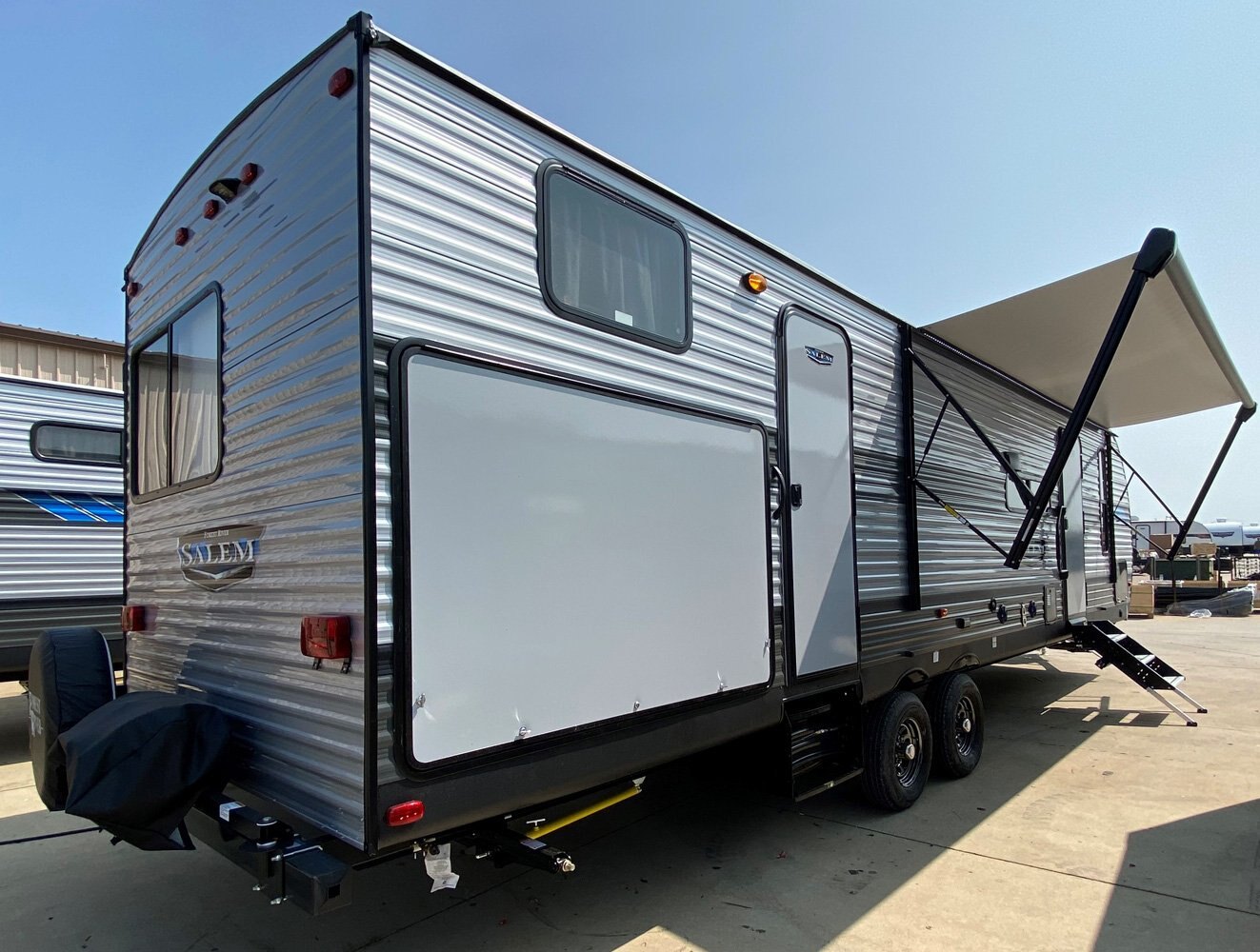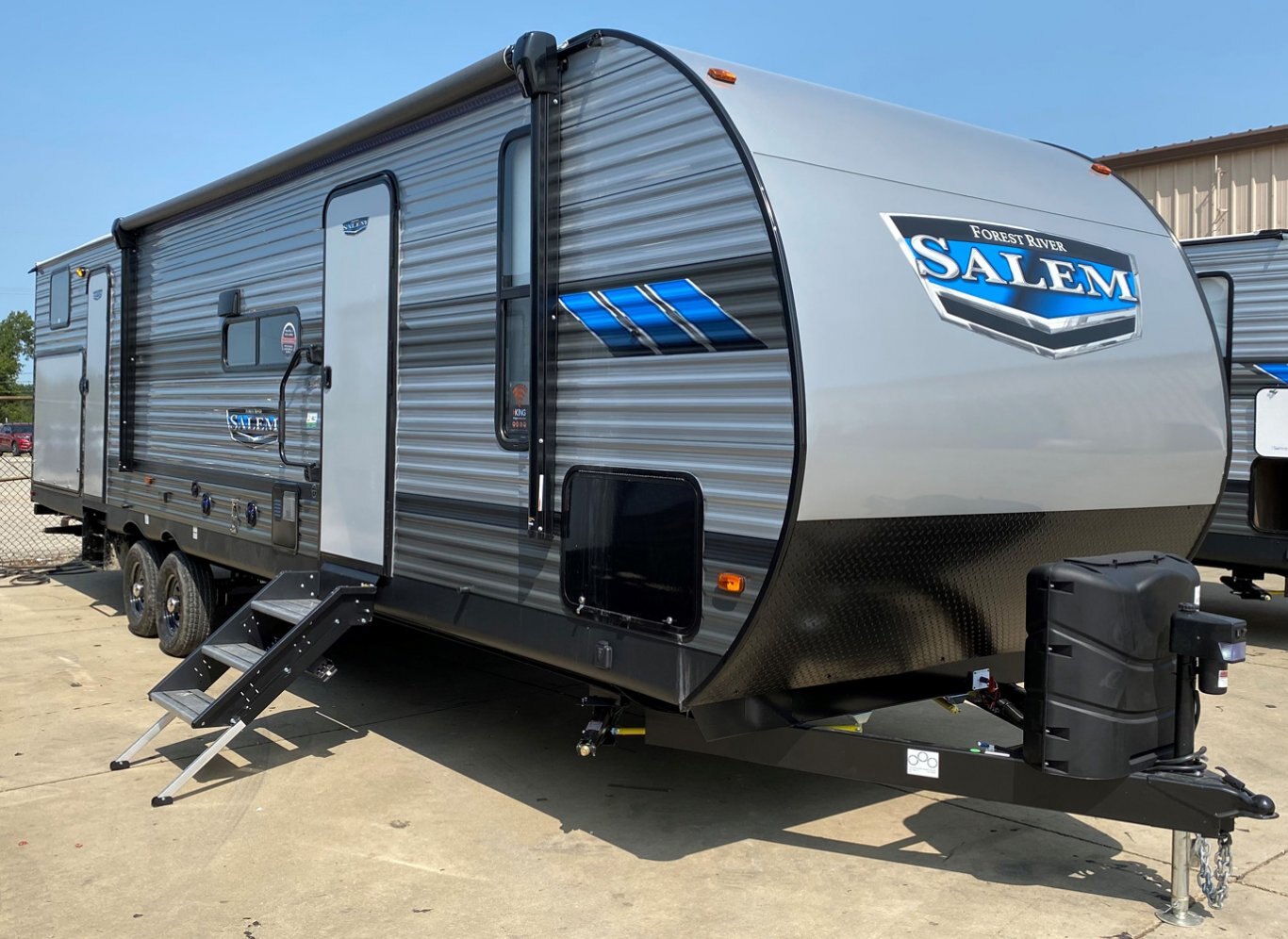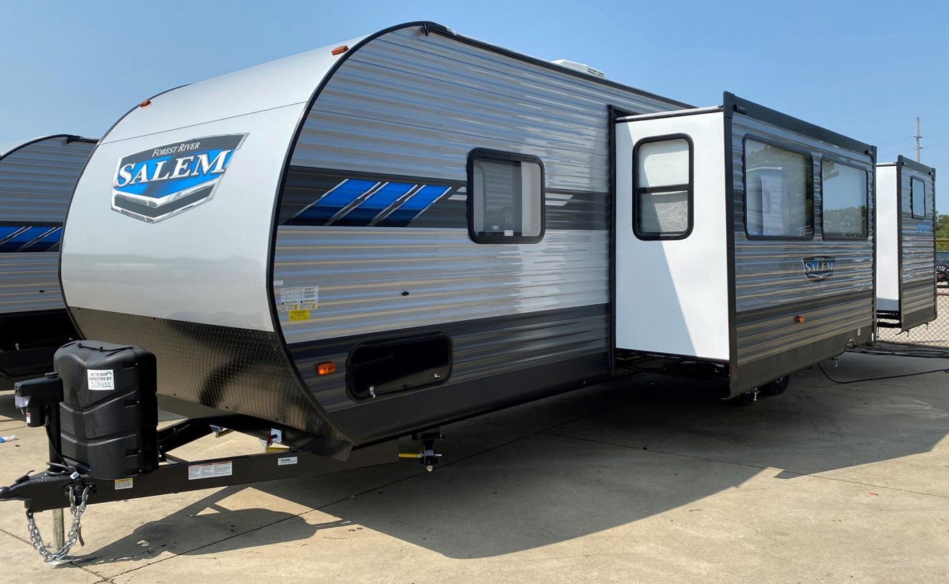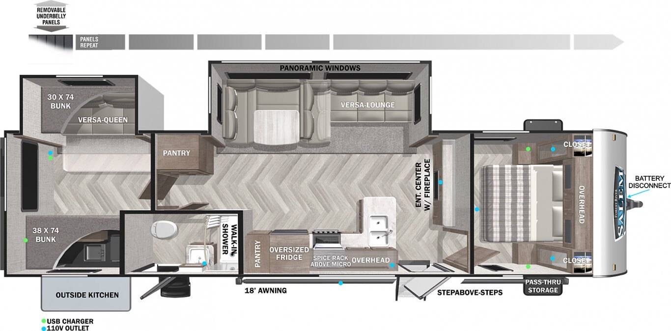 The 32BHDS is the ultimate bunkhouse, with two total slide outs and an outside kitchen. This well-equipped travel trailer features oversized panoramic windows, the ever-popular U-dinette, which you can customize with the adjacent Versa-Lounge. The kitchen includes a 11 CU. FT. refrigerator and stovetop with oven and LED accents, plus cabinets for all your cooking essentials!