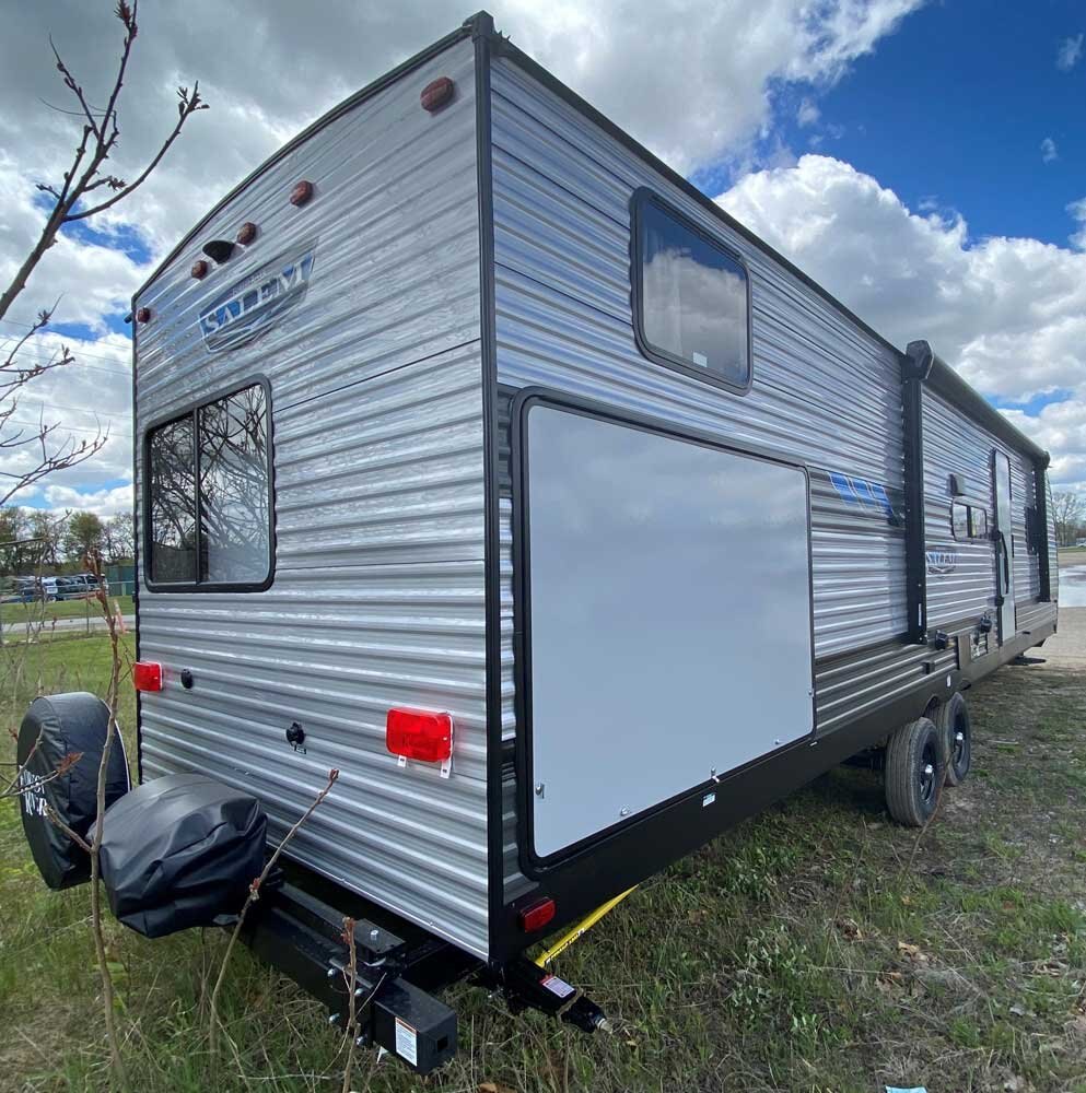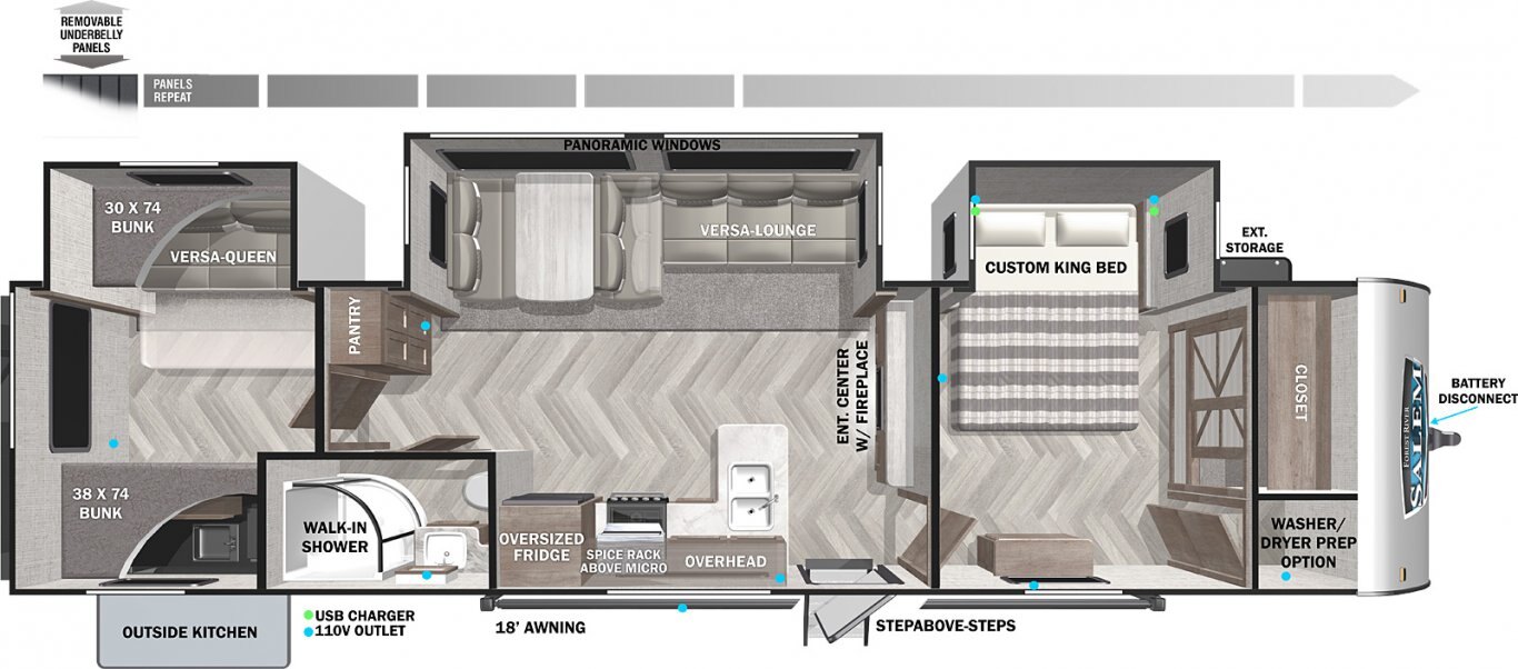The 33TS is the ultimate bunkhouse, with three total slide outs and an outside kitchen. This well-equipped travel trailer features oversized panoramic windows and the desirable Versa-Lounge. The back-bunk room features the Versa-Queen giving this floorplan the option for two queen beds!