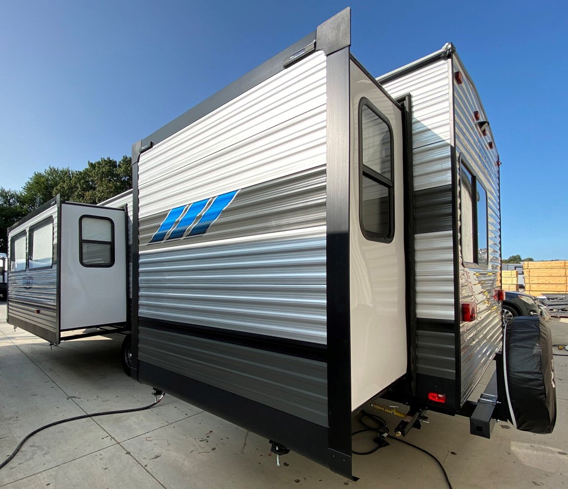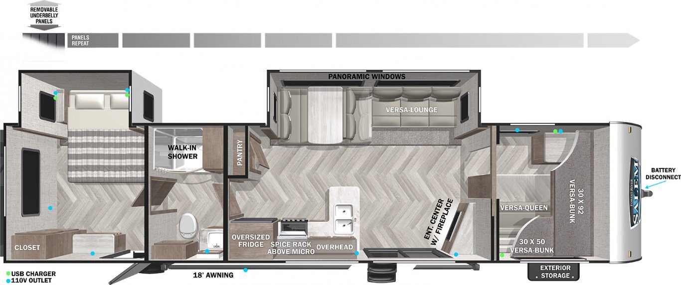 The 36VBDS is a unique, versatile bunkhouse that offers ample sleeping options so you can bring everyone camping! The front bedroom offers both the Versa-Queen and Versa-bunks, while the rear bedroom provides a queen bed, dresser, and closet. The living area features the fantastic Versa-Lounge with panoramic windows for great campsite views. Do not forget about the Stow N Go Storage conveniently below the Versa-Lounge.