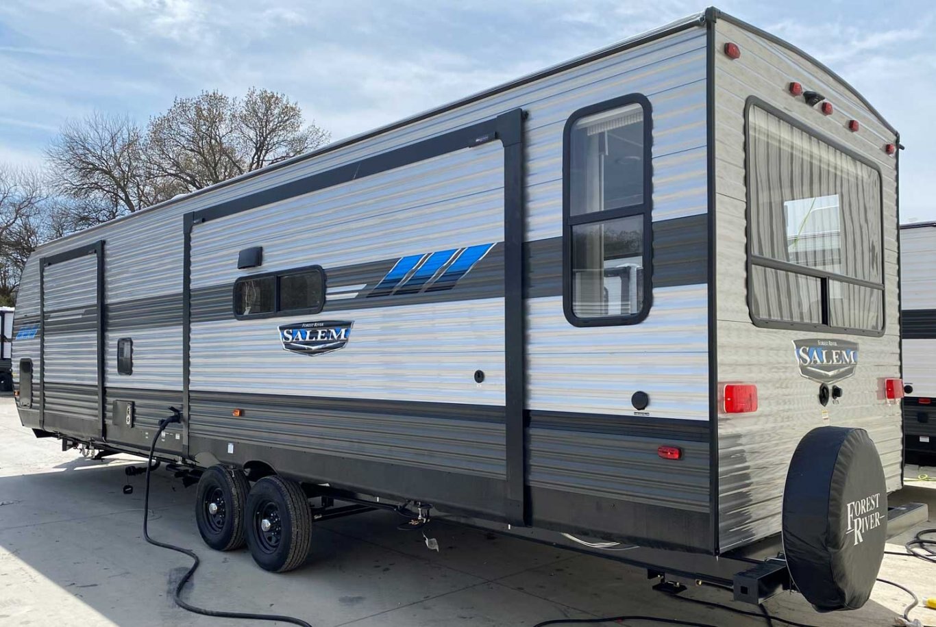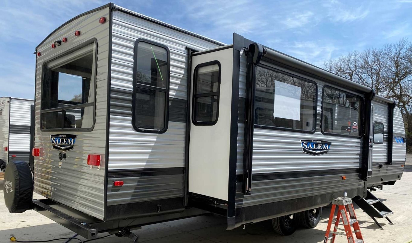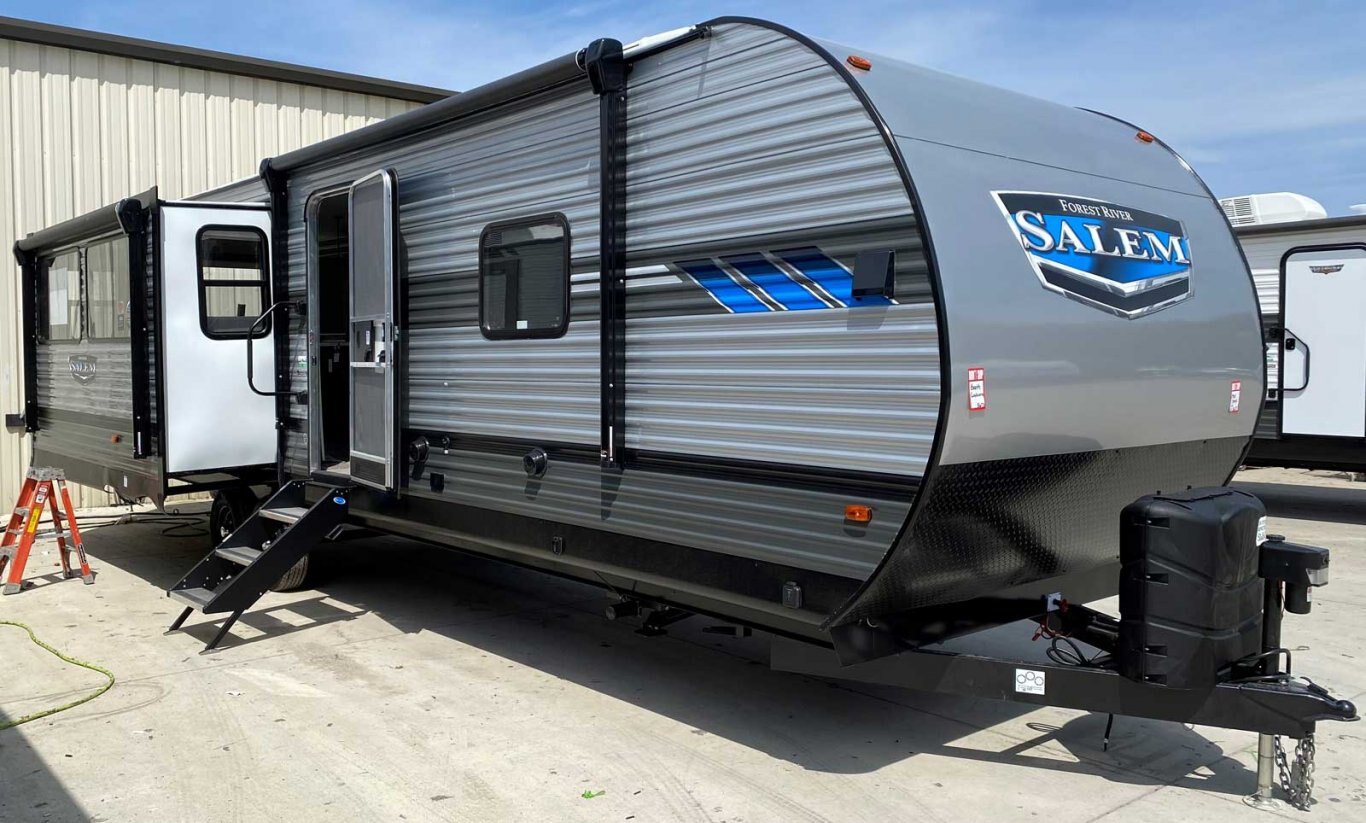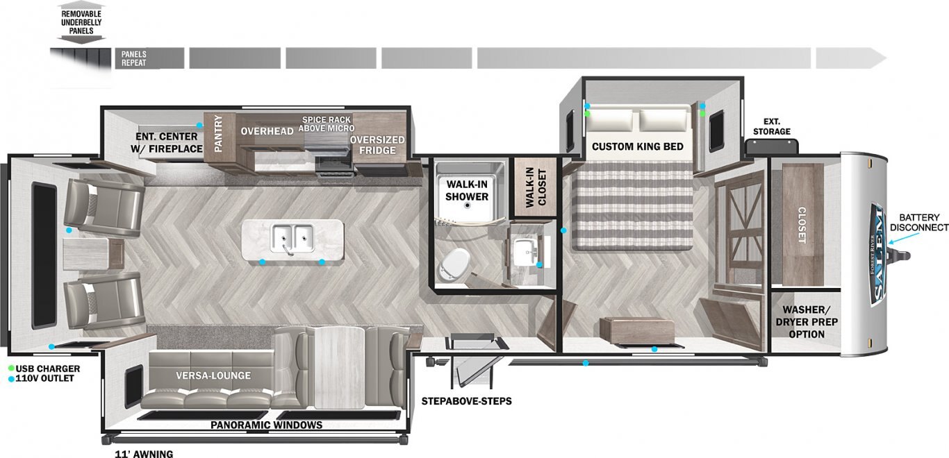 The 32RET gives you spacious living space with three total slide outs. This well-equipped travel trailer features oversized panoramic windows and the desirable Versa-Lounge. The kitchen includes a 11 CU. FT. refrigerator and stovetop with oven and LED accents, plus an island sink with storage below!