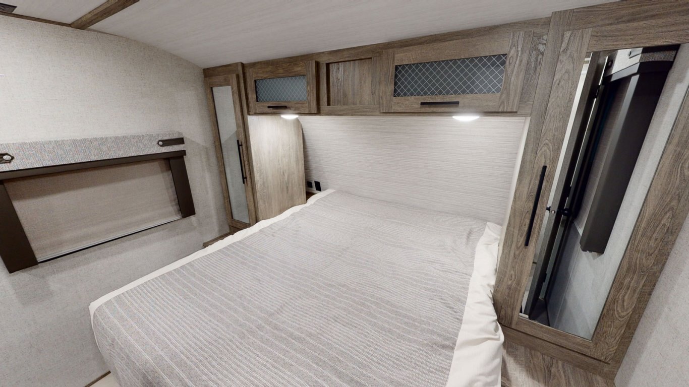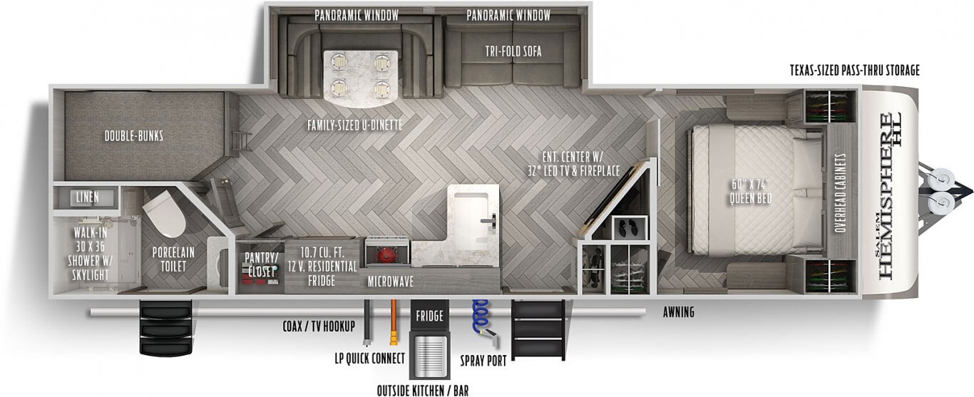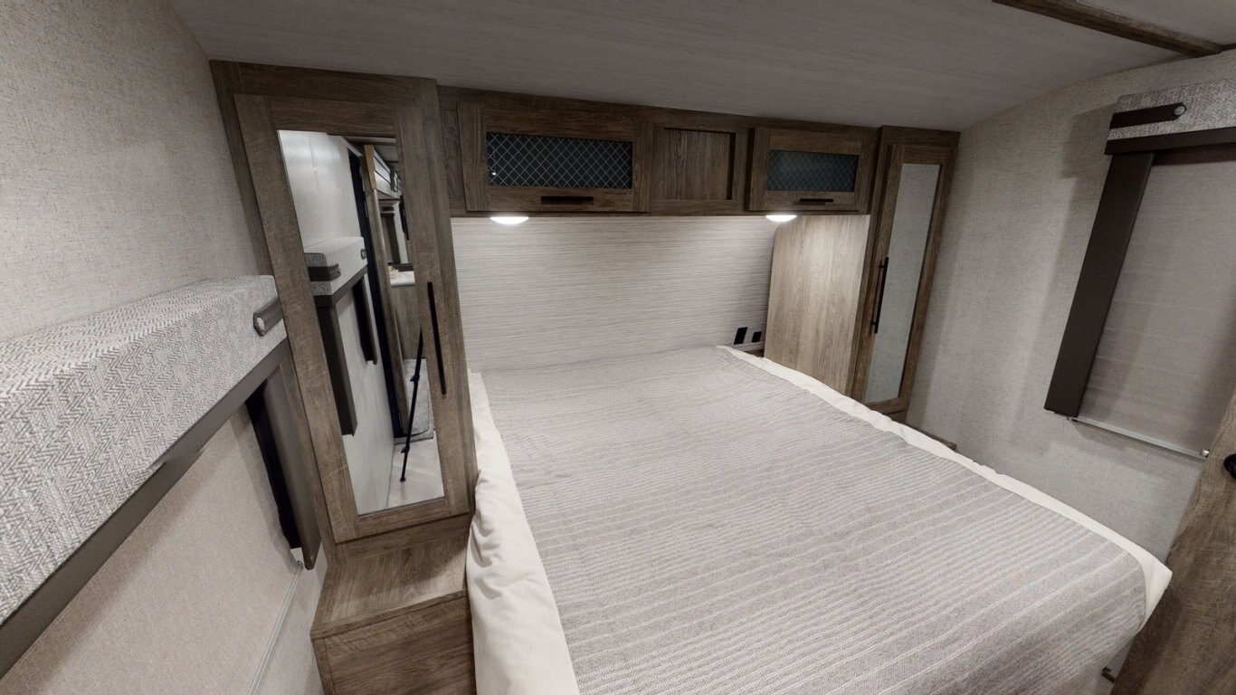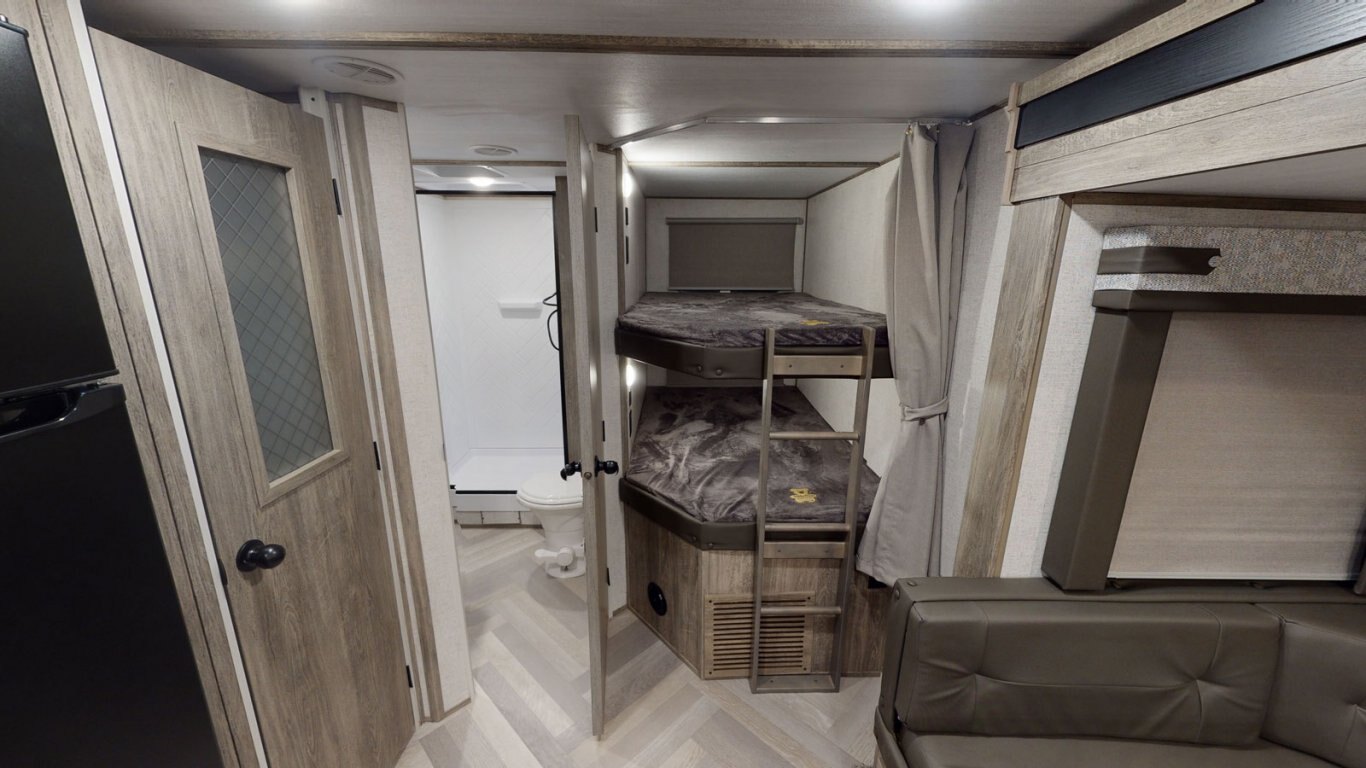 The 26BHHL weighs in at less than 7,000 lb. for towing flexibility, with a streamlined exterior design for maximum fuel efficiency. This is a great family unit, with a double rear bunkroom and two entrances for added convenience. The open kitchen includes residential appliances, a pantry/closet, U-dinette, and panoramic windows. The queen bedroom is in front for added privacy, with overhead cabinets and side hanging closets for storage. When outside, fire up the combination kitchen and bar!