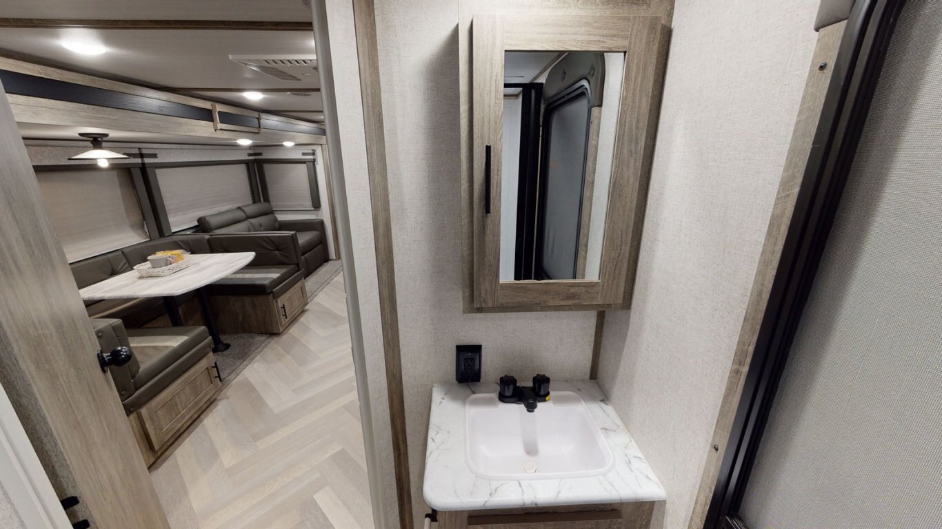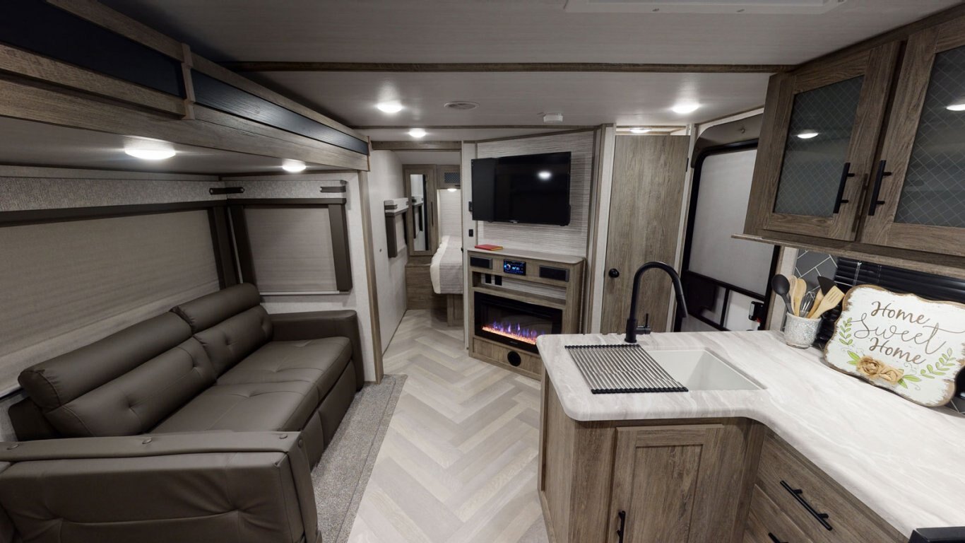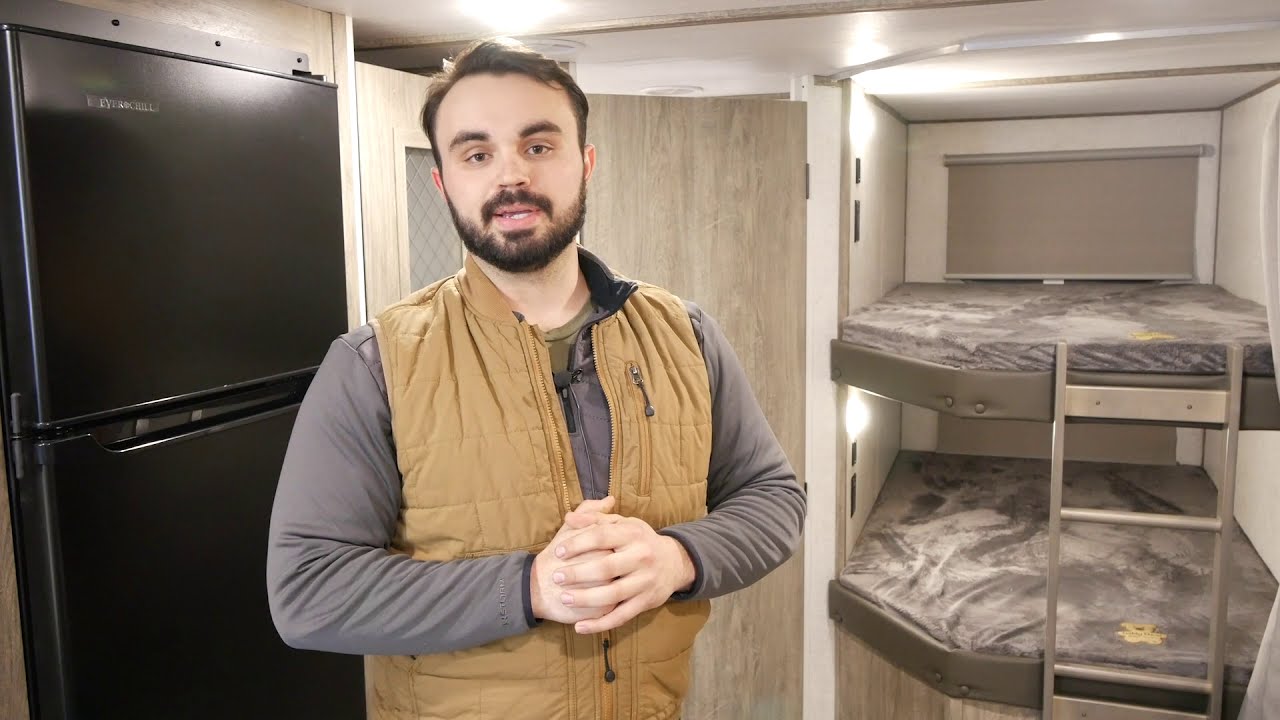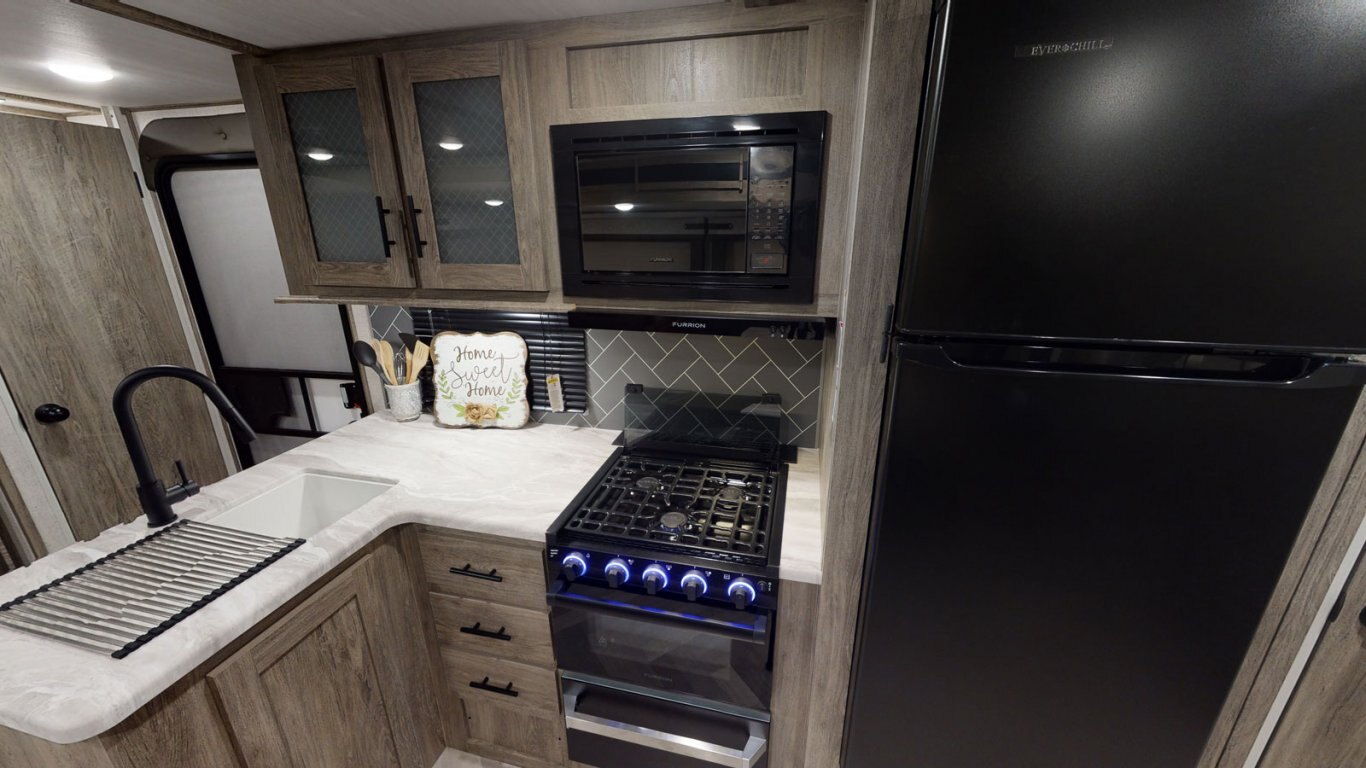 The 26BHHL weighs in at less than 7,000 lb. for towing flexibility, with a streamlined exterior design for maximum fuel efficiency. This is a great family unit, with a double rear bunkroom and two entrances for added convenience. The open kitchen includes residential appliances, a pantry/closet, U-dinette, and panoramic windows. The queen bedroom is in front for added privacy, with overhead cabinets and side hanging closets for storage. When outside, fire up the combination kitchen and bar!