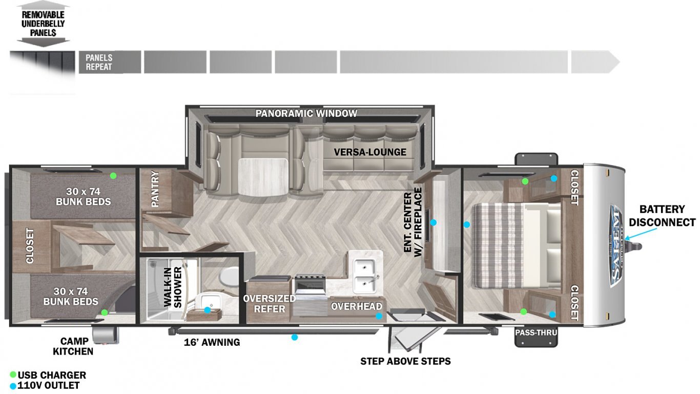 The 282QBXL is a versatile, lightweight bunkhouse with 4 individual bunks. This travel trailer is packed with features, including an optional outside kitchen, U-dinette, Versa-Lounge, and walk-in shower. The kitchen includes an oversized 11 CU. FT. refrigerator, stovetop, oven, and pantry.