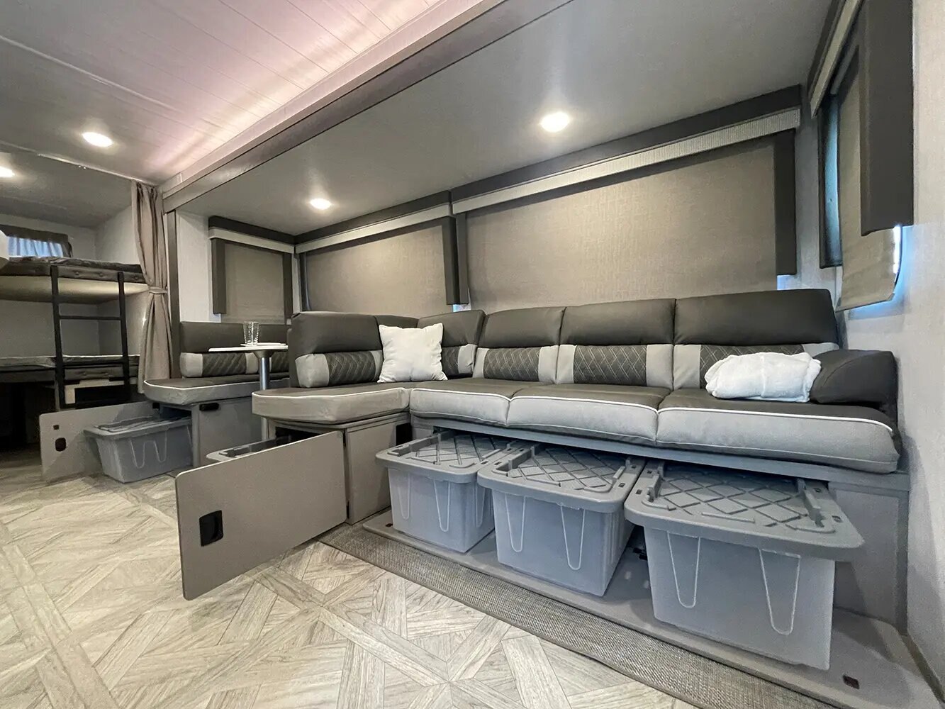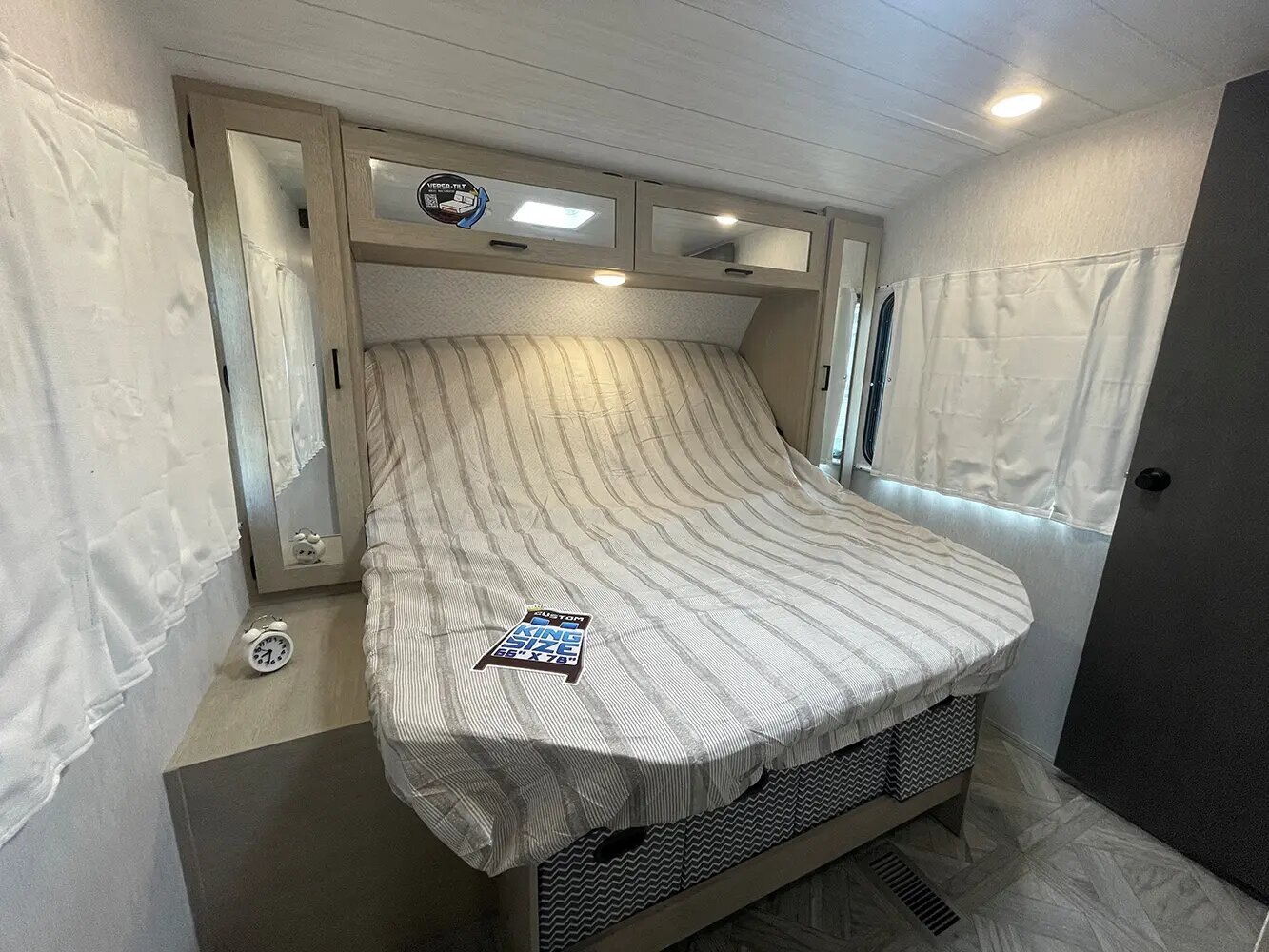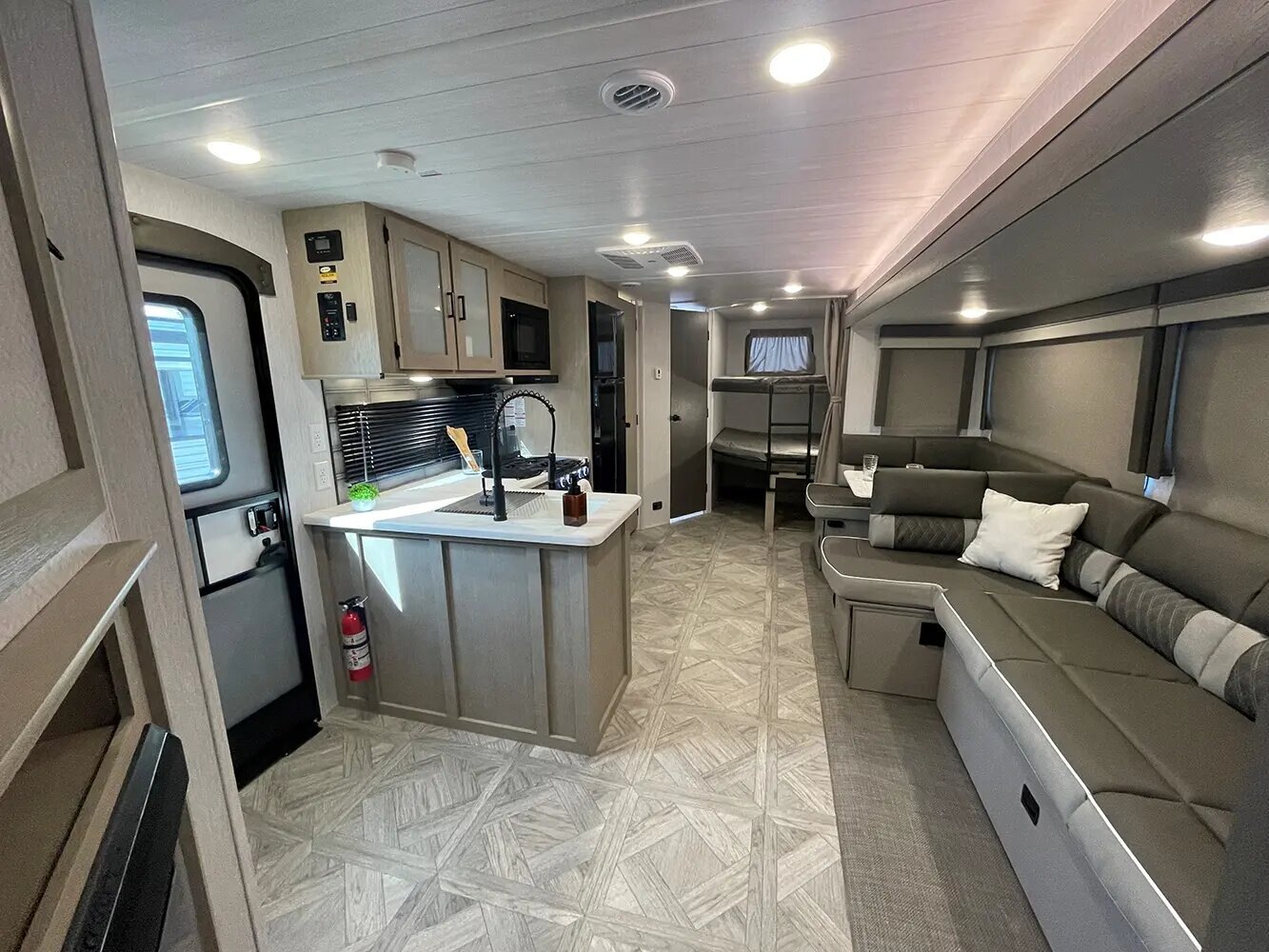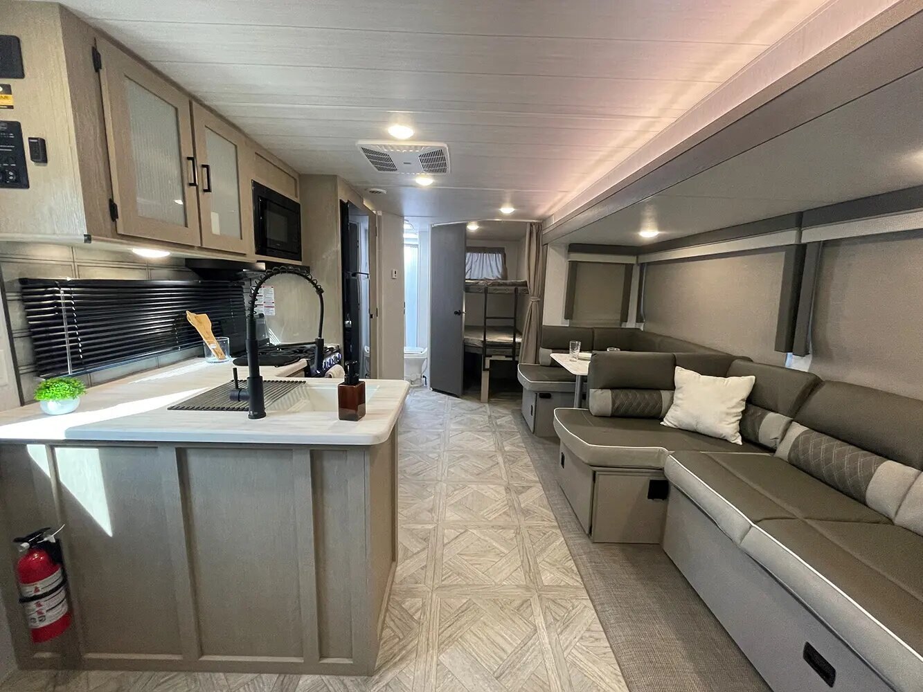 The 26DBUD is the perfect family travel trailer, with double bunks at one end and a queen bedroom at the other. You also get a fireplace (heater), full kitchen with glass-fronted cabinetry and large pantry, a U-dinette, and the customizable Versa-Lounge with Stow N Go Storage. |