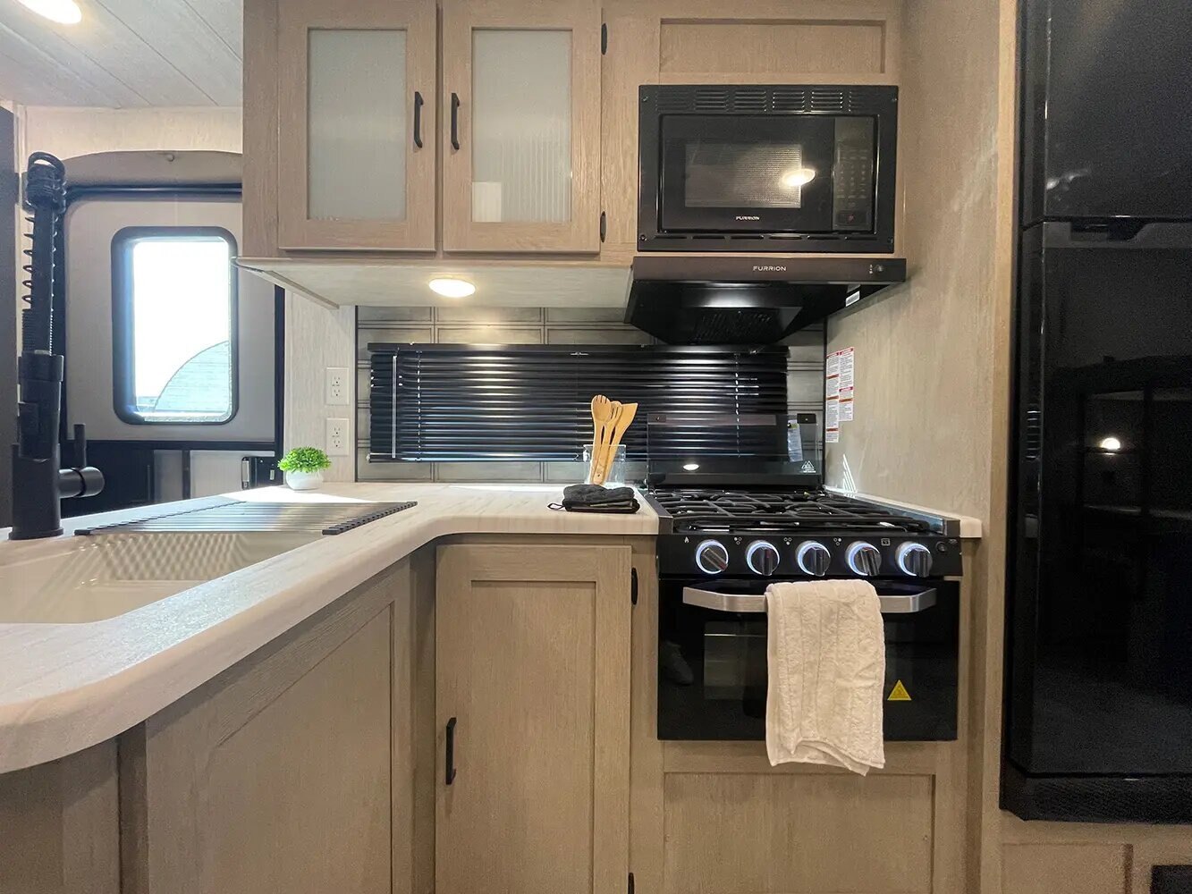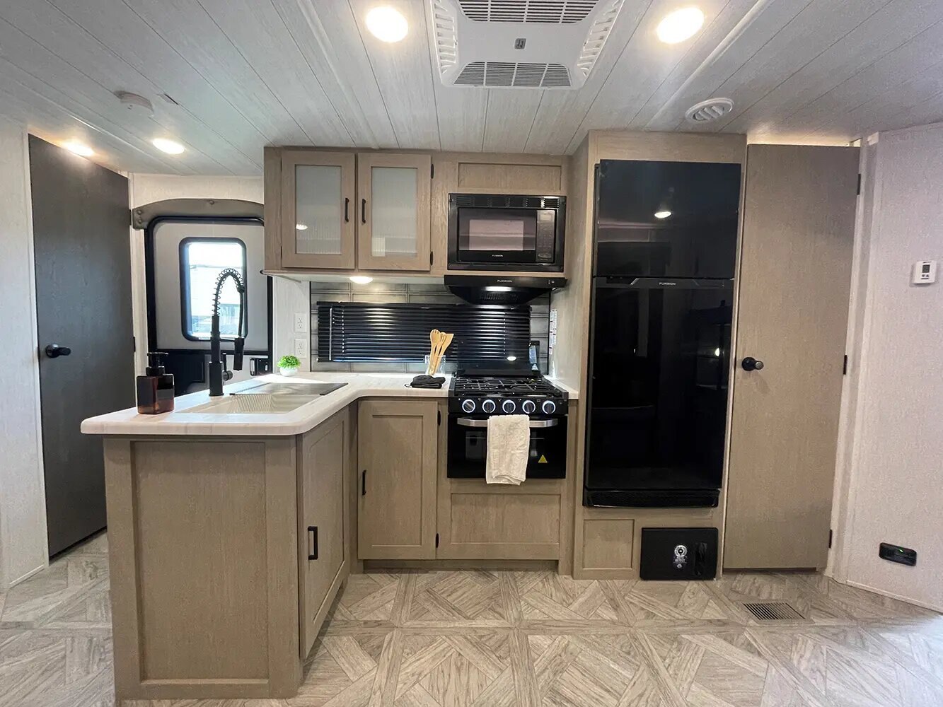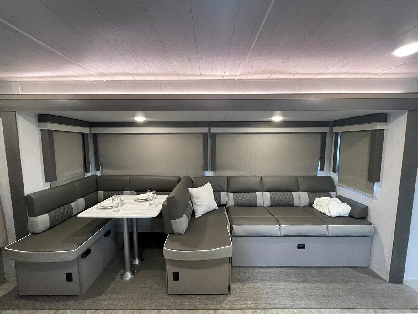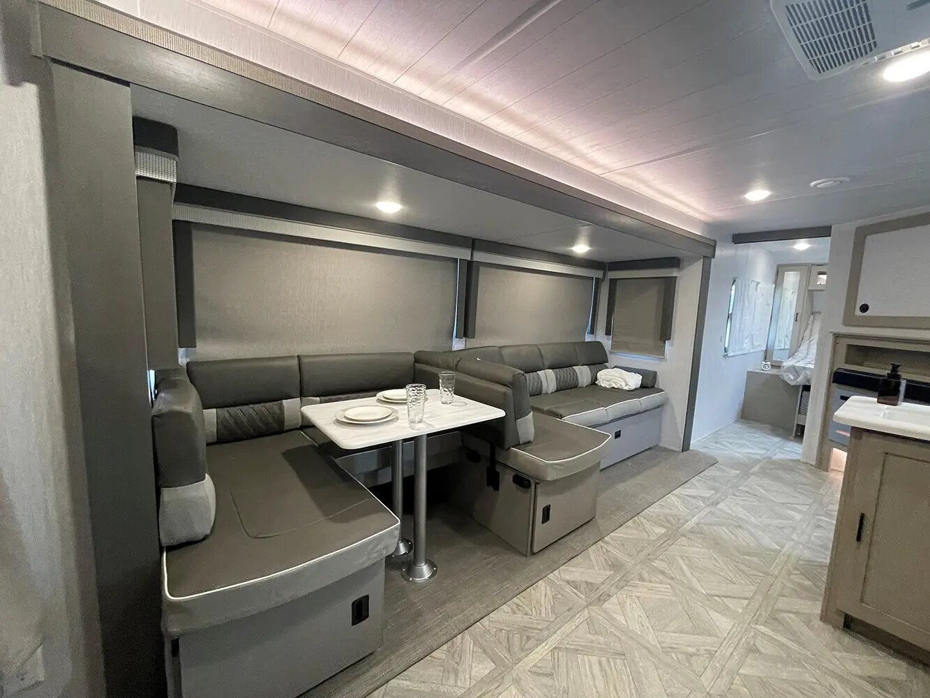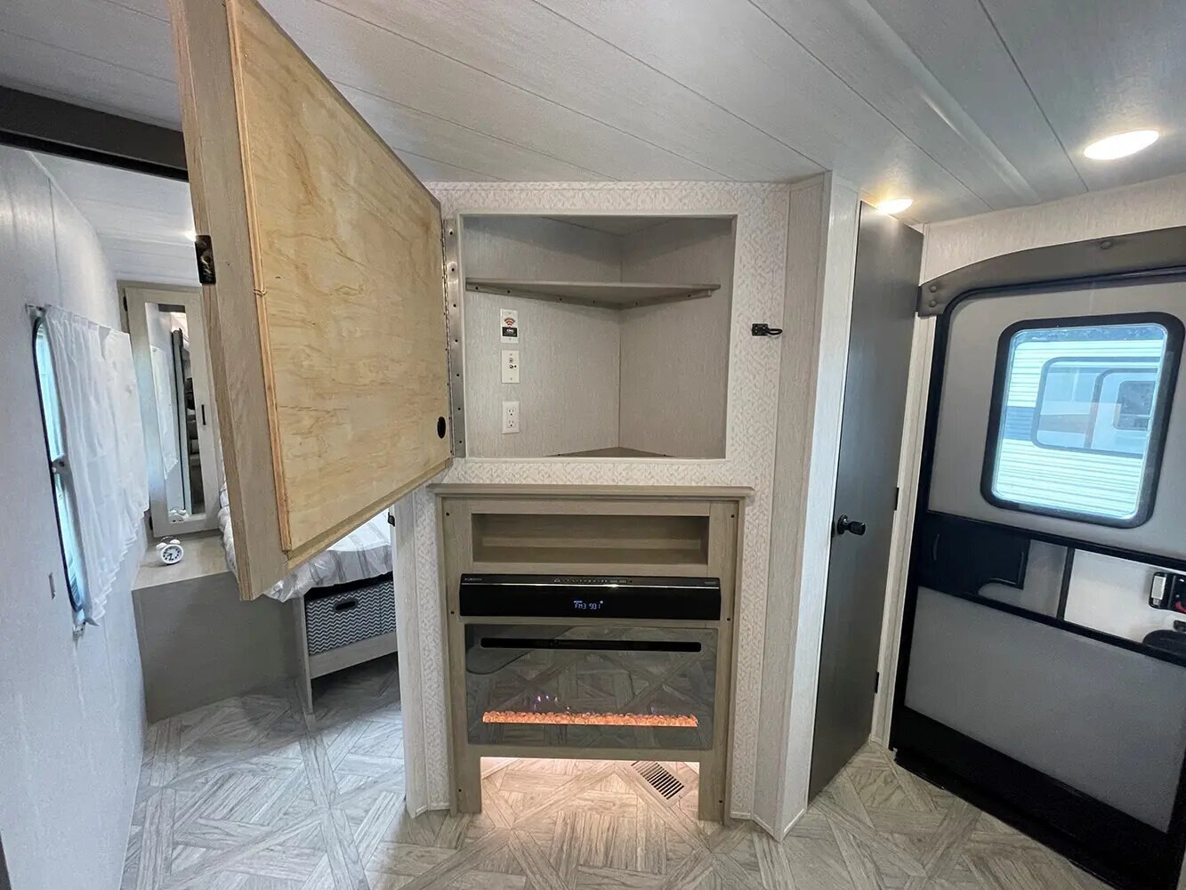 The 26DBUD is the perfect family travel trailer, with double bunks at one end and a queen bedroom at the other. You also get a fireplace (heater), full kitchen with glass-fronted cabinetry and large pantry, a U-dinette, and the customizable Versa-Lounge with Stow N Go Storage. |