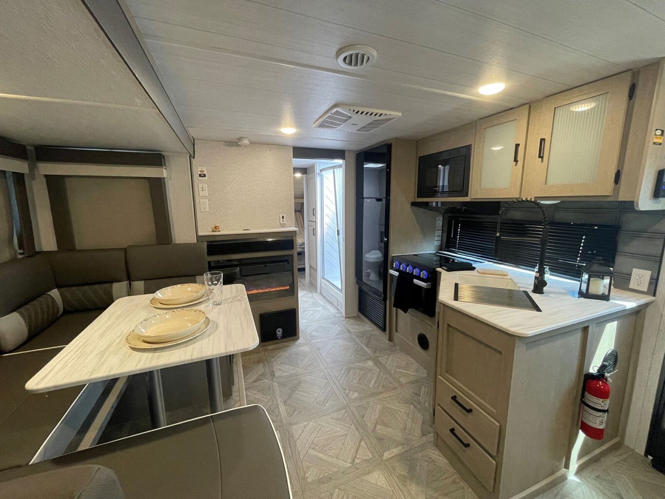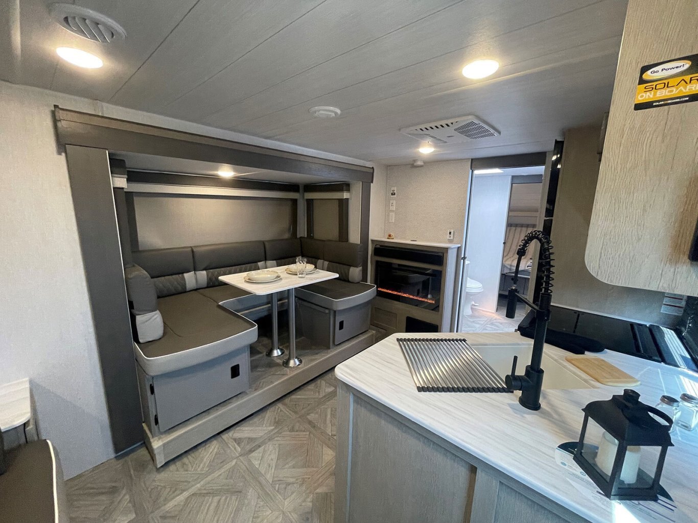 The 24RLXL is an extra-light travel trailer that comes in at 28' 11" and just over 5,000 lbs. The master bedroom features a ton of storage, including dedicated C-pap cubbies! The bathroom provides loads of storage as well, plus a walk-in shower. The kitchen is well-appointed with modern appliances and an oversized 11 CU. FT. refrigerator, fireplace, and U-dinette