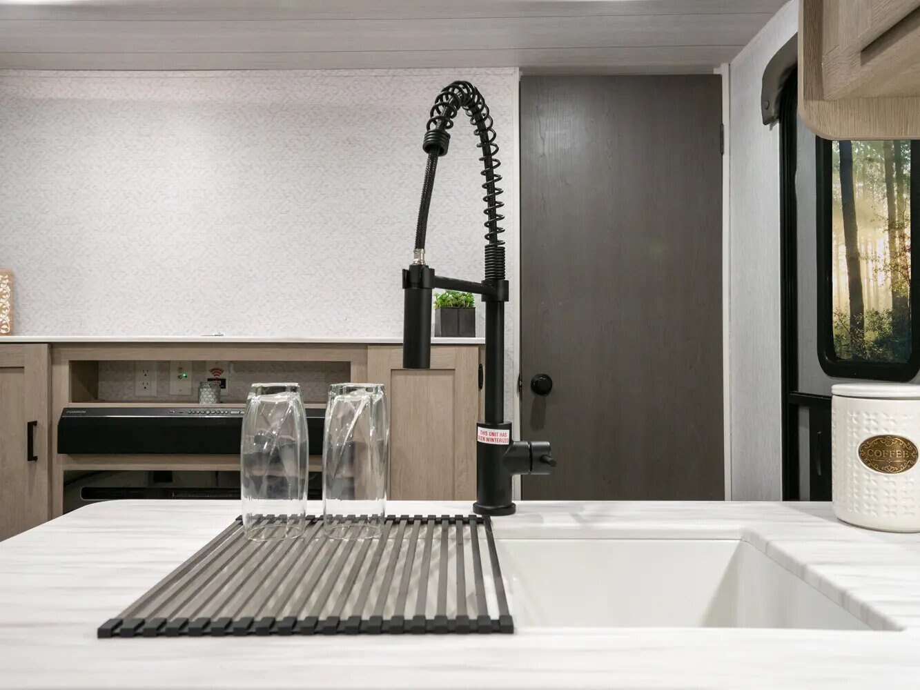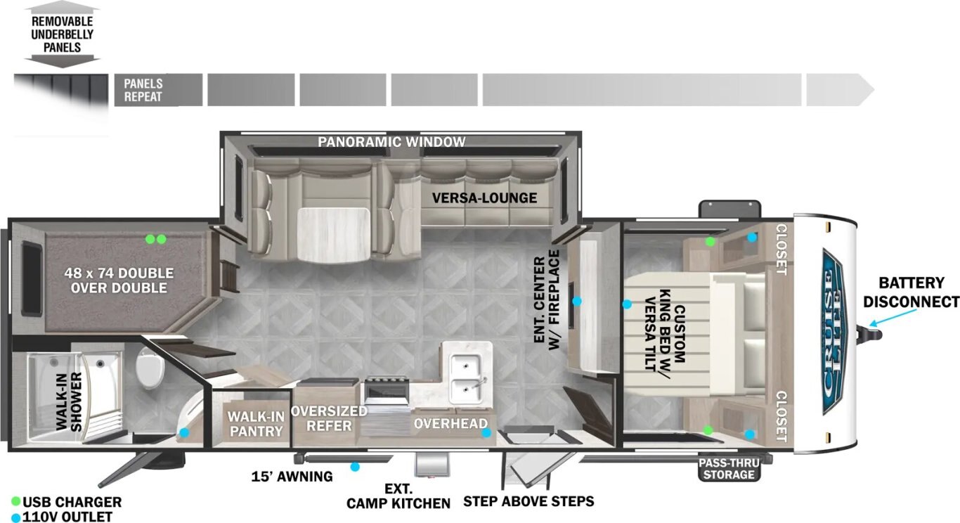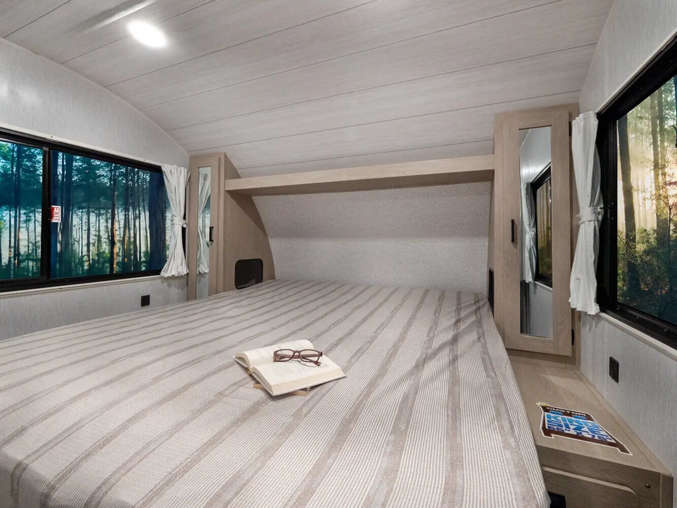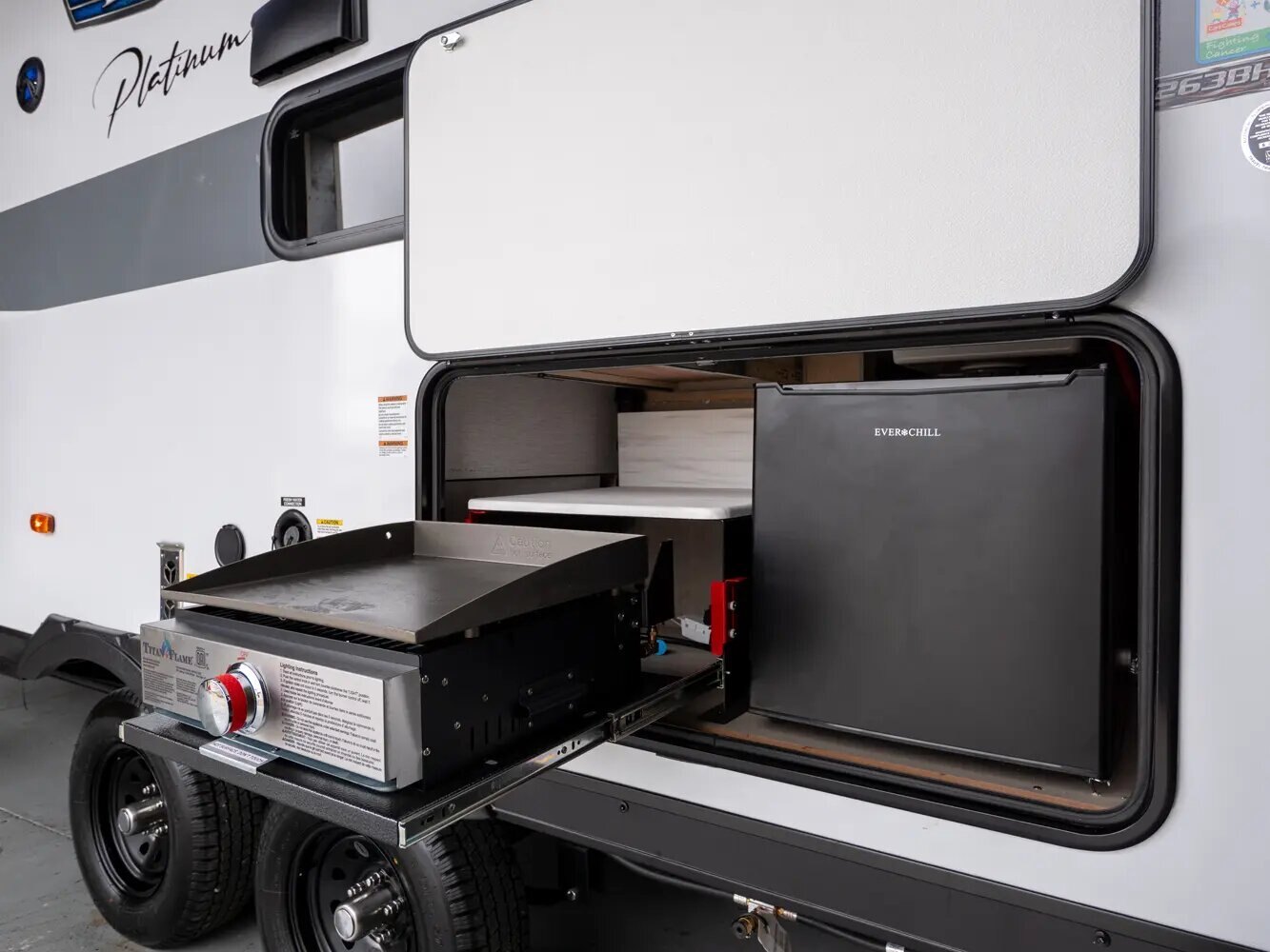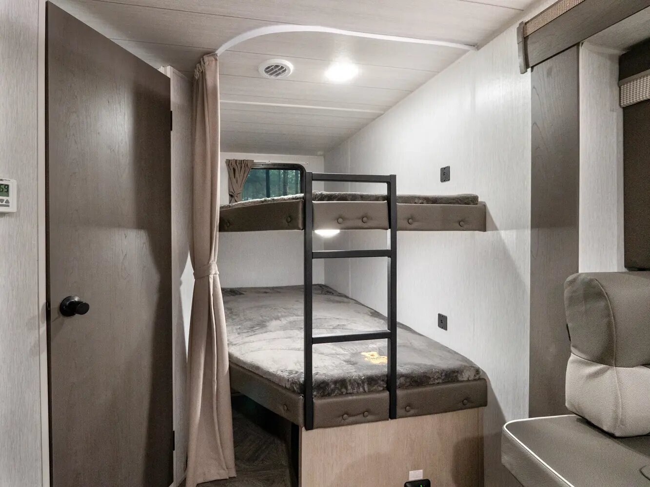 The 263BHXL is perfect for family travels. The rear features two oversized bunks for the kids, with plenty of space to stretch out. The grown-ups will sleep soundly in the front queen bedroom, which includes hanging closets and under-bed Stow N Go Storage. The living area includes panoramic windows and the Versa-Lounge. The kitchen provides a 11 CU. FT. refrigerator and TONS of storage
