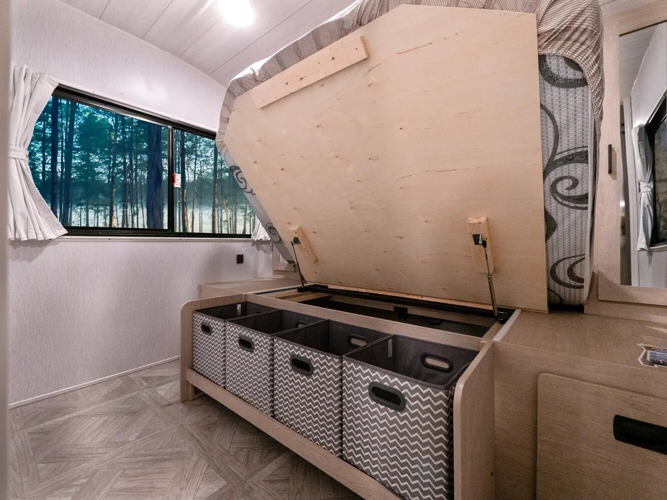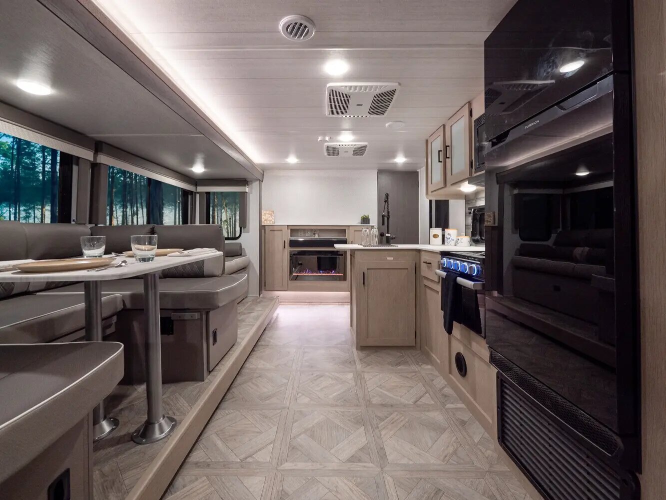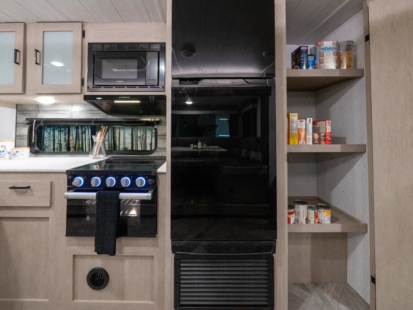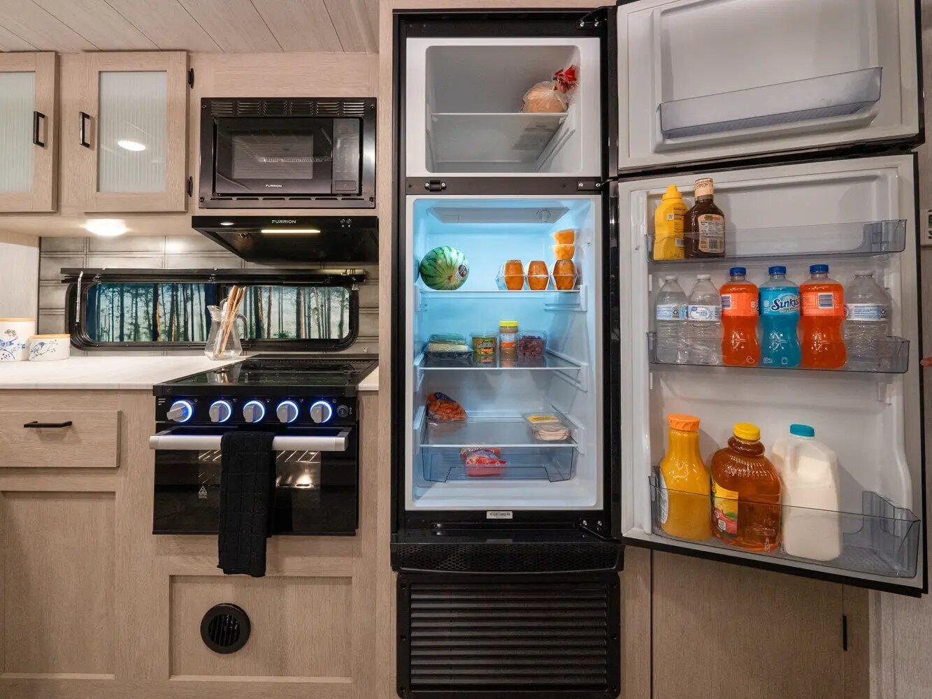 The 263BHXL is perfect for family travels. The rear features two oversized bunks for the kids, with plenty of space to stretch out. The grown-ups will sleep soundly in the front queen bedroom, which includes hanging closets and under-bed Stow N Go Storage. The living area includes panoramic windows and the Versa-Lounge. The kitchen provides a 11 CU. FT. refrigerator and TONS of storage