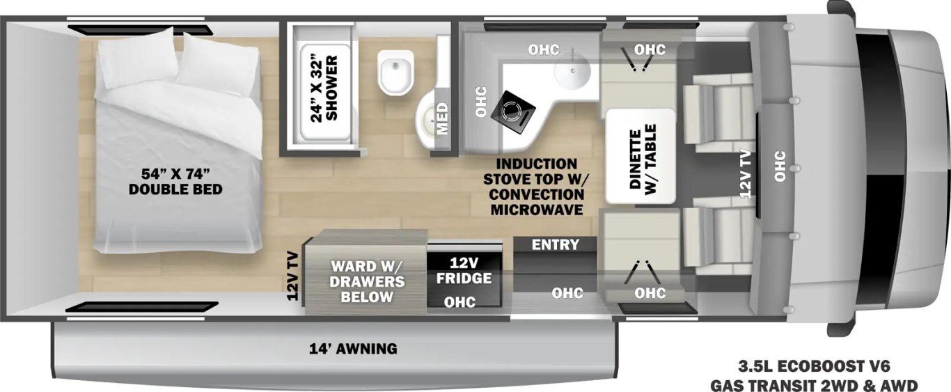 | The Forester TS2381 is a great couple's coach with a 54" x 74" full bed in the bedroom and a two-person dinette with a table in between. There is a wardrobe across from the bathroom for storage. The full bathroom includes a 24" x 32" skylight shower, commode, vanity sink with extended countertop, and medicine cabinet. The kitchen offers a corner counter 12V 10 CU FT refrigerator, convection microwave, and 3-burner stovetop. Overhead cabinets throughout provide additional storage. |