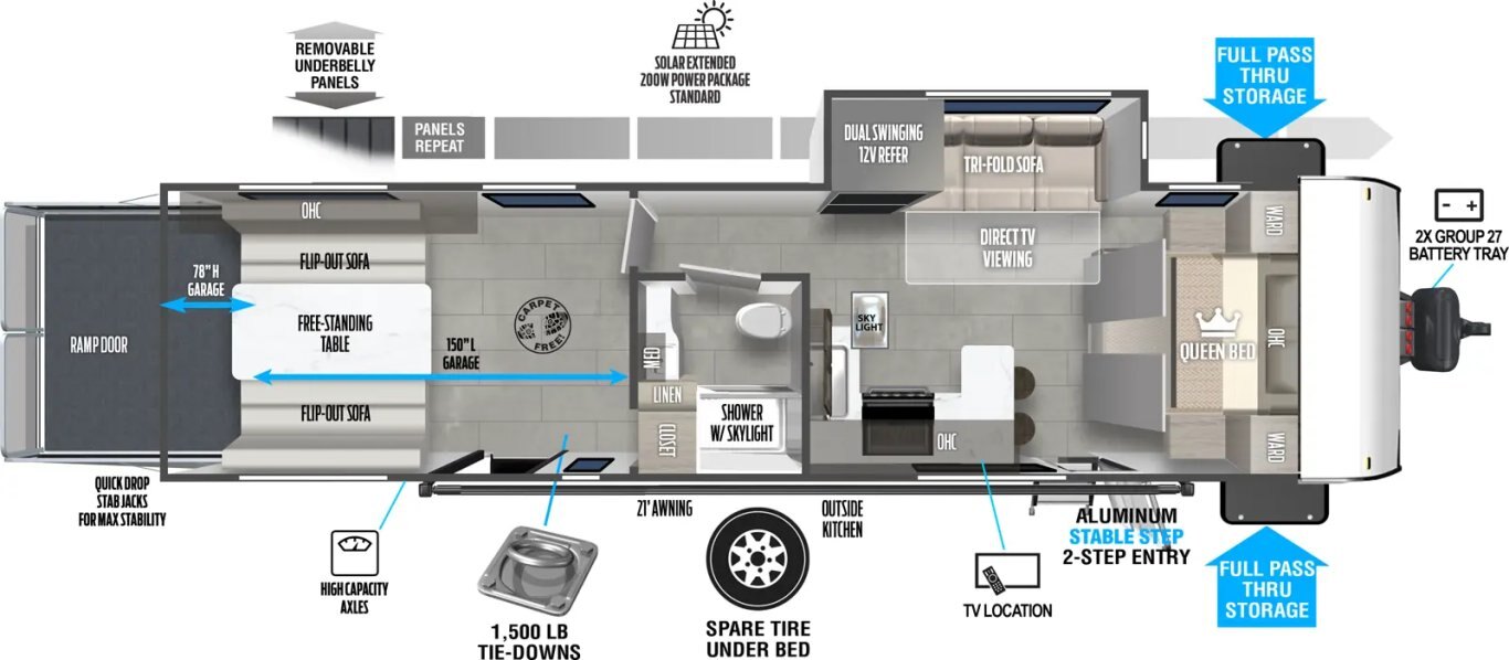 • MAX COLD WEATHER Package: 12V Heated Tank Pads on all Holding Tanks (Fresh, Grey, and Black) w/ AutoStart below 48°F + Fully Enclosed Underbelly Using Industry Leading AccessiBelly Panels + Insulated Flooring for Heat Capture and Deflection