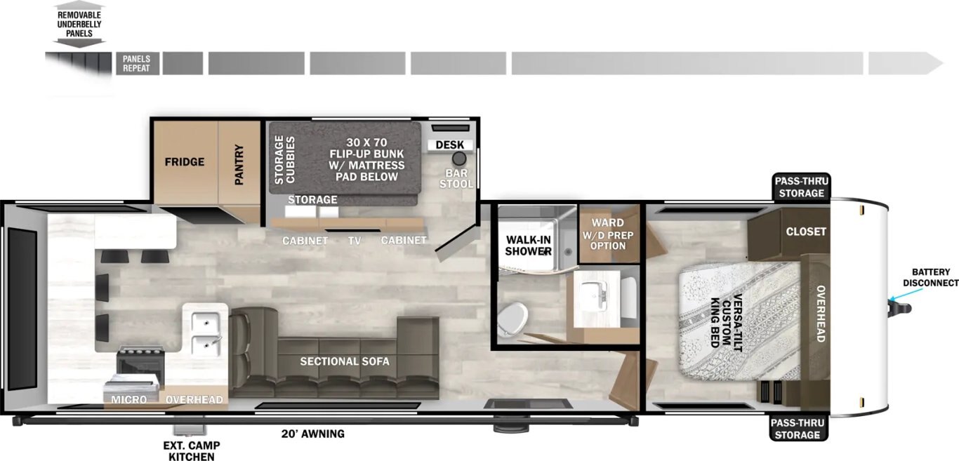 The Salem 29VIEW floorplan offers standard hung fiberglass exterior and solid surface countertops. Features the Versa-Slide offering additional storage, bunks and capability to utilize as an office. This model bypasses a traditional dinette but offers 18 linear feet of countertop space and the 105 square feet of windows offers a view that is unrivaled in this segment.