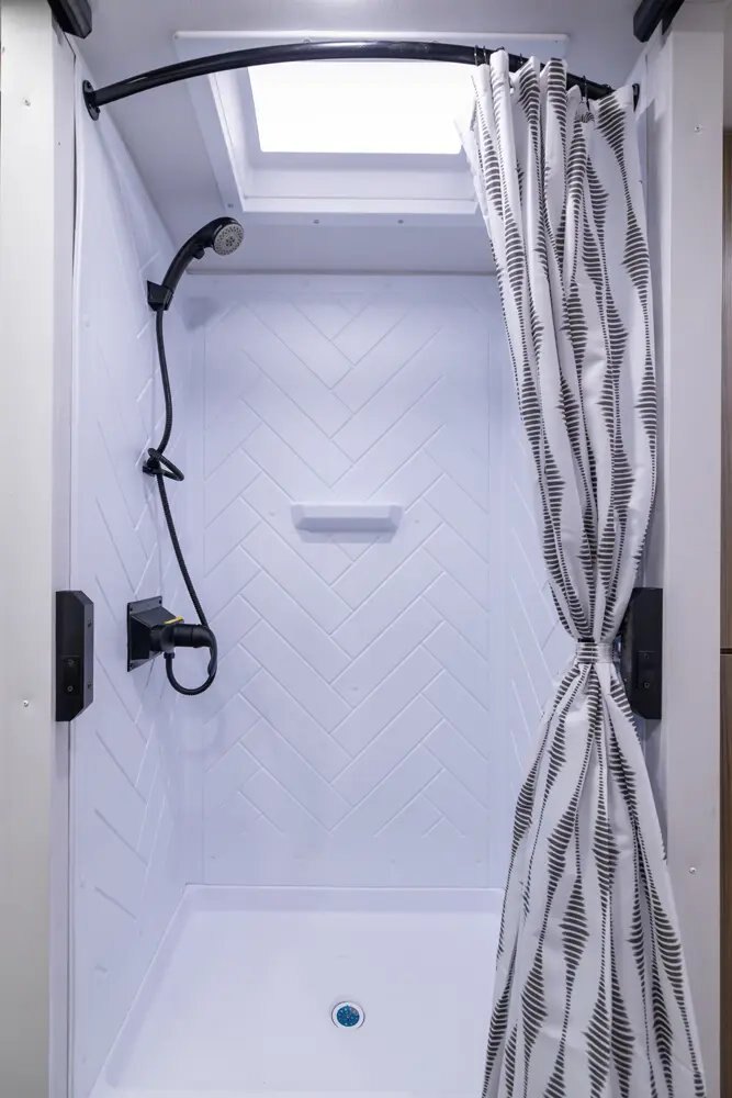 • Large 36x24 Shower Pan w/ Shower Surround + Waterproof Retractable Shower Door (No Curtain)