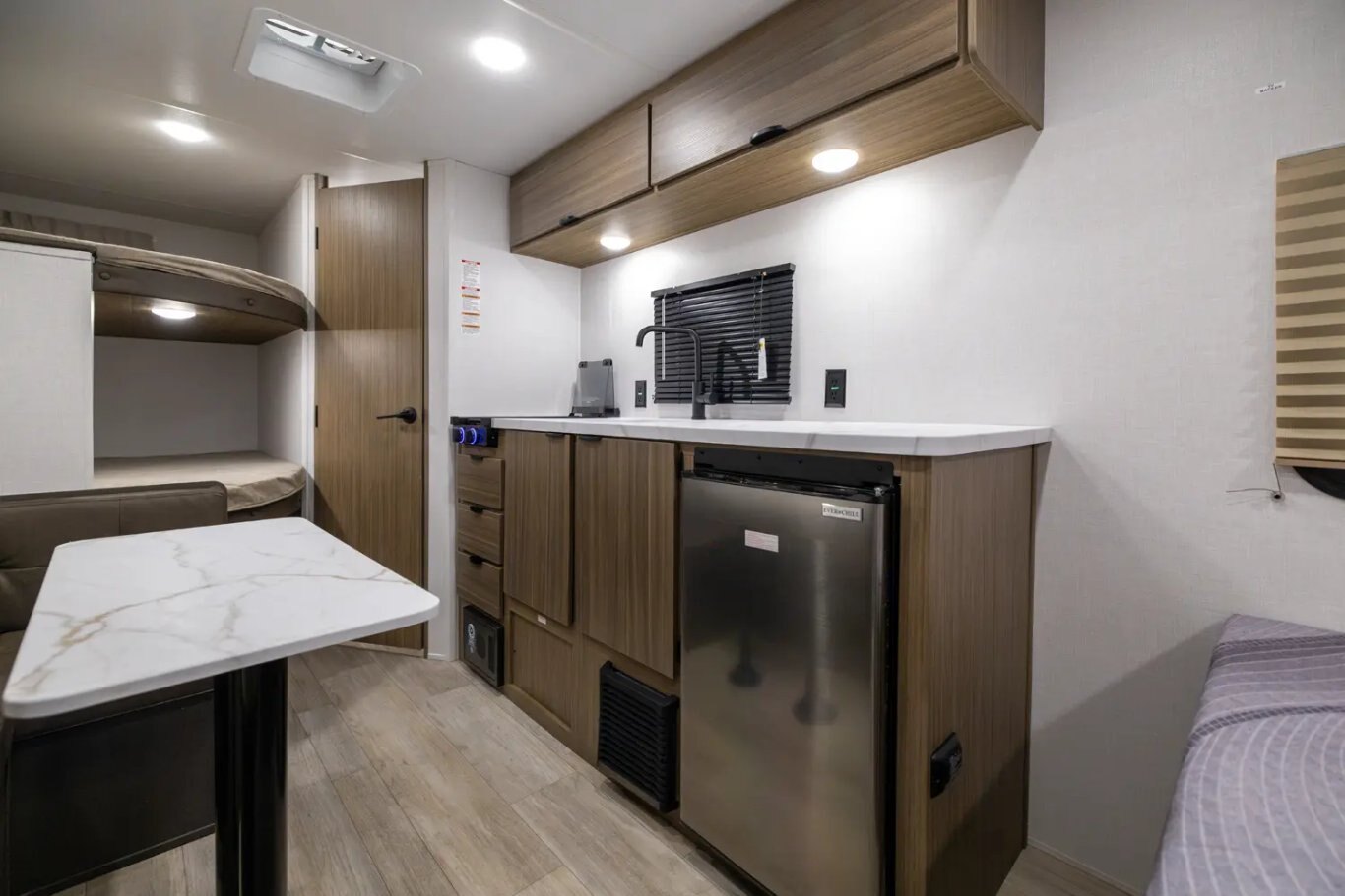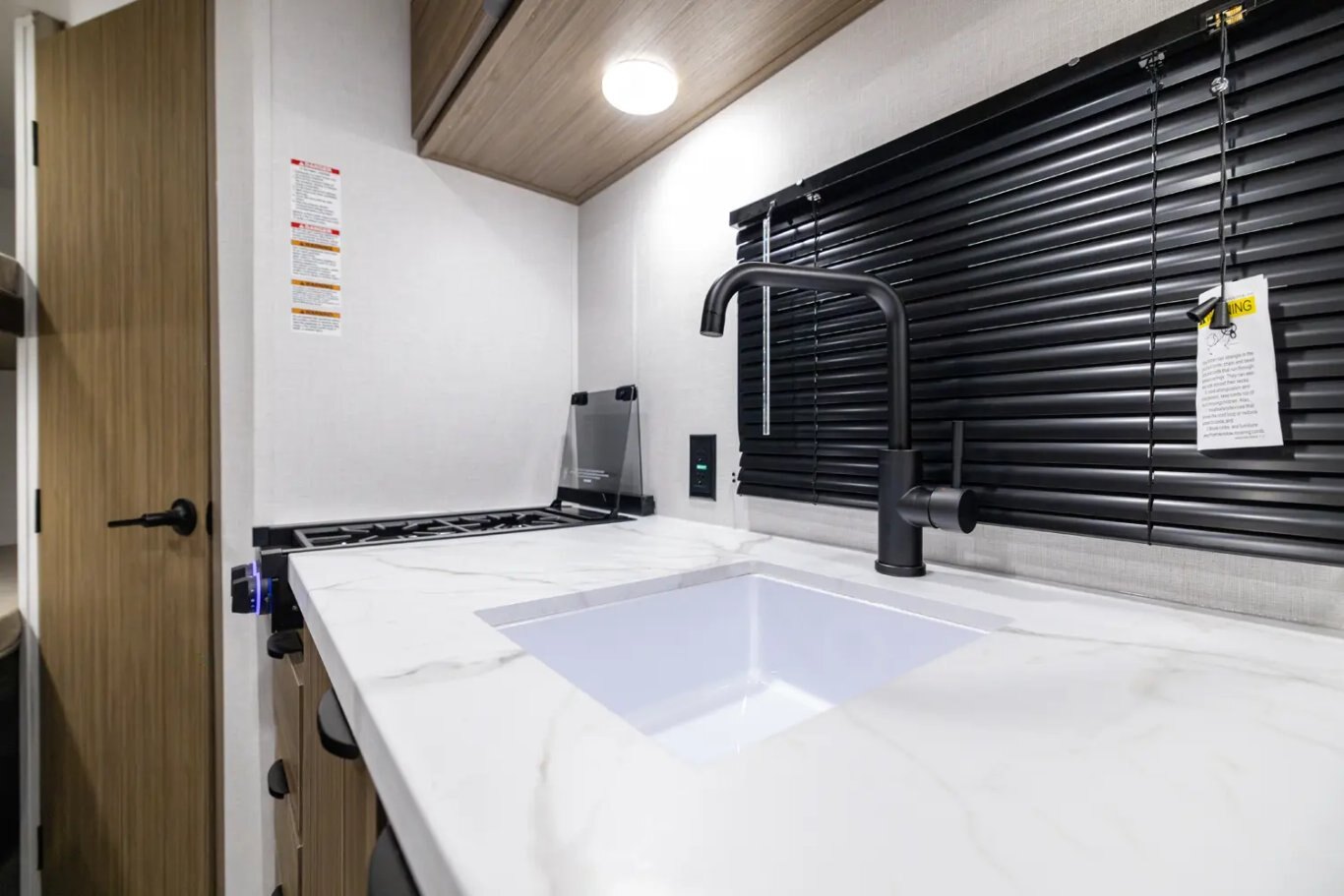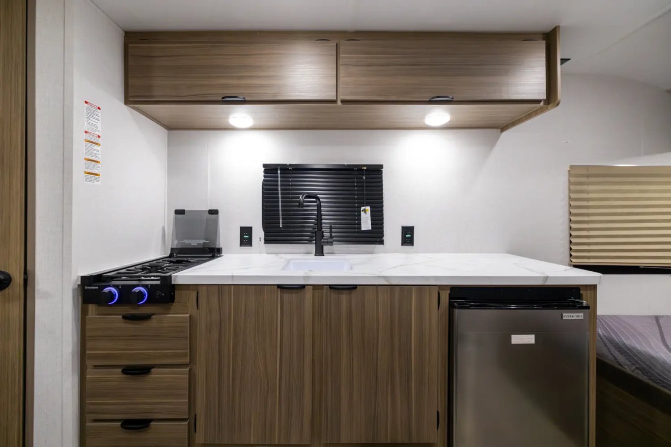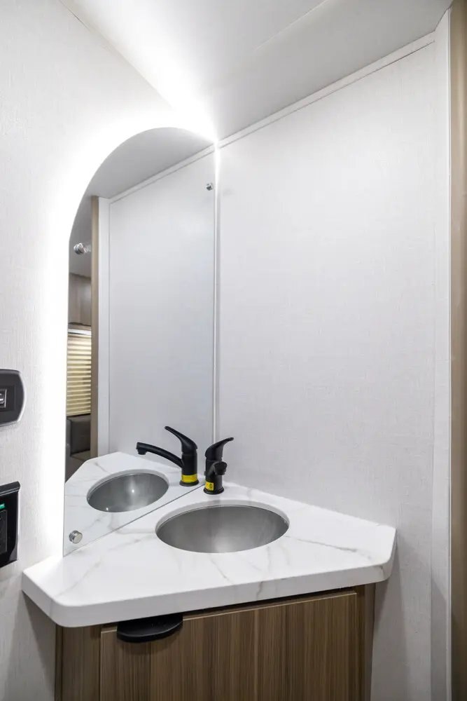 Kitchen Standard Features MAX Kitchen Storage - Nearly 50% More Cabinetry Than Others Thanks to Space Saving Appliances and Clever Designs 3-in-1 Cooker w/ Convection Oven, Microwave, 3 Burner Gas Cooktop 10CuFt 12V Refrigerator for Extended Camping Residential High Rise Kitchen Faucet and Deep Kitchen Sink Slim Range Vent Hood over Cooktop (Varies by Model) Seamless Countertops with Waterproof Membrane for Longevity