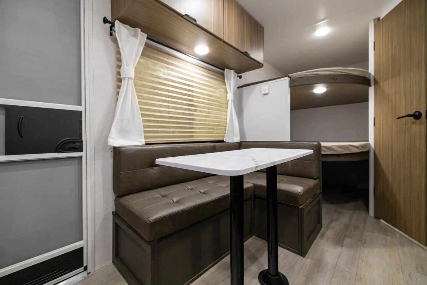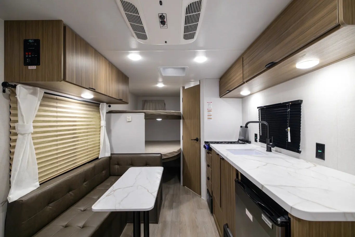 Standard Features: Waterproof Portable FM / Bluetooth Speaker System Extra Thick Luxury Vinyl Flooring - NO CARPET! Largest in Class Opening Panoramic Windows Large 36x24 Shower Pan w/ Shower Surround + Waterproof Retractable Shower Door (No Curtain) Extra Large Holding Tanks for Extended Camping - 75% Larger Than Average! 26" Entrance Doors w/ Friction Hinge to Shut Slow 7-Way Plug and Chain Holder for Towing Ease 4 - 6 USB Ports w/ USB A and USB C Compatibility for Phone and Tablet Charging Large Baggage Doors for Exterior Storage Residential High Rise Kitchen Faucet Backup Camera Ready (Harness and Wiring Installed) 30 Amp Service w/ Auto Detect Converter (Works with Multiple Battery Types) 13.5K BTU Roof Mounted Air Conditioner 20K BTU Furnace Microwave in Kitchen 60,000BTU Extra Large On Demand Hot Water Heater 2 Burner Cook Top with Glass Cover Mirrored Vanity with Medicine Cabinet (available on most models) Omni Directional Digital TV Antenna Water Heater By-Pass Roof Mounted Solar Inlet on Roof Side Mounted Solar Inlet on Camp Side