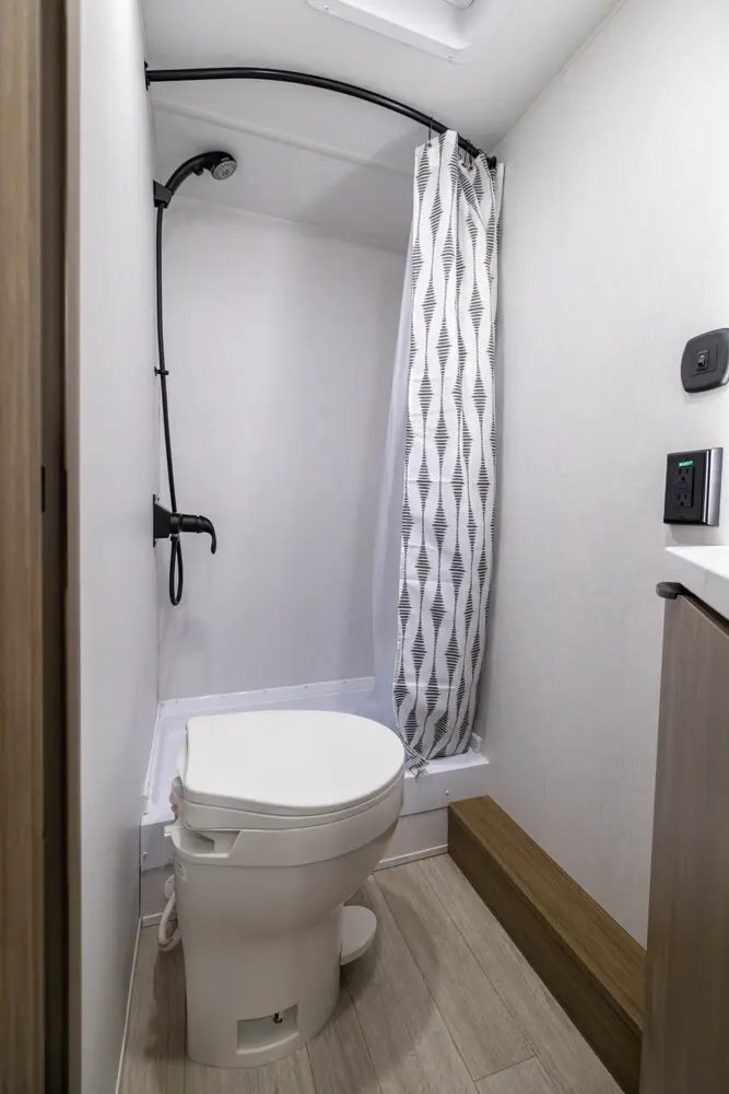 Camp Comfort Package Outside Hot/Cold Shower Slim Range Vent Hood over Cooktop Residue Resistant Linoleum (Added Durability Against Oil, Grease, Gas) Foot Flush Toilet Power Vent Fans to Exhaust Heat, Smells, and Humidity LED Interior Lighting for Low Power Draw and Brighter Camping LP Quick Connect on Exterior of Unit - Perfect for Griddles, Grills, and More