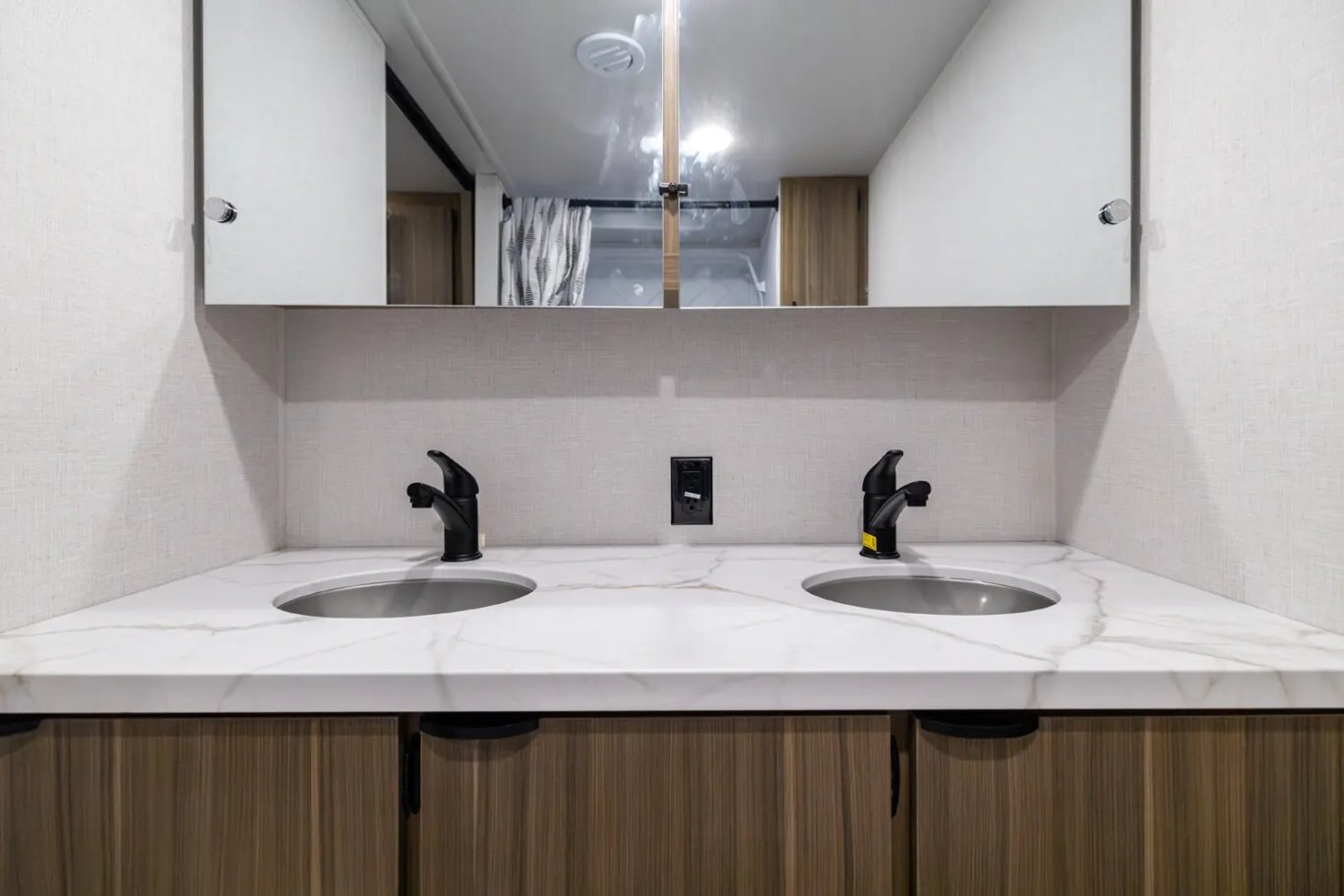 Interior Standard Features 4 - 6 USB Ports w/ USB A and USB C Compatibility for Phone and Tablet Charging Fully Independent Air Conditioning Ductwork for Focused Cooling When Needed Large Shower Pans for Adults (No Bathtubs) 30-50 Amp Service w/ Auto Detect Converter (Works with Multiple Battery Types). Amperage varies by model size. TV Mounting Areas w/ Mount Installed (Varies by Model) Water Heater By-Pass 20K BTU Furnace Ducted Through Walls and Cabinets, No Floor Ducting