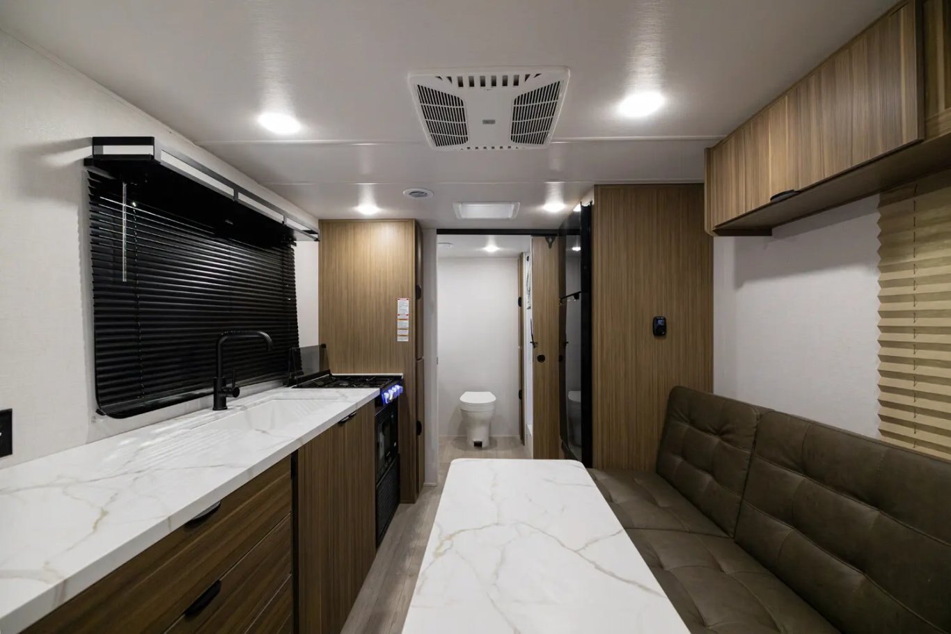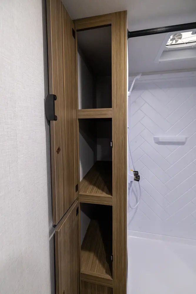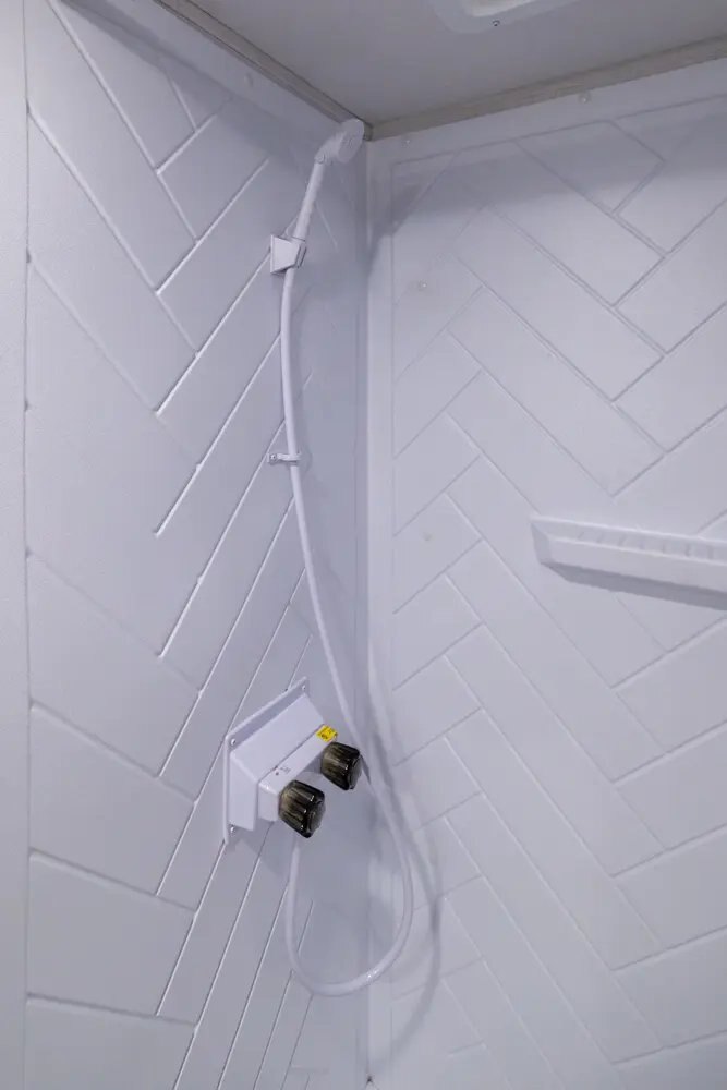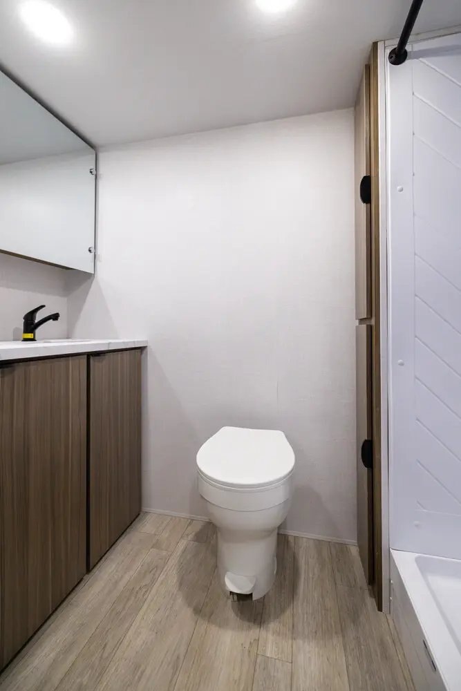 Camp Comfort Package Outside Hot/Cold Shower Slim Range Vent Hood over Cooktop Residue Resistant Linoleum (Added Durability Against Oil, Grease, Gas) Foot Flush Toilet Power Vent Fans to Exhaust Heat, Smells, and Humidity LED Interior Lighting for Low Power Draw and Brighter Camping LP Quick Connect on Exterior of Unit - Perfect for Griddles, Grills, and More