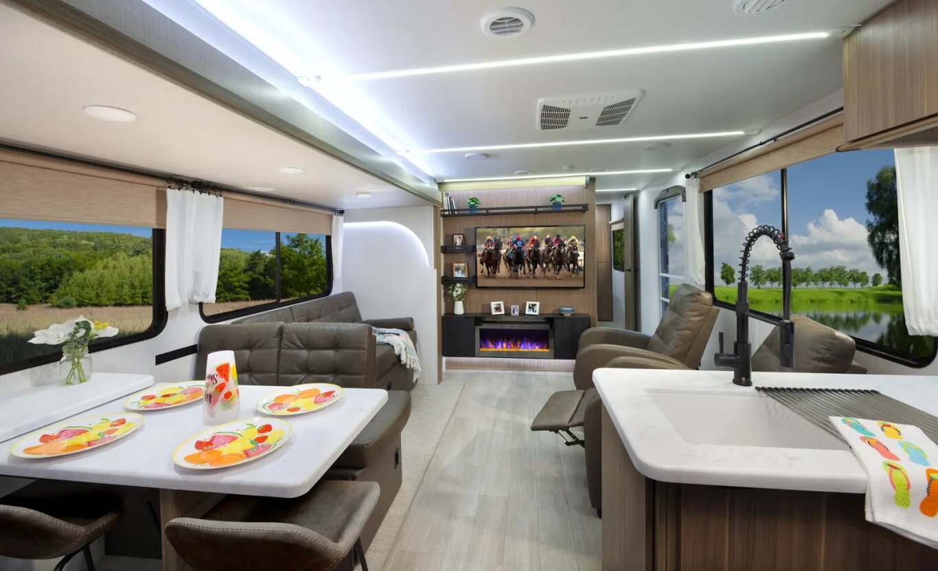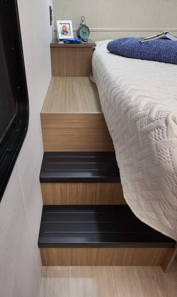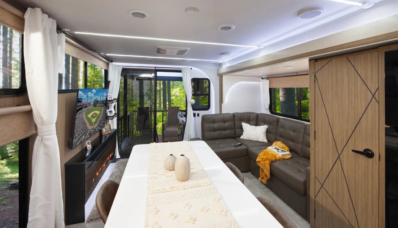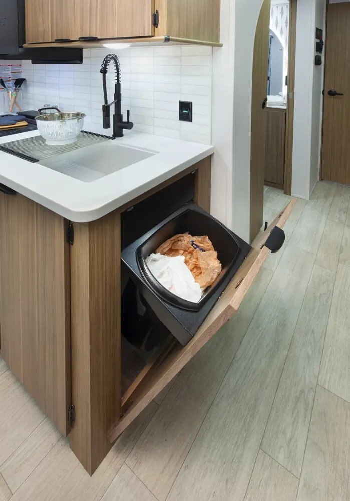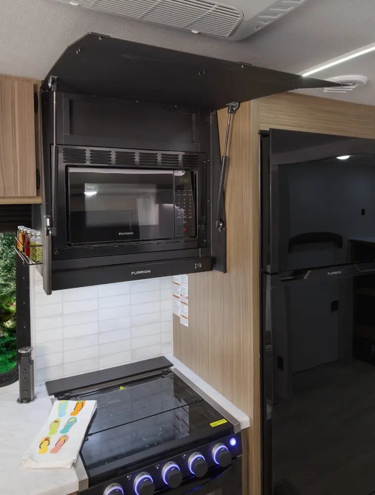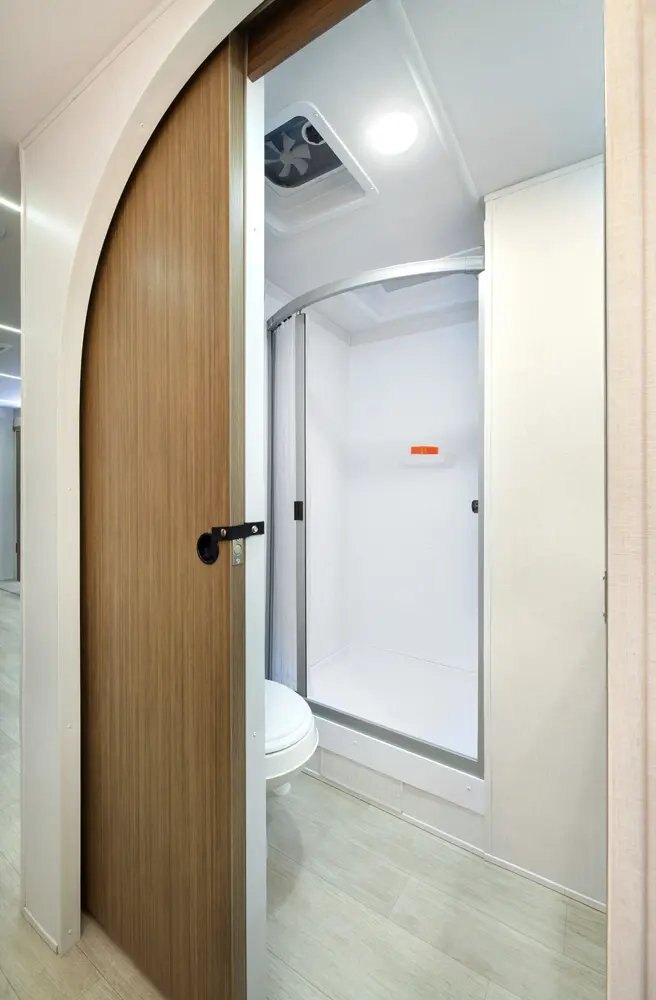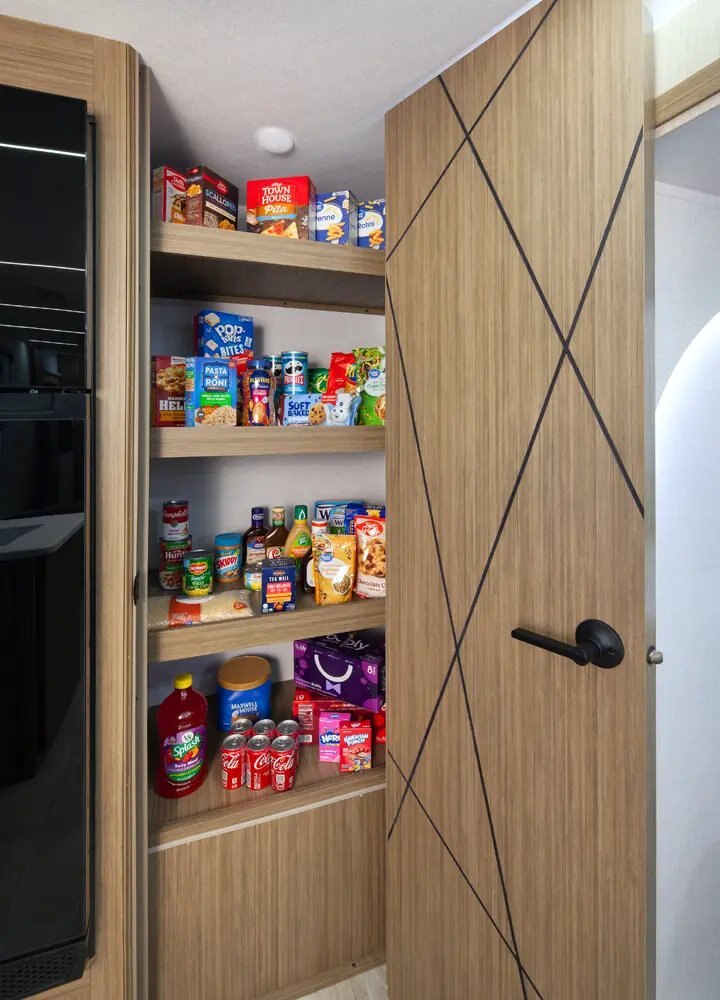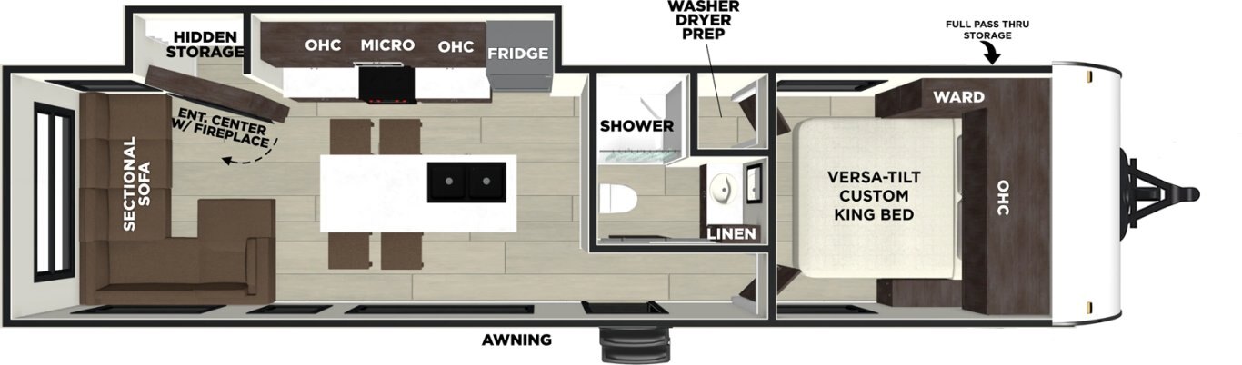 The Wildwood 280ZEN floorplan offers standard hung fiberglass exterior and solid surface countertops. Features a 7ft island with waterfall edge and barstools that helps account for 17 linear feet of countertop space. Couple that with 95.5 square feet of windows and an amazing view this is a wonderful couples’ unit. The extra-large hidden pantry provides room to store whatever you may need.