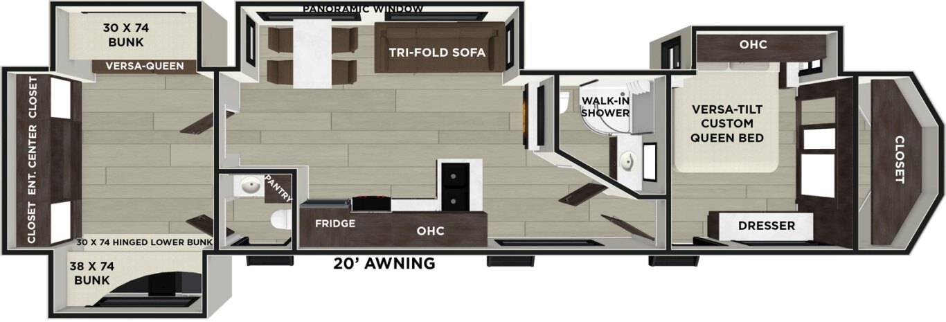 The 42QBQ is the ultimate bunkhouse, with four slides and an outdoor kitchen. The large front queen bedroom includes plenty of closet and cabinet space, while the adjacent bathroom gives you a walk-in radius shower. The living area features panoramic windows, fireplace (heater), and a tri-fold sofa. The bunk room provides 3 bunks plus the Versa-Queen giving the option of having another bunk, sofa, or queen bed. Do not forget the half bath with convenient door to the outside.