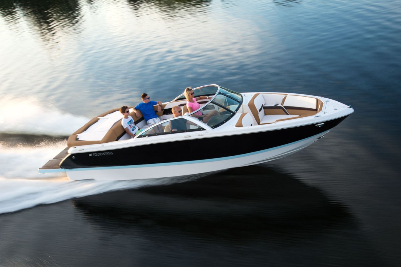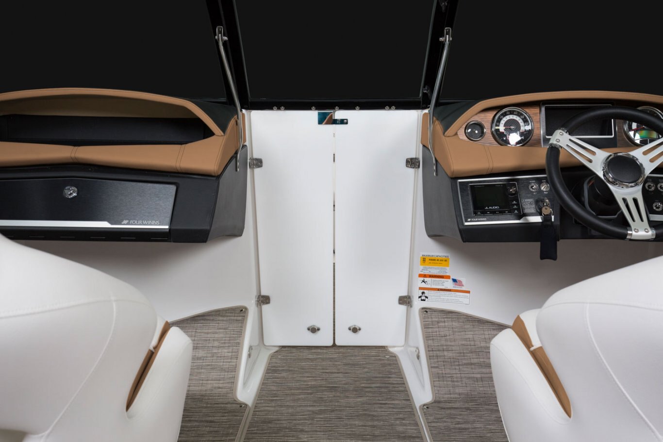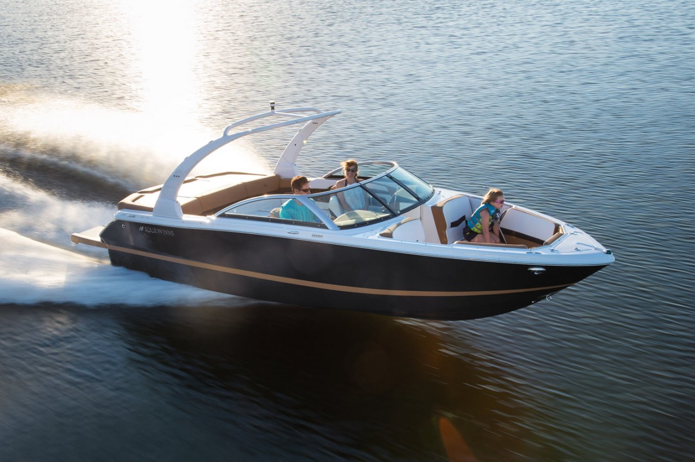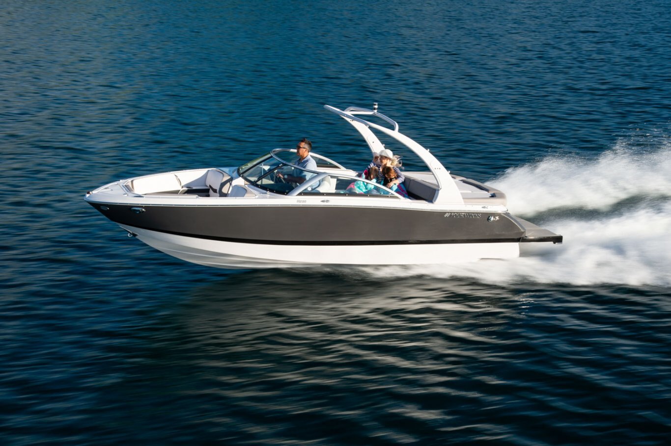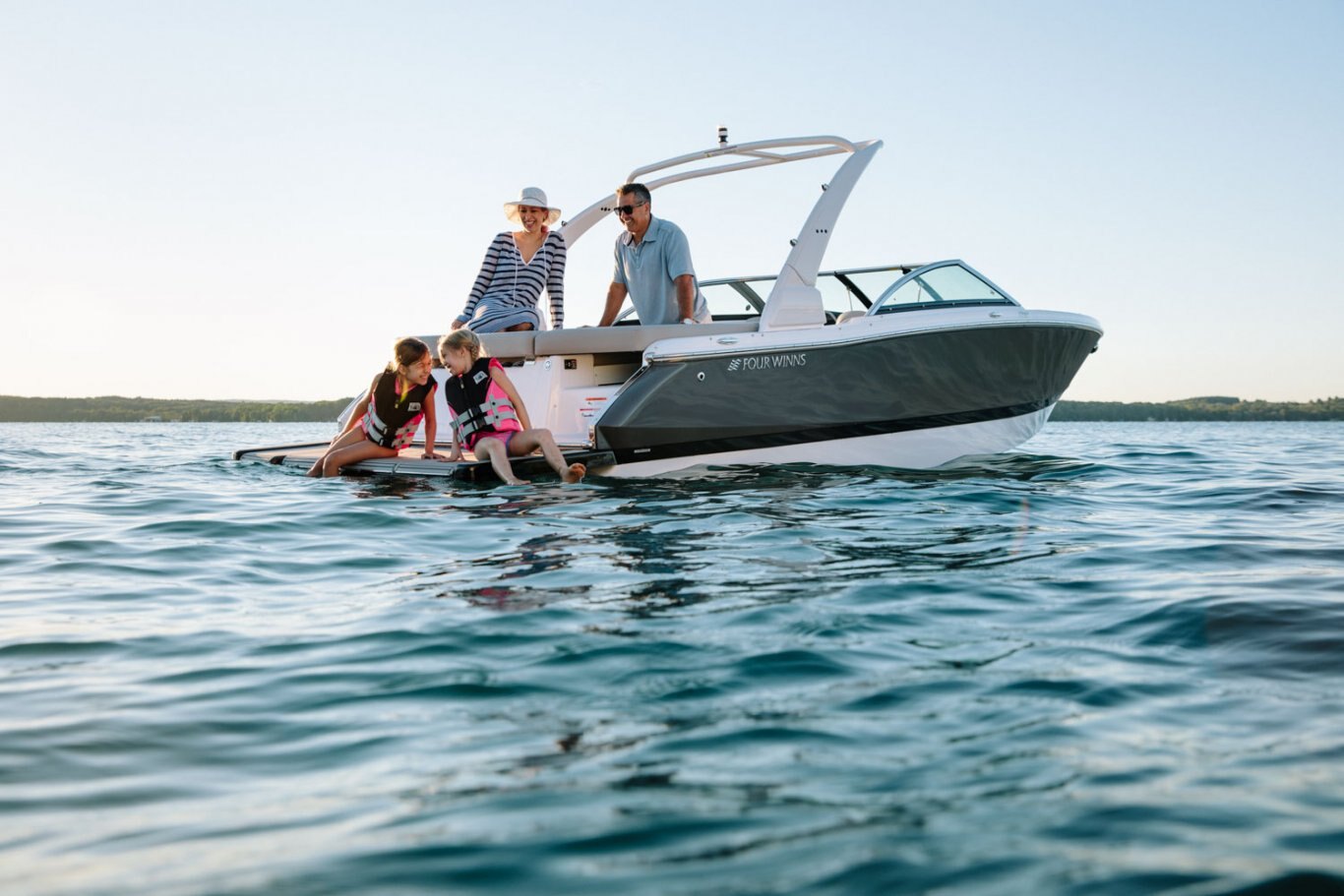 Four Winns® custom-matched trailer w/ brakes, tandem axle Jack-stand, heavy-duty Self-centering bunks Submersible lighting, LED Swing-away tongue |