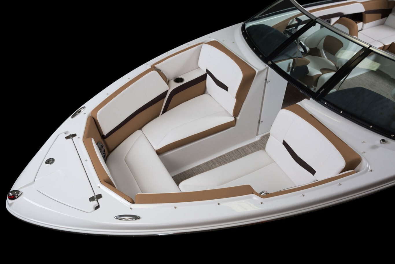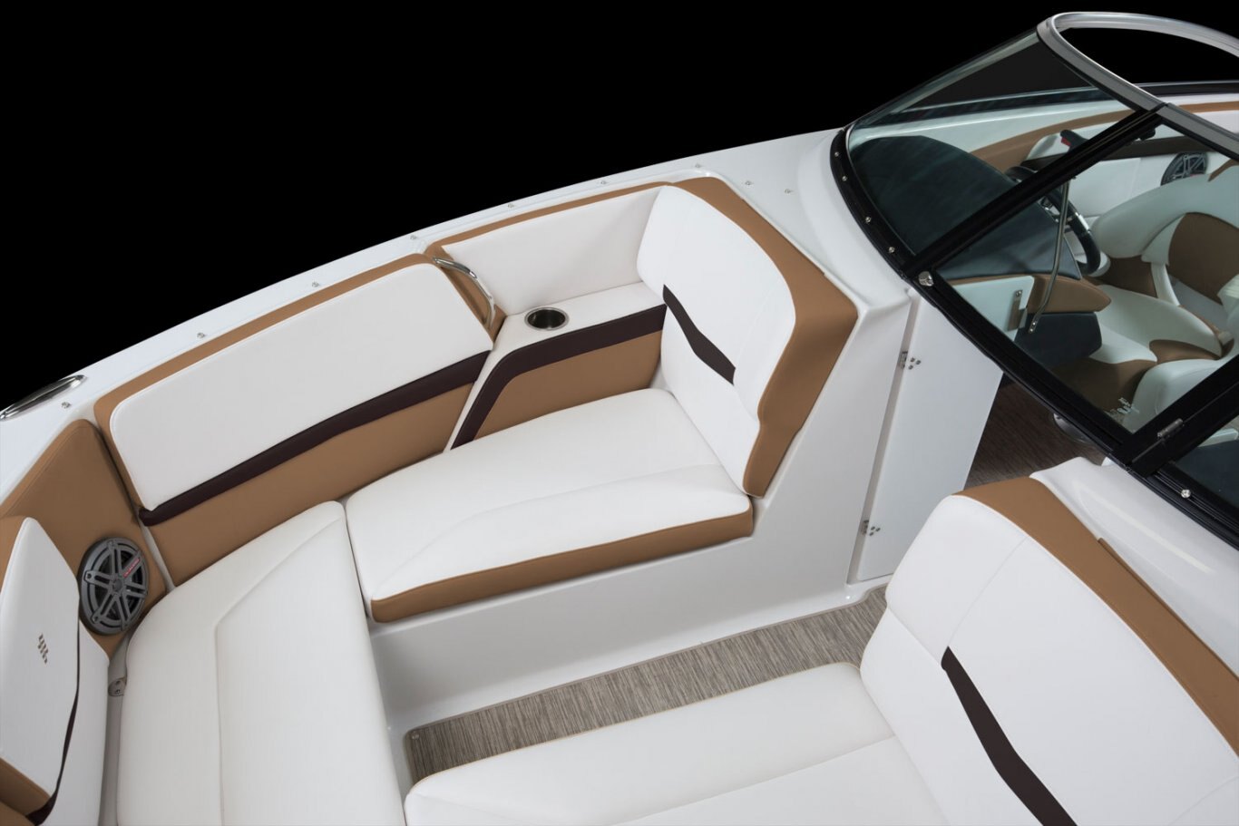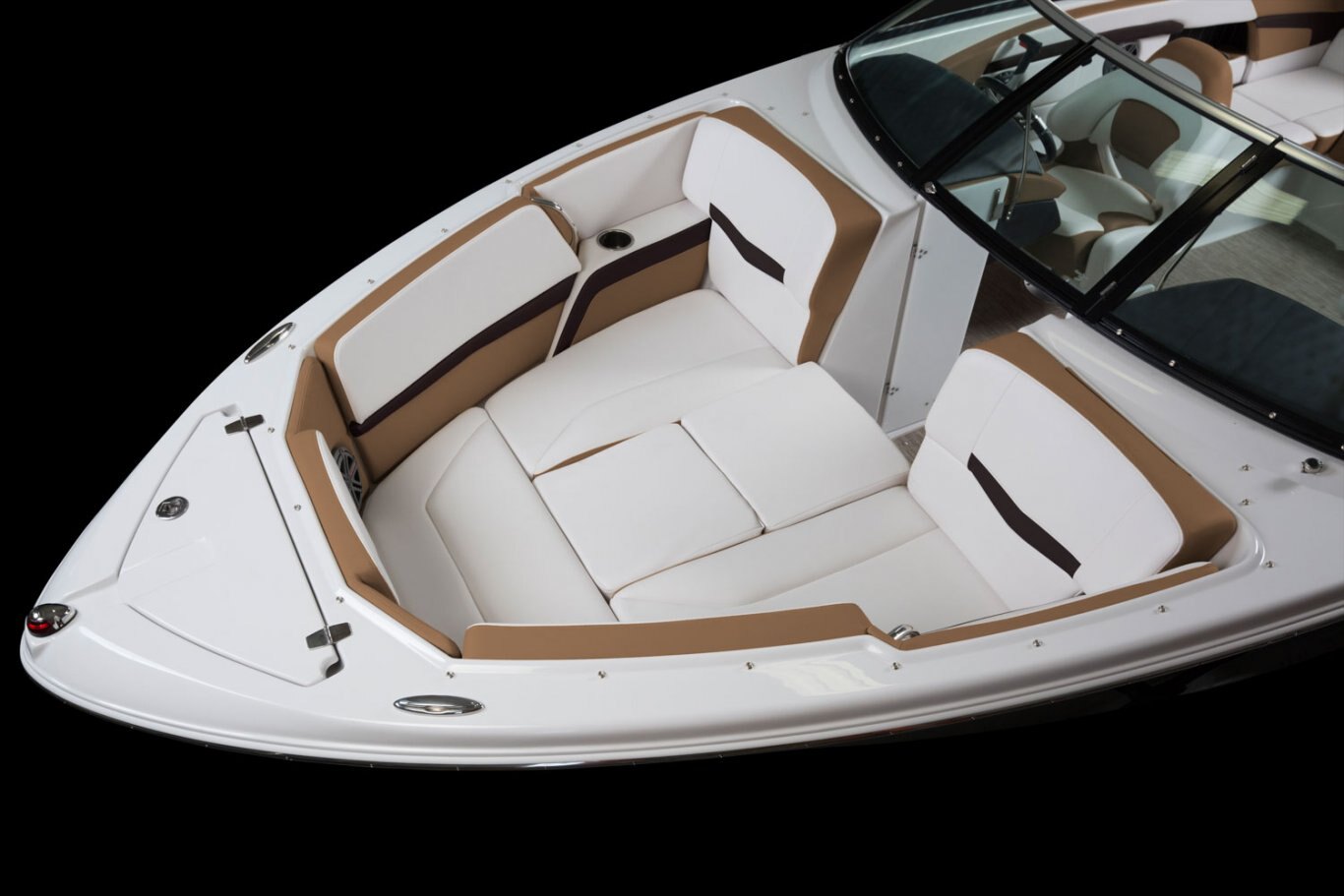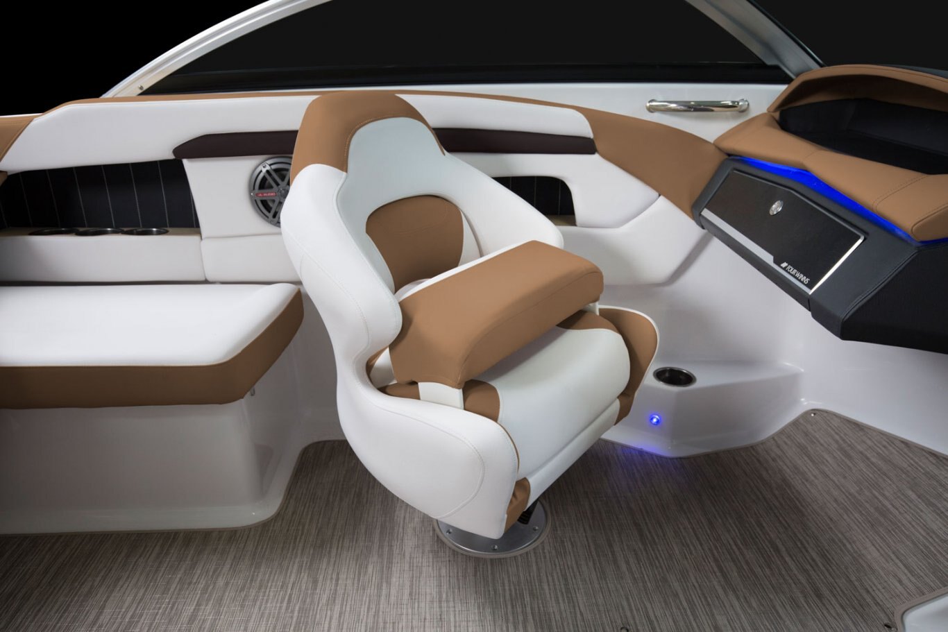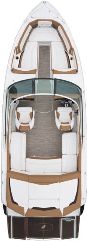 Assist handle(s), stainless steel Beverage holder(s), stainless steel Coaming pads w/ rich hand-fitted vinyl & comfort padding Cooler(s), built-in Courtesy lights Fiberglass liner, skid-resistant, self-draining Interior color scheme, choice of color Port console, glove box Seating, bow cushions, hinged Seating, cockpit, U-shaped Seating, ComfortRide, flip-up bucket bolster(s) Ski locker, in-floor, w/ gas-assist hinged lid & mat Storage, beneath sundeck, mesh-sided bags Storage, bow & cockpit, beneath seats Storage, bow, behind backrest at helm & passenger consoles Storage, cockpit, sidewall storage w/ beverage holders Sundeck, aft Sundeck, aft w/ chaise lounge & aft-facing lounge seat Upholstery, premium contoured vinyl w/ custom detailing Walk-thru transom Water intrusion management system |
