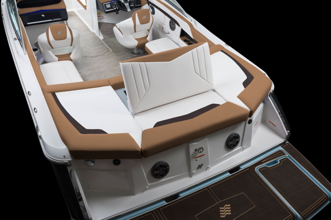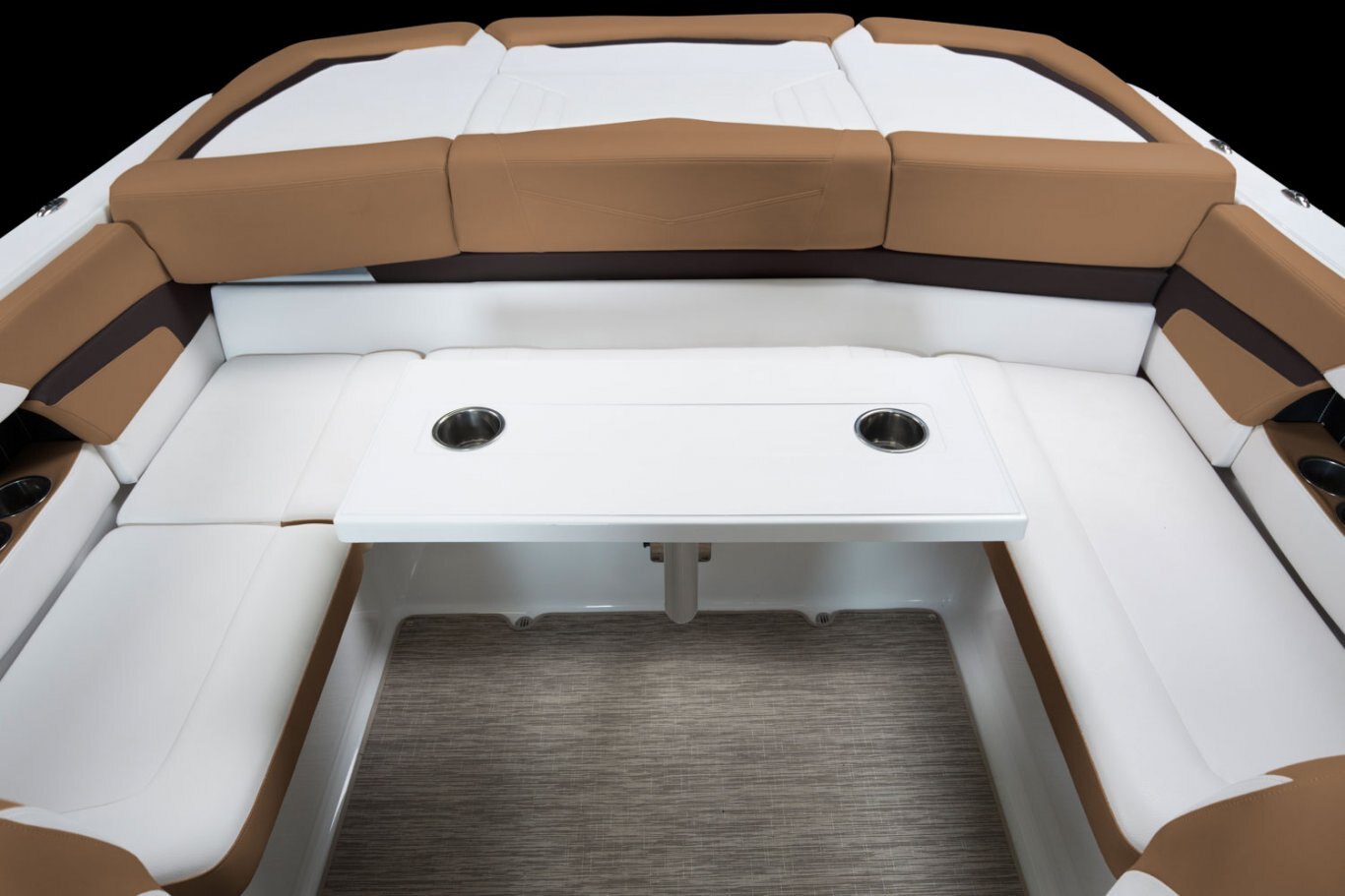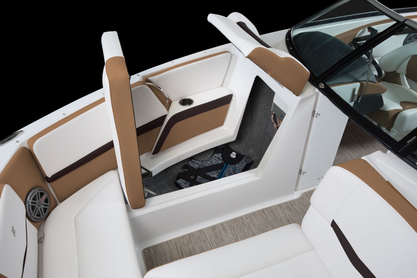 Assist handle(s), stainless steel Beverage holder(s), stainless steel Coaming pads w/ rich hand-fitted vinyl & comfort padding Cooler(s), built-in Courtesy lights Fiberglass liner, skid-resistant, self-draining Interior color scheme, choice of color Port console, glove box Seating, bow cushions, hinged Seating, cockpit, U-shaped Seating, ComfortRide, flip-up bucket bolster(s) Ski locker, in-floor, w/ gas-assist hinged lid & mat Storage, beneath sundeck, mesh-sided bags Storage, bow & cockpit, beneath seats Storage, bow, behind backrest at helm & passenger consoles Storage, cockpit, sidewall storage w/ beverage holders Sundeck, aft Sundeck, aft w/ chaise lounge & aft-facing lounge seat Upholstery, premium contoured vinyl w/ custom detailing Walk-thru transom Water intrusion management system |