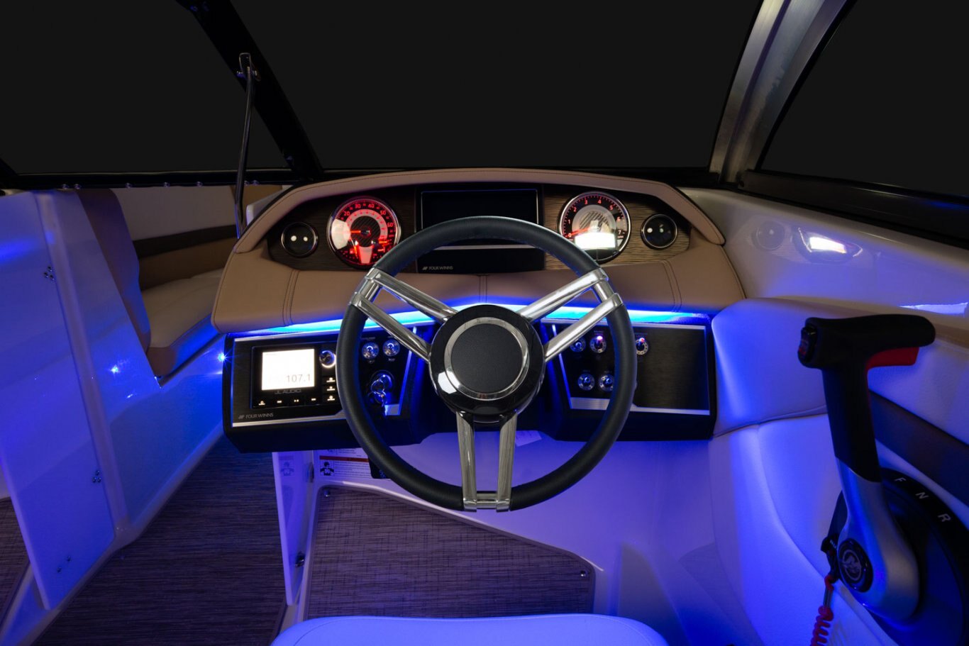 Custom gauges, fog-resistant Dash, rich hand-wrapped vinyl, w/ custom detailing & LED accent lighting Emergency engine shut-off Instrumentation, helm: multifunction digital gauges w/hour meter & GPS speed Lighted switches, LED Steering wheel, deluxe, tilt