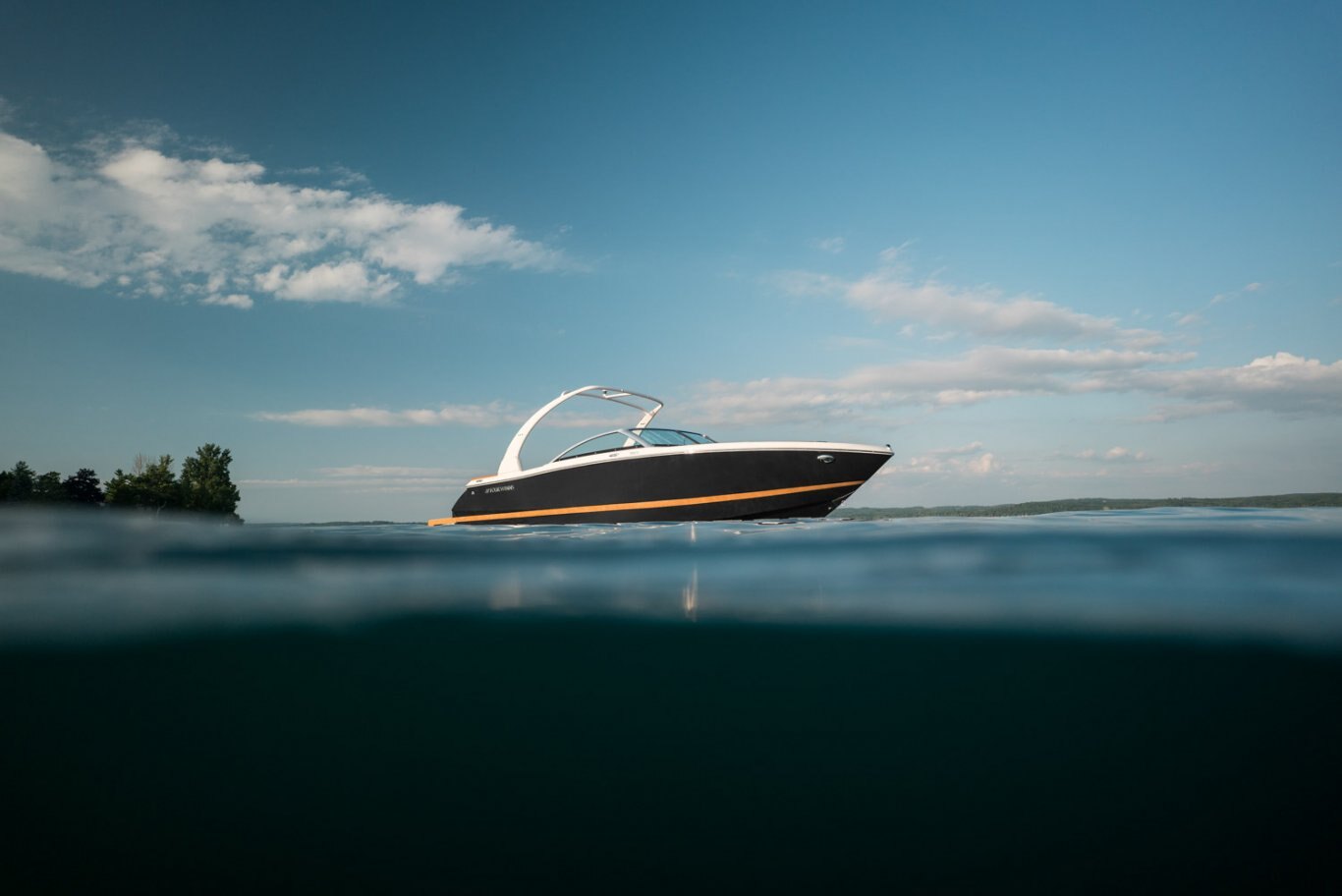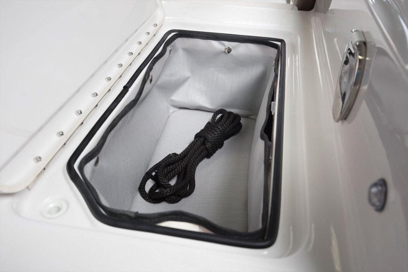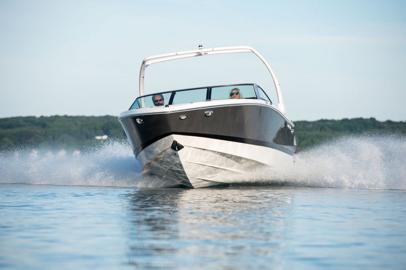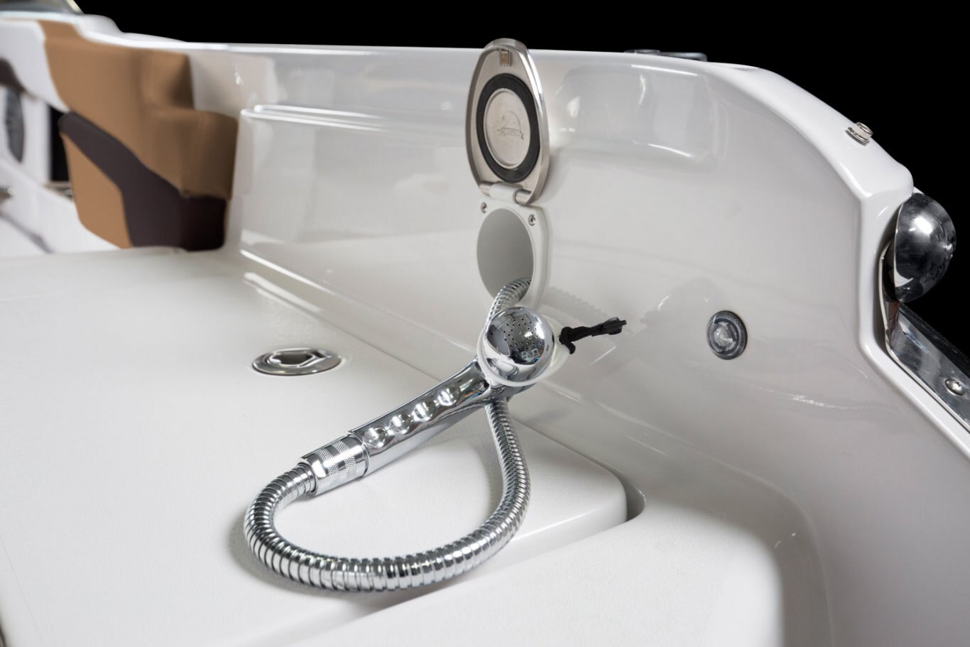 Anchor locker w/ lid, latch & tie off Bow & stern eyes, stainless steel Cleats, fixed, stainless steel Exterior color choices Exterior color scheme, choice of color Exterior gel accent stripe, choice of color Fiberglass stringer system Horn Ladder, stern, angled, deep-reach, hidden w/ wide steps Meets applicable USCG & Canadian regs; NMMA certified using ABYC stds. Navigation lights, LED Rub rail w/ stainless steel insert Stable-Vee® hull Swim platform, stern Thru-hull fittings, stainless steel Windshield w/walk-thru, full-height, curved glass, exclusive design Winning edge owner protection plan |