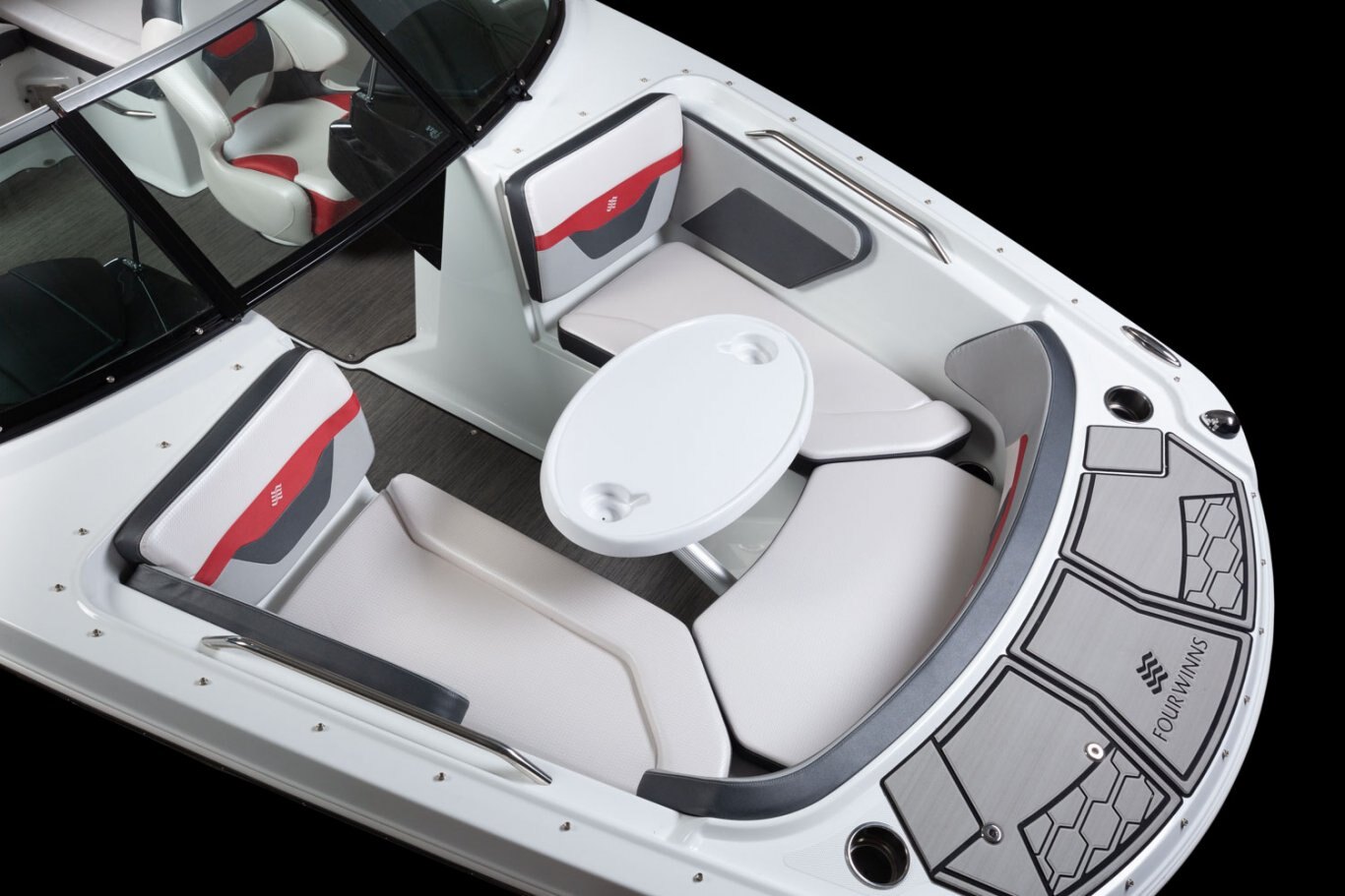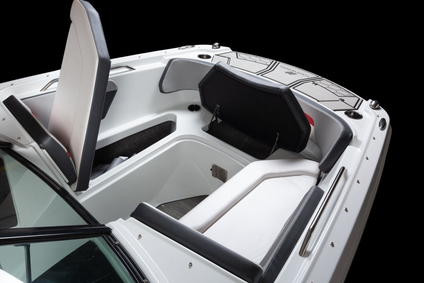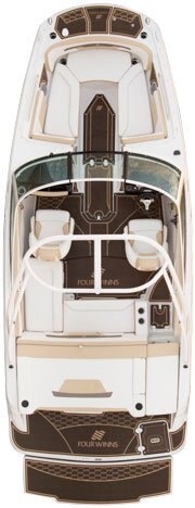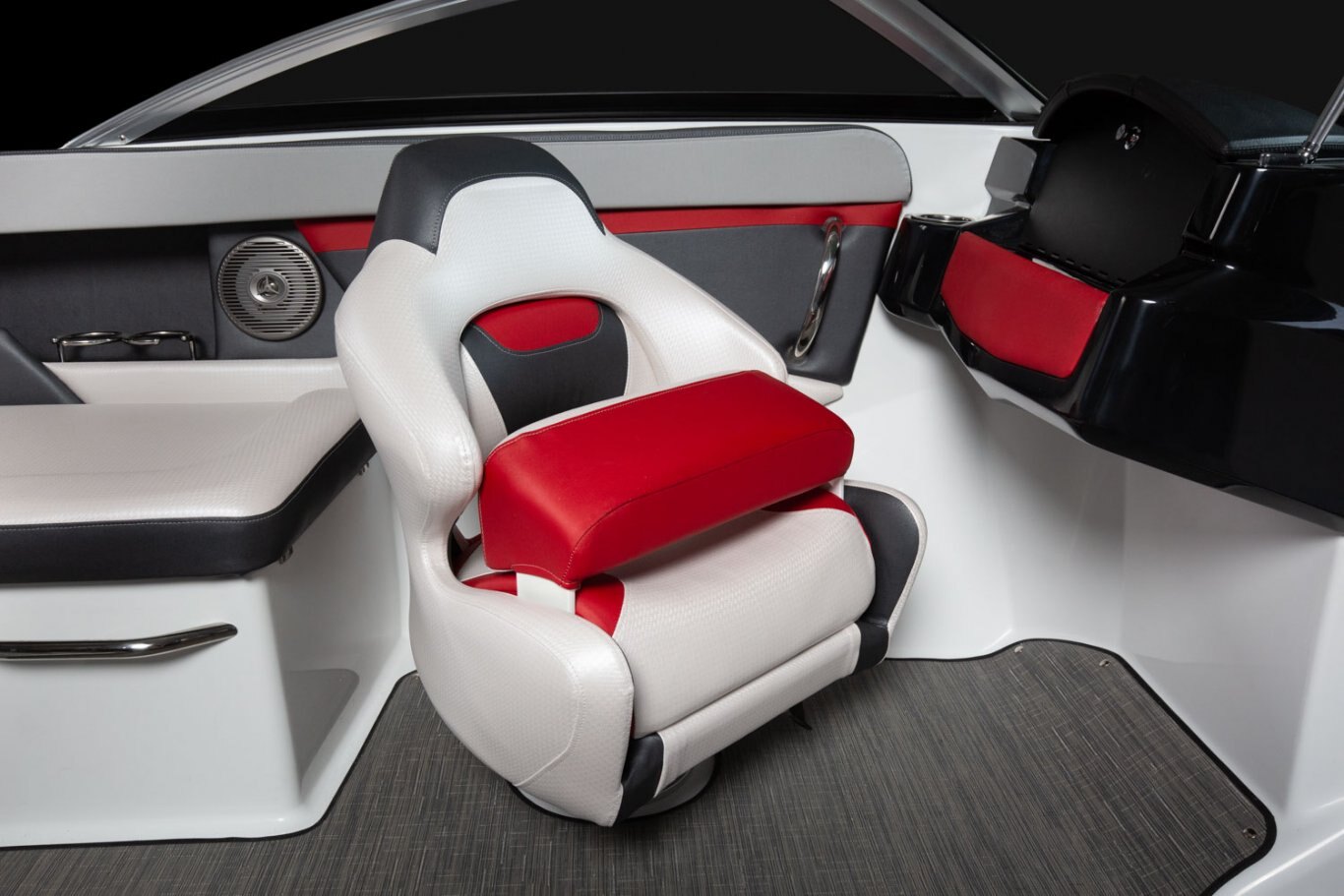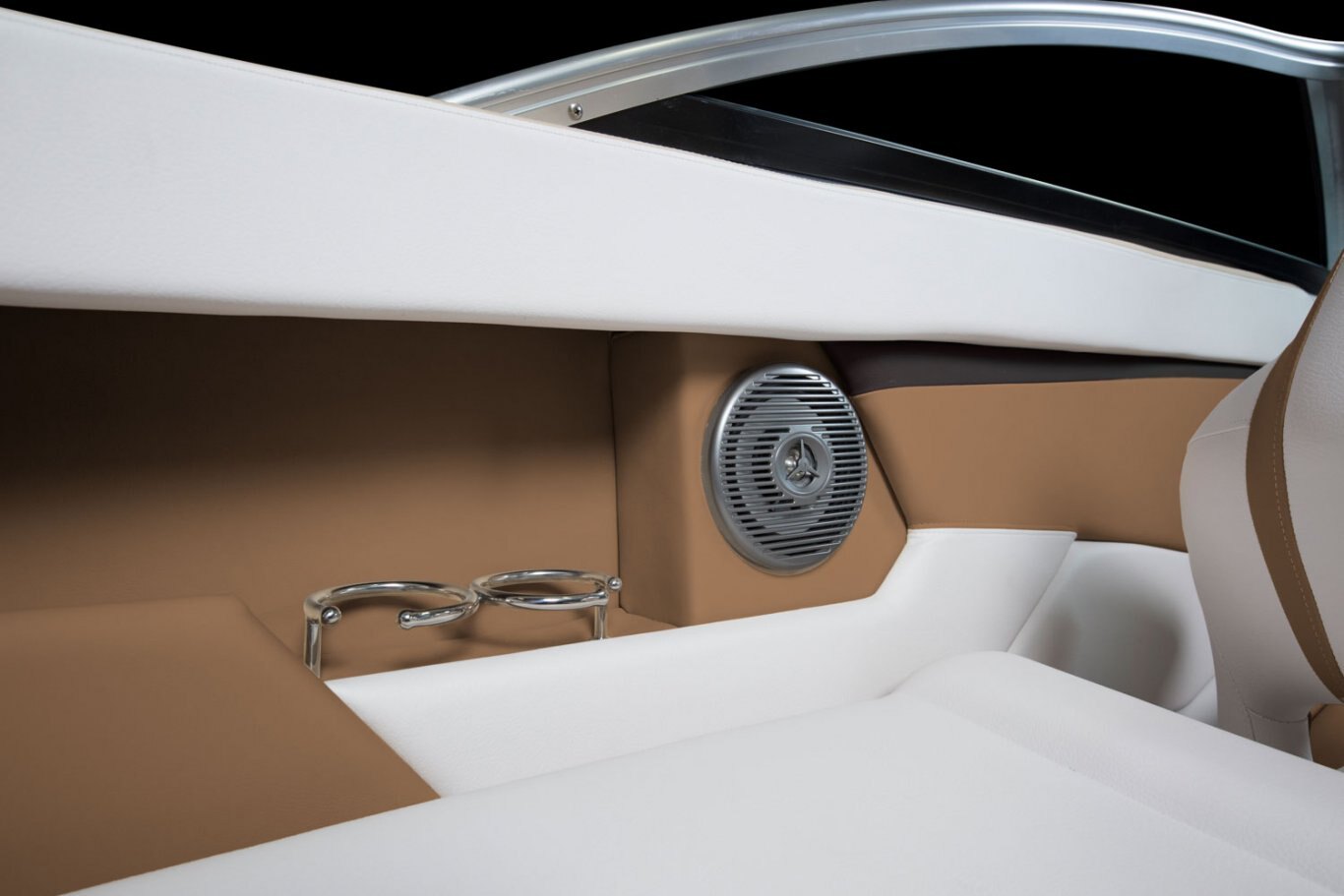 Assist handle(s), stainless steel Beverage holder(s), stainless steel Coaming pads w/ rich hand-fitted vinyl & comfort padding Cooler, carry-on Courtesy lights Fiberglass liner, skid-resistant, self-draining Interior color scheme, choice of color Port console, glove box Seating, bow cushions, hinged Seating, cockpit, U-shaped Seating, ComfortRide, flip-up bucket bolster(s) Storage locker, in-floor, w/ gas-assist hinged lid & mat Storage, anchor, under center bow seat w/ tie off Storage, bow & cockpit, beneath seats Storage, cockpit, sidewall storage w/ beverage holders Sundeck, aft w/ chaise lounge Upholstery, premium contoured vinyl w/ custom detailing Walk-thru transom Water intrusion management system |