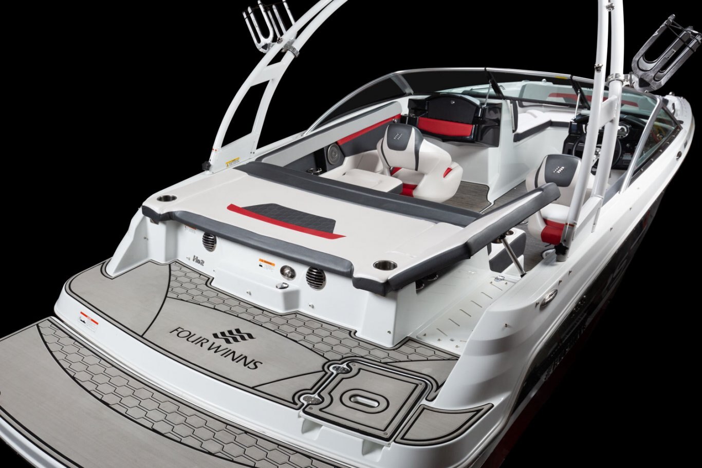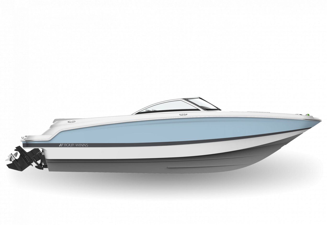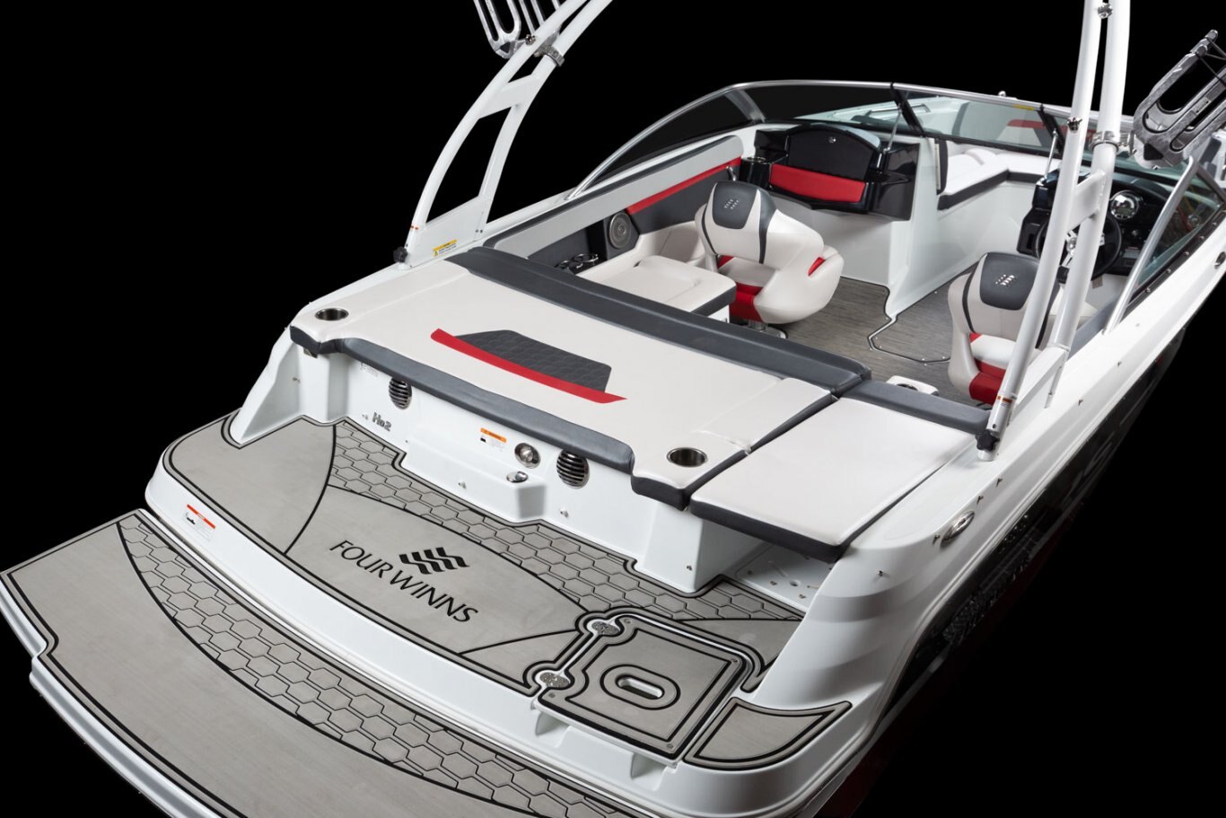 Bow & stern eyes, stainless steel Bow rails, stainless steel Cleats, fixed, stainless steel Exterior accent stripe, choice of color Exterior color choices Exterior color scheme, choice of color Fiberglass stringer system Horn Ladder, stern, hidden, telescoping Meets applicable USCG & Canadian regs; NMMA certified using ABYC stds. Navigation lights, LED Rub rail w/ stainless steel insert Stable-Vee® hull Swim platform, bow Swim platform, stern Thru-hull fittings, stainless steel Windshield w/walk-thru, full-height, curved glass, exclusive design Winning edge owner protection plan |